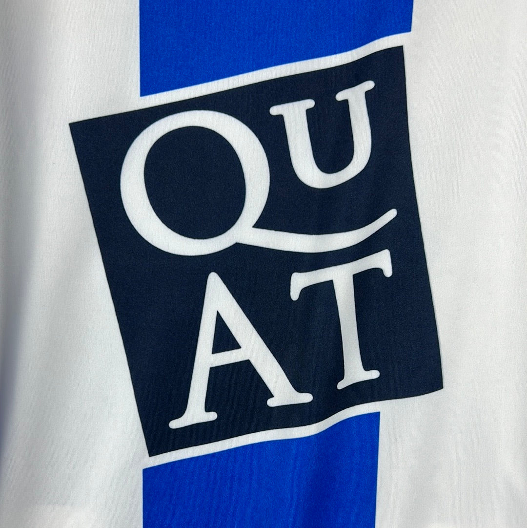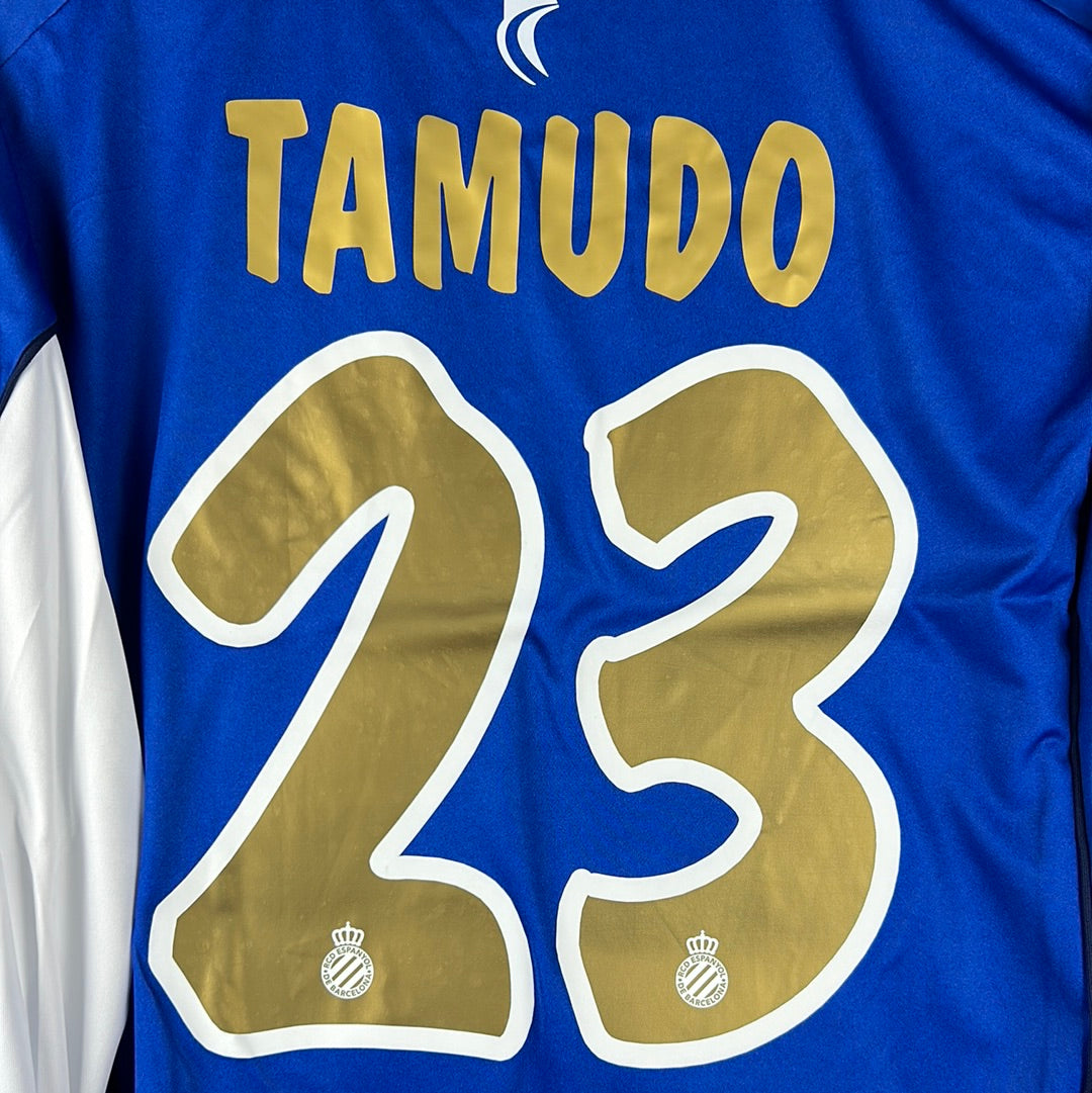Shirt info: The 2007-2008 Espanyol home shirt worn during the La Liga season. This specific shirt was player issued to Tamudo for the away match vs Real Madrid on 8/3/2008 which they lost 3-1. The shirt features the blue and white vertical stripes of Espanyol. It also has a felt Espanyol badge, while the Ulhsport logo is in the material, and the 'QAUT' sponsor is printed. The La Liga 'LFP' sleeve patch is sewn on. 'Tamudo 23' is printed on the back in gold plastic flock. This is a long-sleeve football shirt.