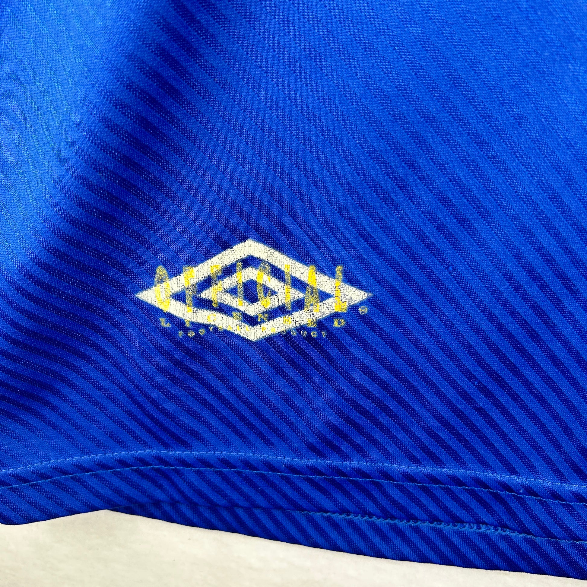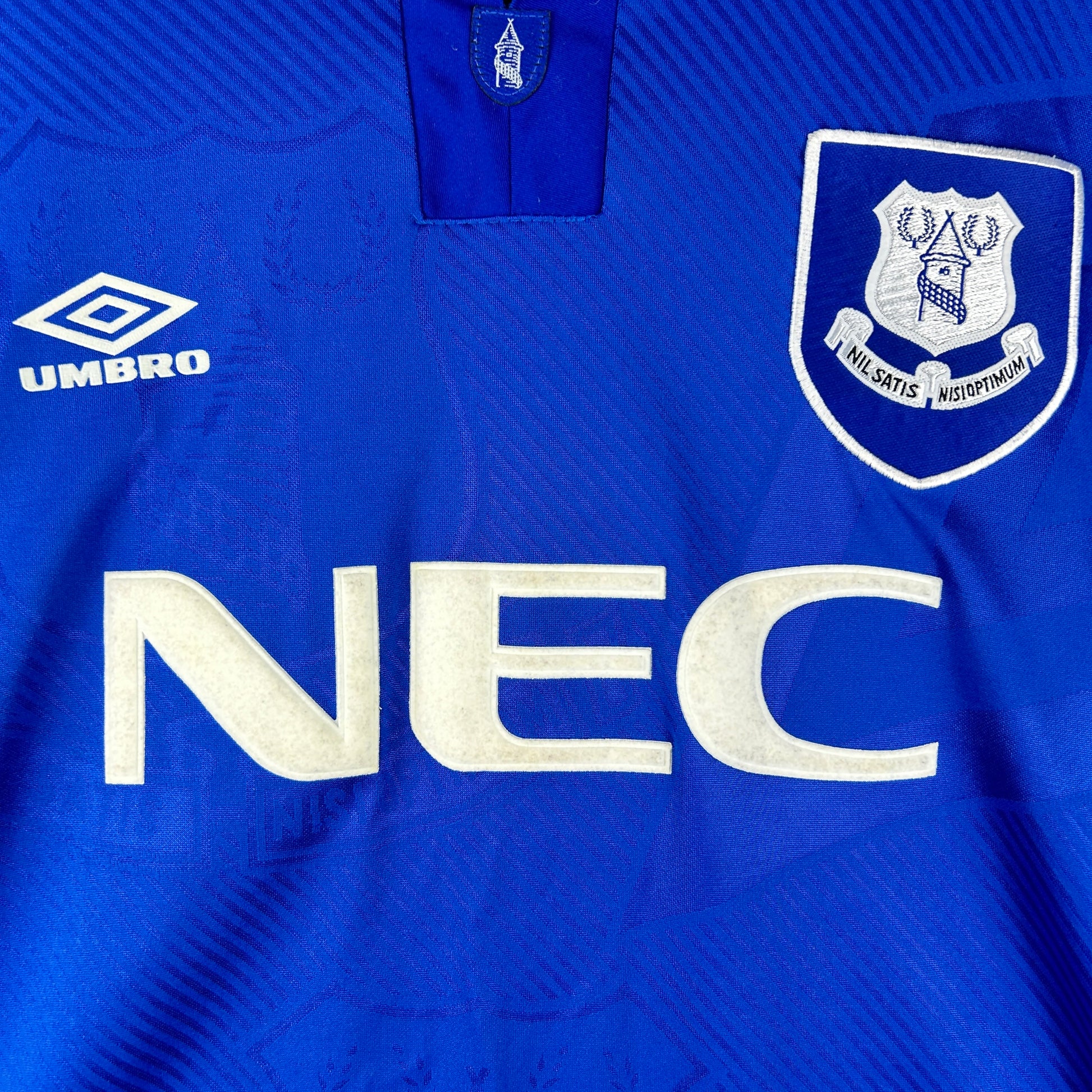 Shirt info: A great Everton home shirt with front NEC sponsor. This was made by Umbro and has the Everton badge incorporated in the material on the front of the shirt.