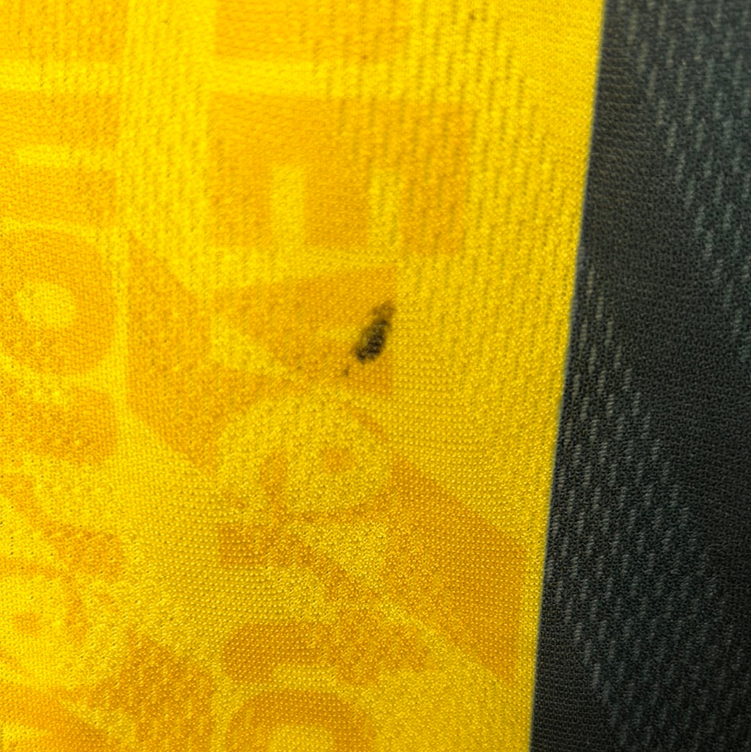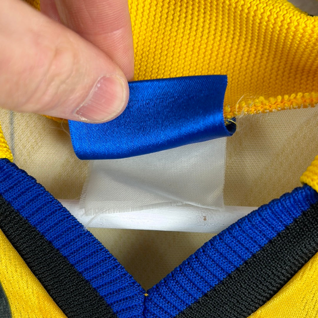 Shirt info: The Everton away shirt from 1996/1997 and the 1997/1998 season. The yellow and dark blue is a classic look for Everton in the 1990s. The Danka sponsor and Umbro are in the material design. The badge is added.