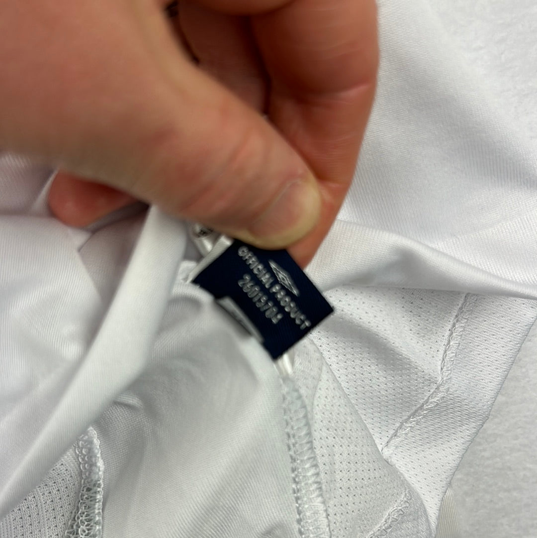 Player Issue Details: Umbro shirt with player-issued lettering and numbers. It has the Europa League patch on one sleeve and the match embroidery on the shirt. This is correct for a player-issued shirt for this match. The sleeve has additional taping down the sleeve, correct for a player-issue shirt.