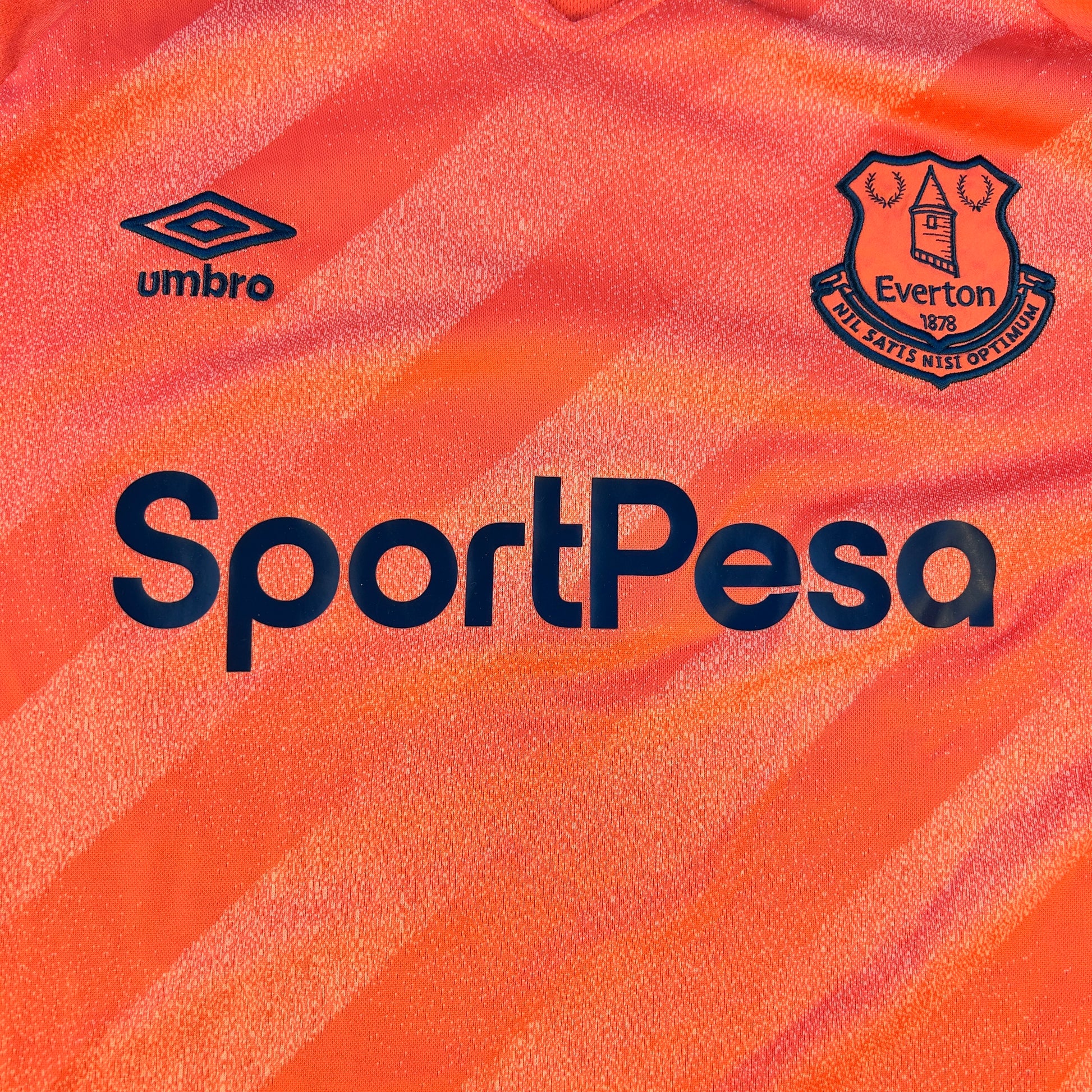 Shirt info: Striking and underrated — the Everton 2018/19 away shirt by Umbro features a bold coral pink base with subtle diagonal patterns and tonal detailing. Finished with a dark navy trim and the instantly recognizable SportPesa sponsor, this is a true standout among the club’s modern away kits. A great piece for collectors or anyone looking for something different in their football shirt lineup.