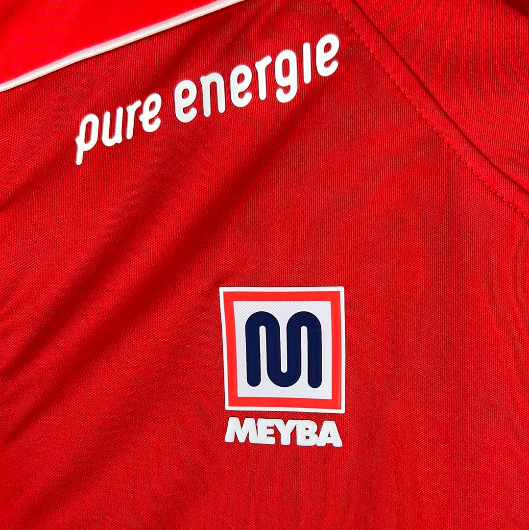 Shirt info: The FC Twente home shirt worn in the 2020-2021 season. This red shirt features a pattern on the upper side of the sleeves. The FC Twente badge and the Meyba logo are embroidered. The white 'Pure Energie' sponsor is printed with another 'Pure Energie' logo on the right shoulder and on the reverse.