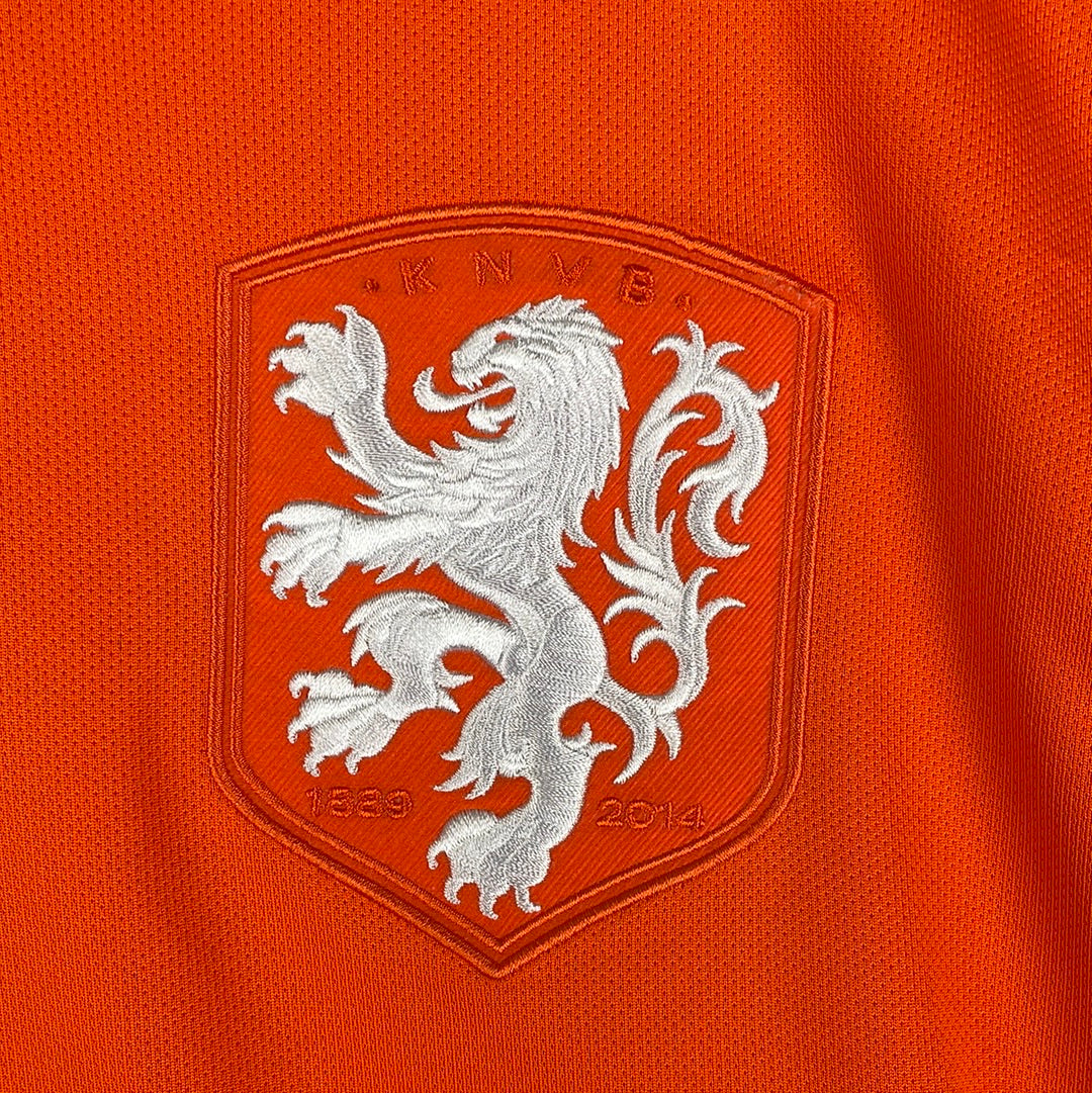 Shirt info: The Holland home shirt for the 2014 season. This is the usual bright orange colour with a simple and standard design from Nike. The inside neck carries the colour of the Dutch flat and there is also a printed crown.