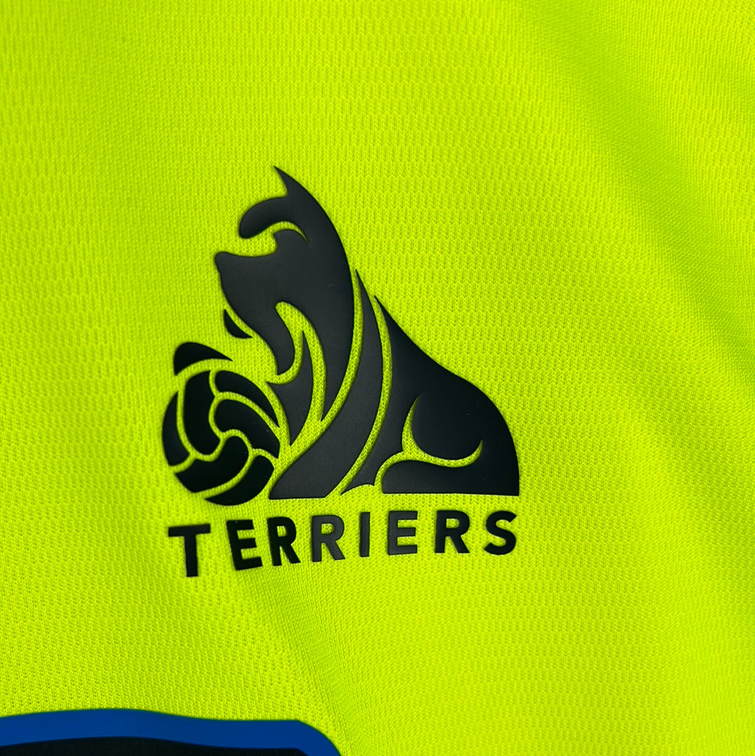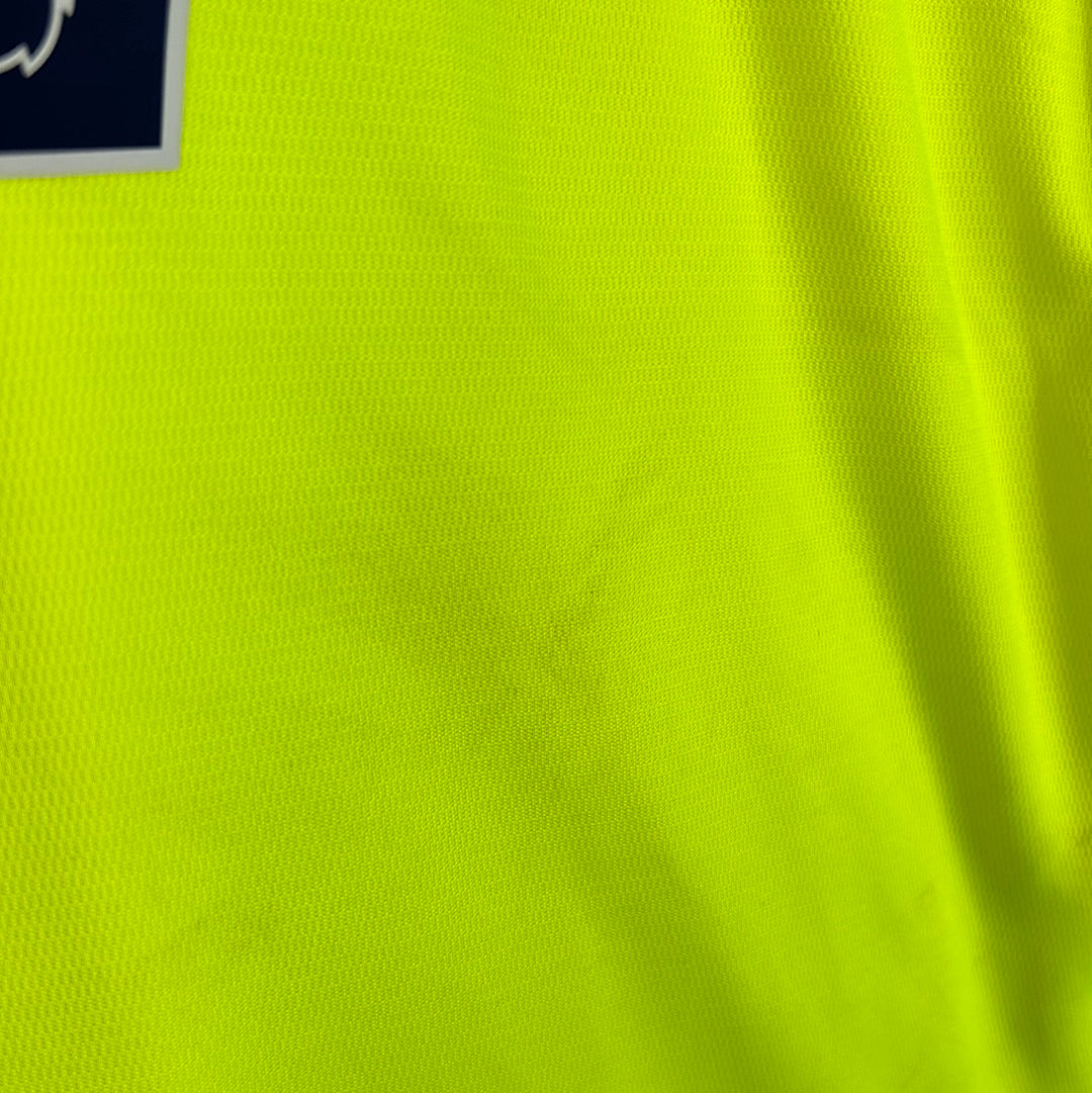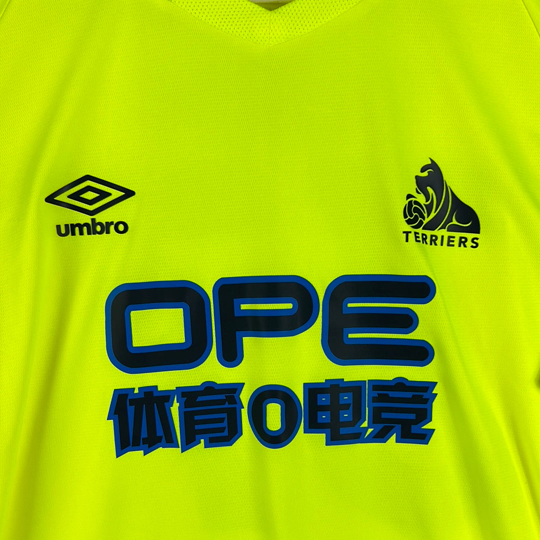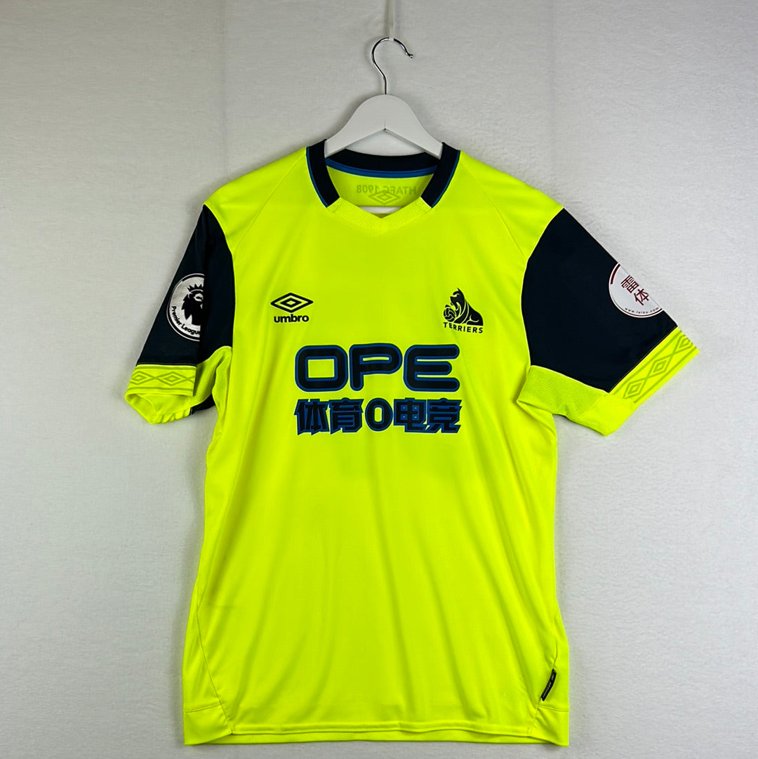 Shirt info: The OPE sponsored Huddersfield home shirt in the 18/19 season in the Premier League. This is a bold fluorescent yellow shirt with black printed detailing.