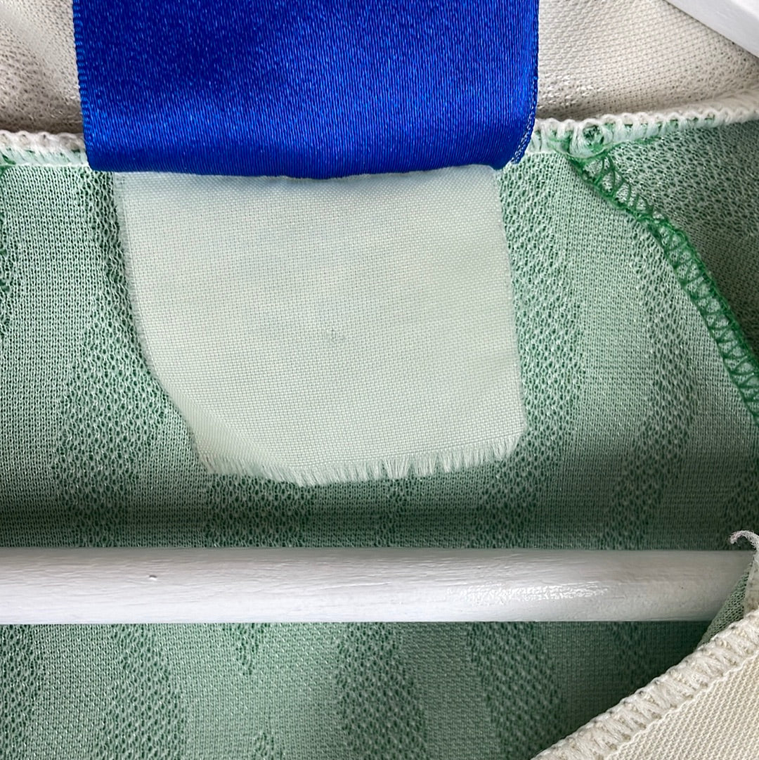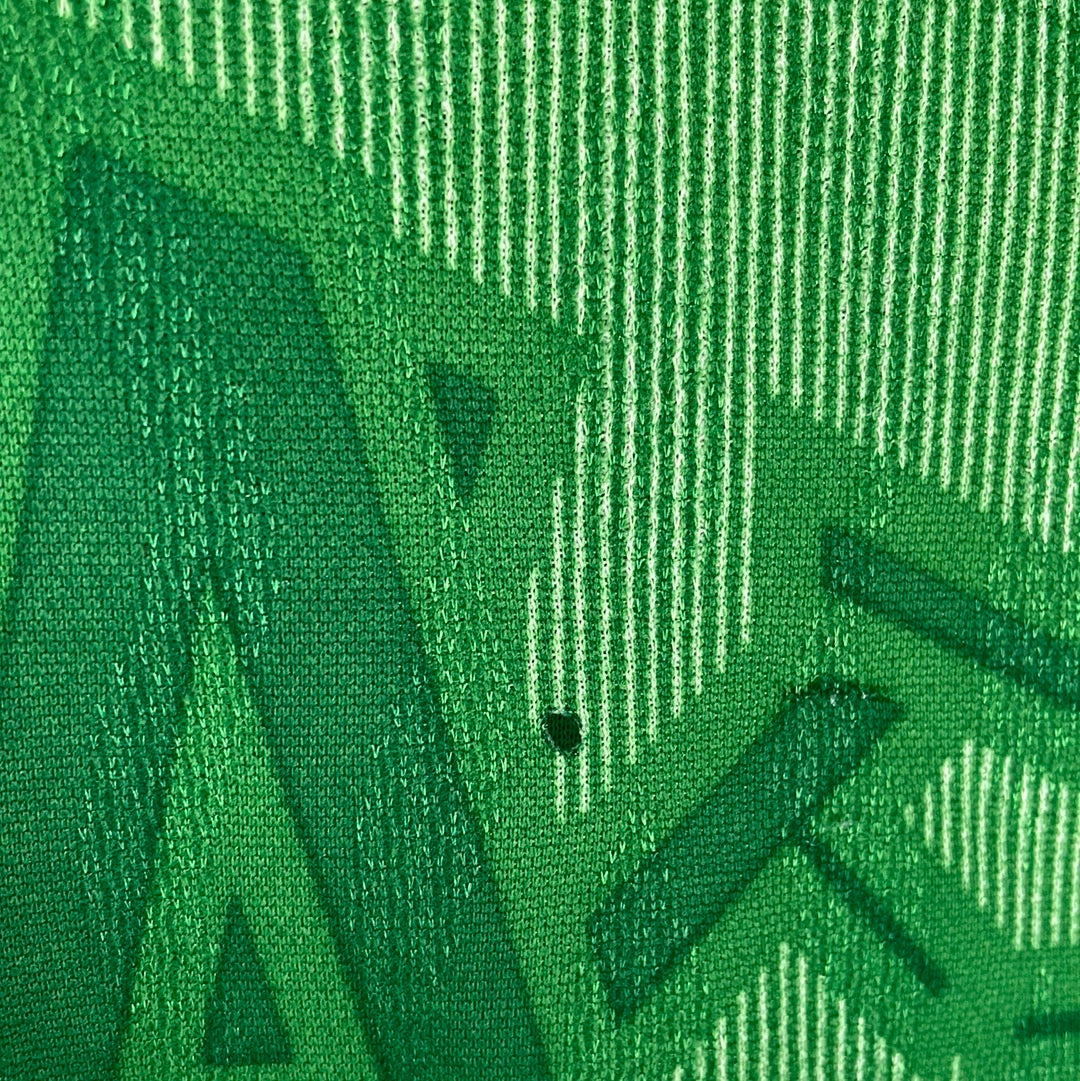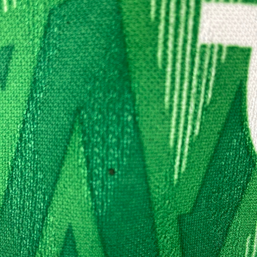 Shirt info: A green home shirt for Ireland in 1996 and 1997. This has a funky pattern to the front and OPEL sponsorship. The shirt has all the details in the material apart from the FAI badge which is embroidered.