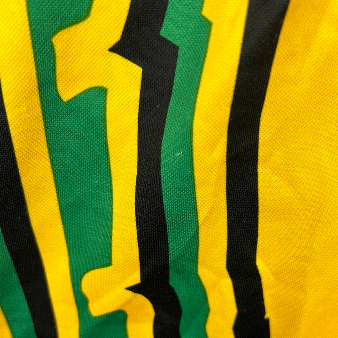 One of the standout features of this shirt was its bold and lively design, which included graphical elements or patterns that embodied the spirit of Jamaica. This design approach was in line with the 90s trend of more adventurous and graphic-intensive football kits.