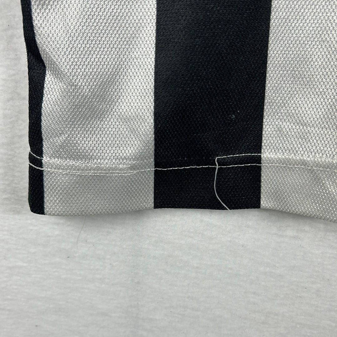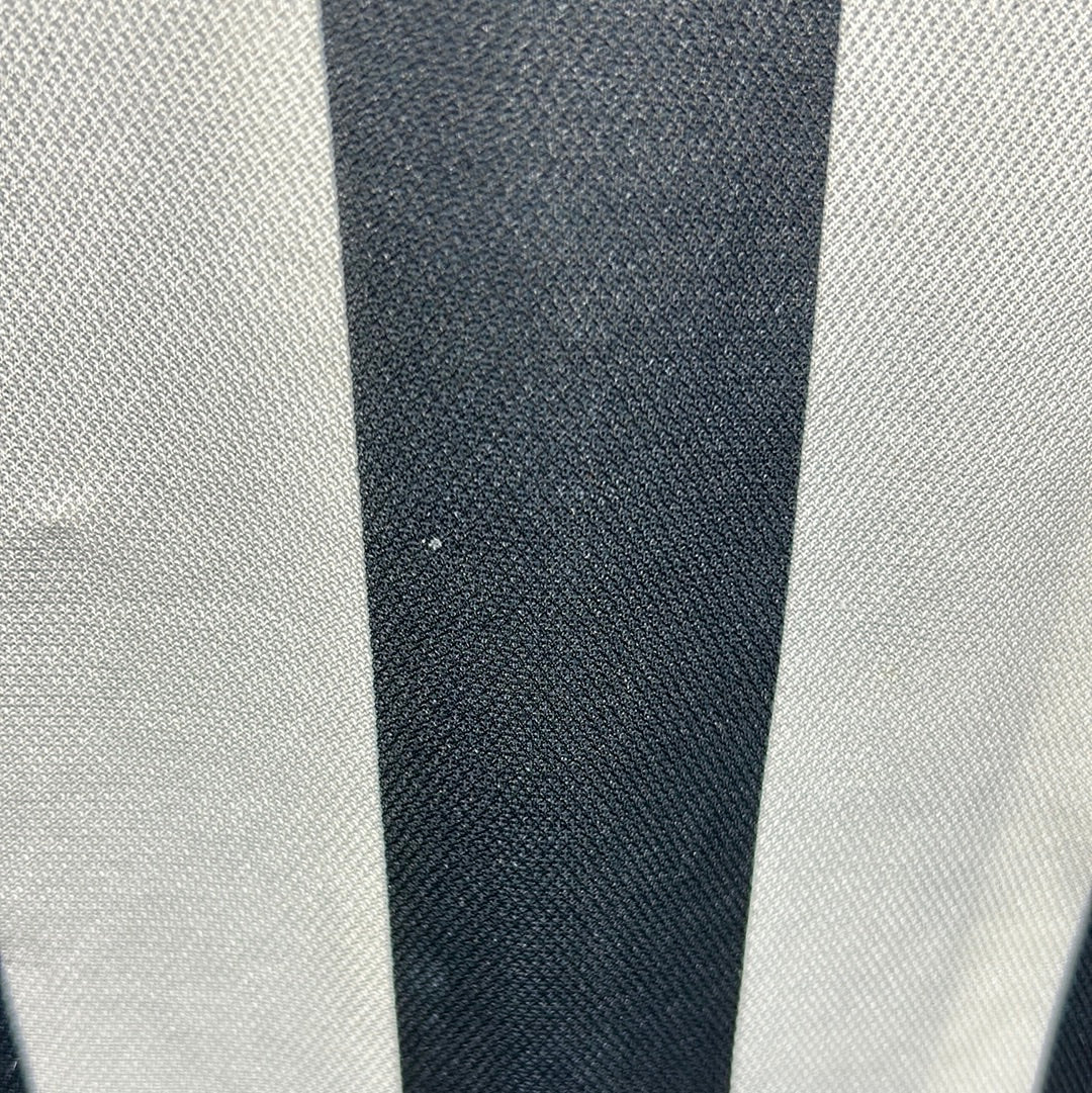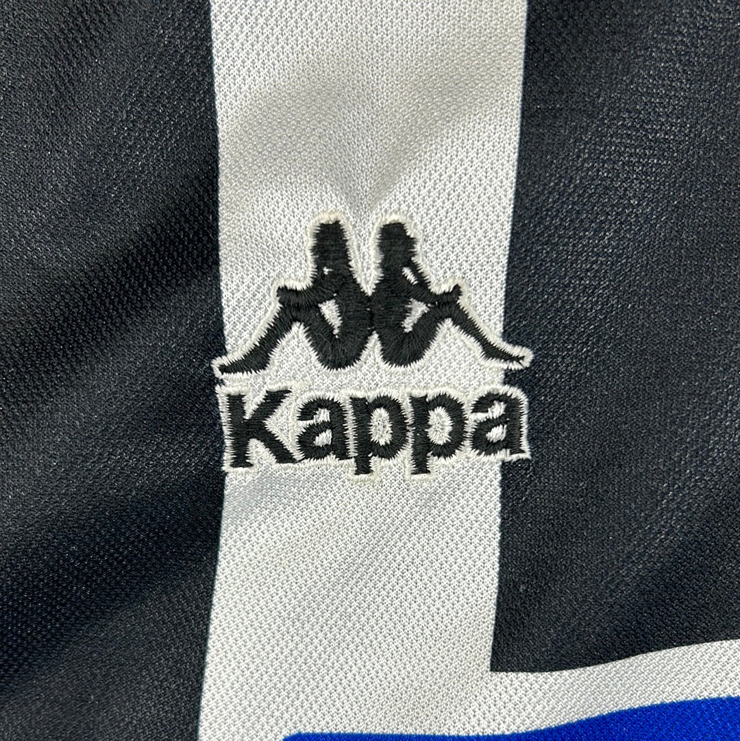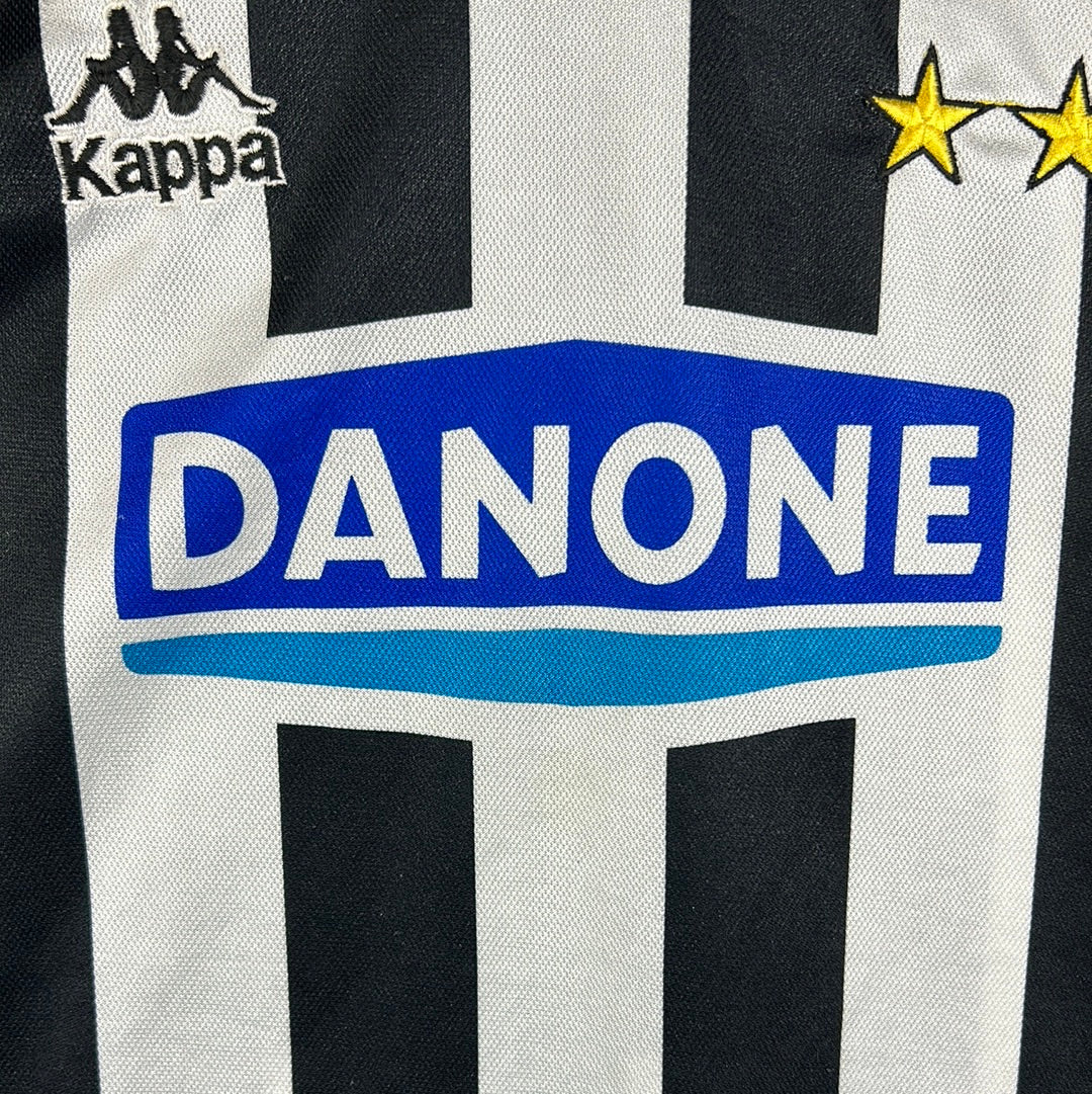 Shirt info: The 1994-1995 Juventus home shirt. This is a 1990s classic for Juventus and football shirt fans alike. The shirt features thin black and white stripes, the famous Danone's sponsor which has been sublimated into the shirt material alongside the 2-star badge and Kappa logo.