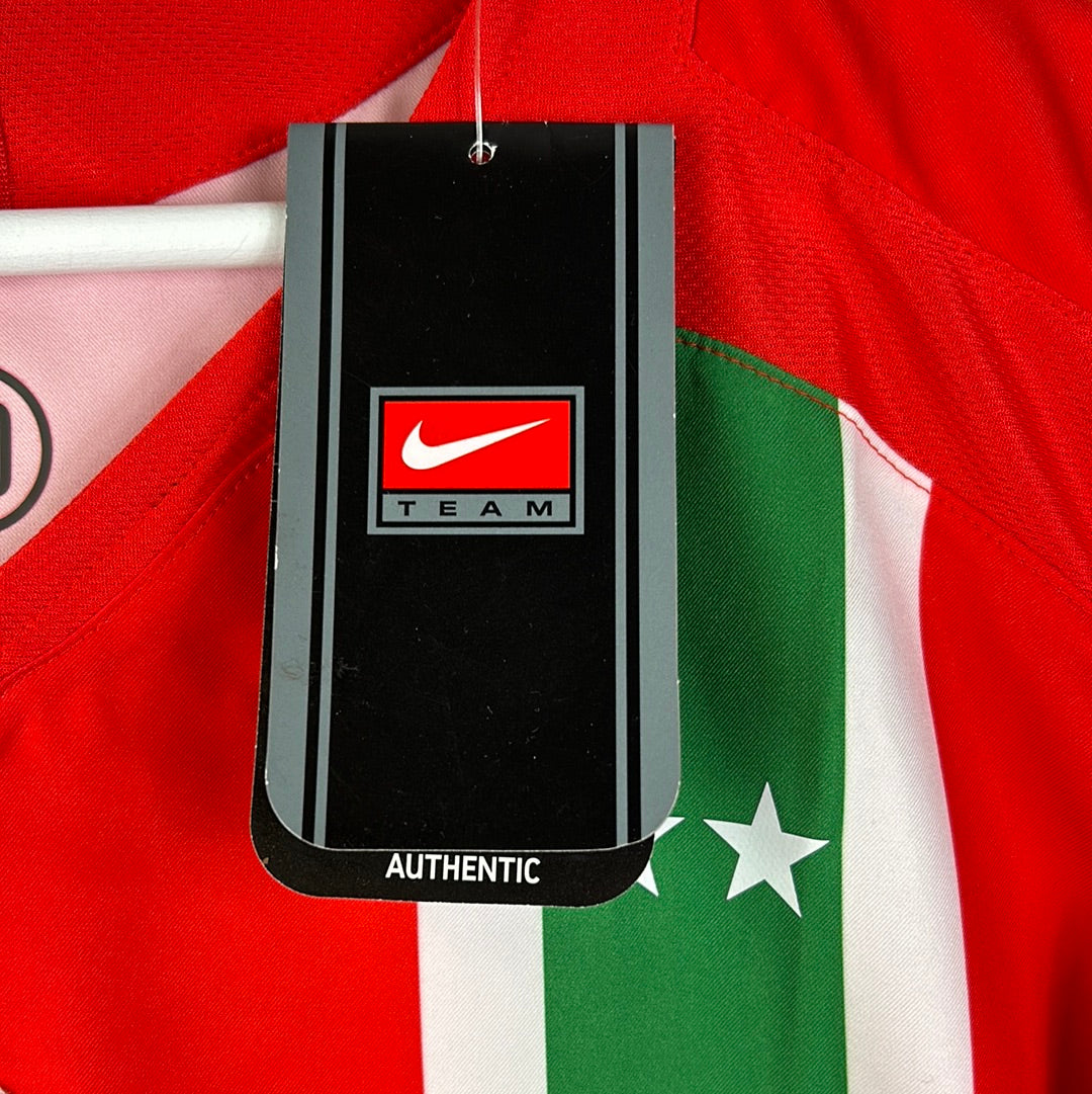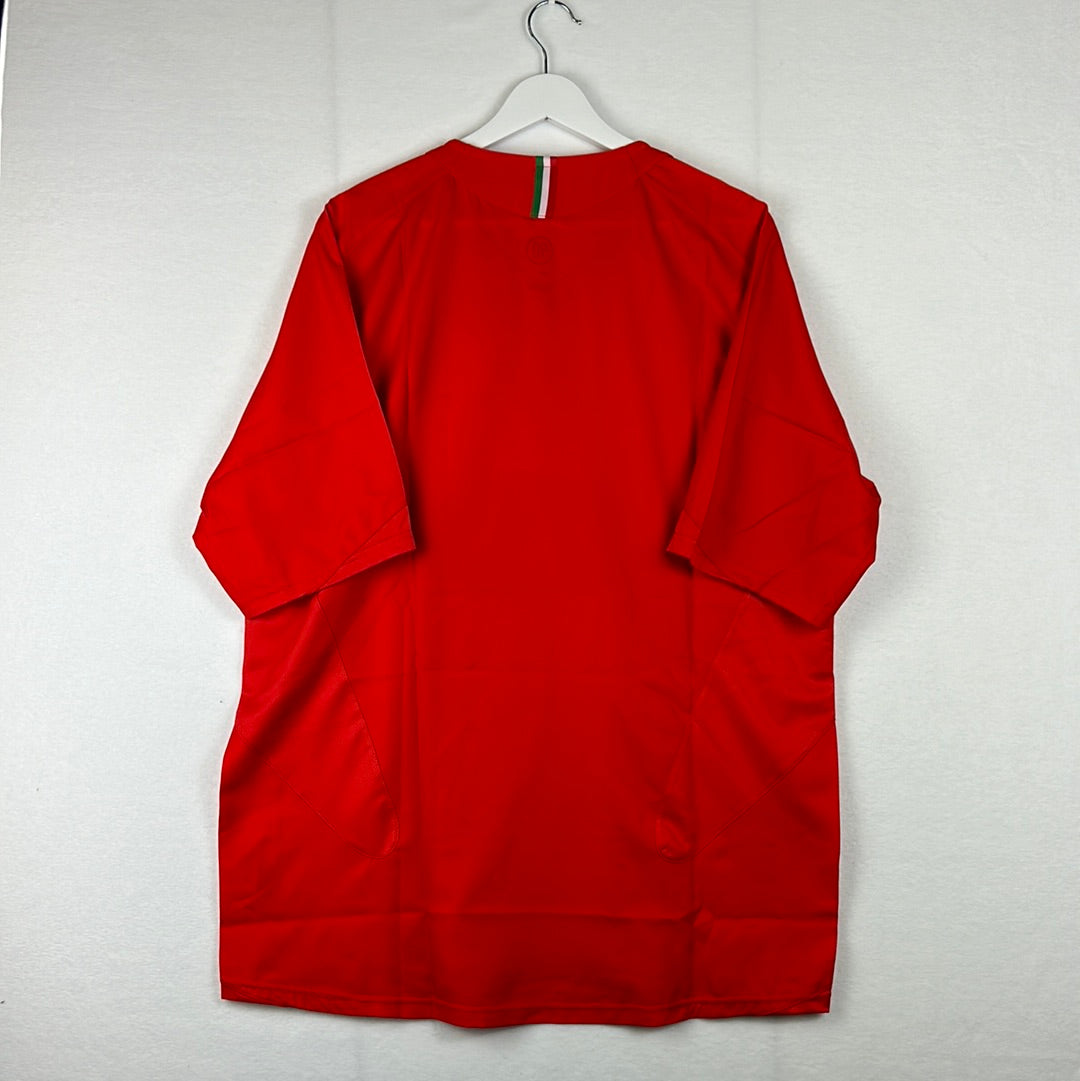 Shirt info: The Juventus 2006/2007 away shirt was also used in 2007/2008 as the third shirt. This is a shirt that stands out in Juventus's shirt history. A red shirt with white and green stripes. The shirt has a print around the badge celebrating 100 years since Juve's first Scudetto.