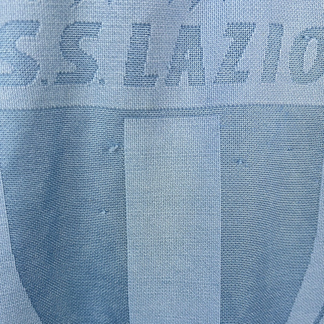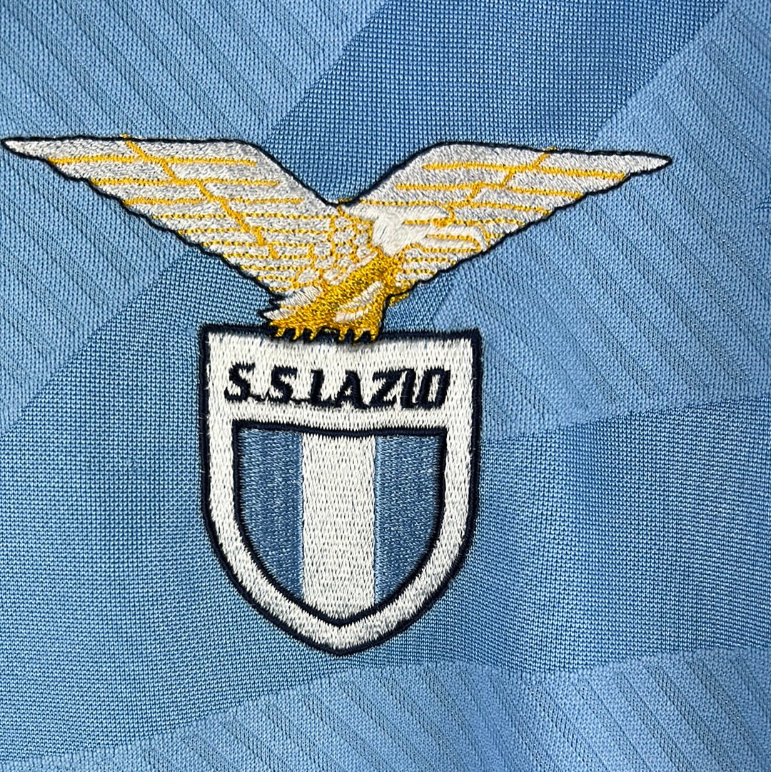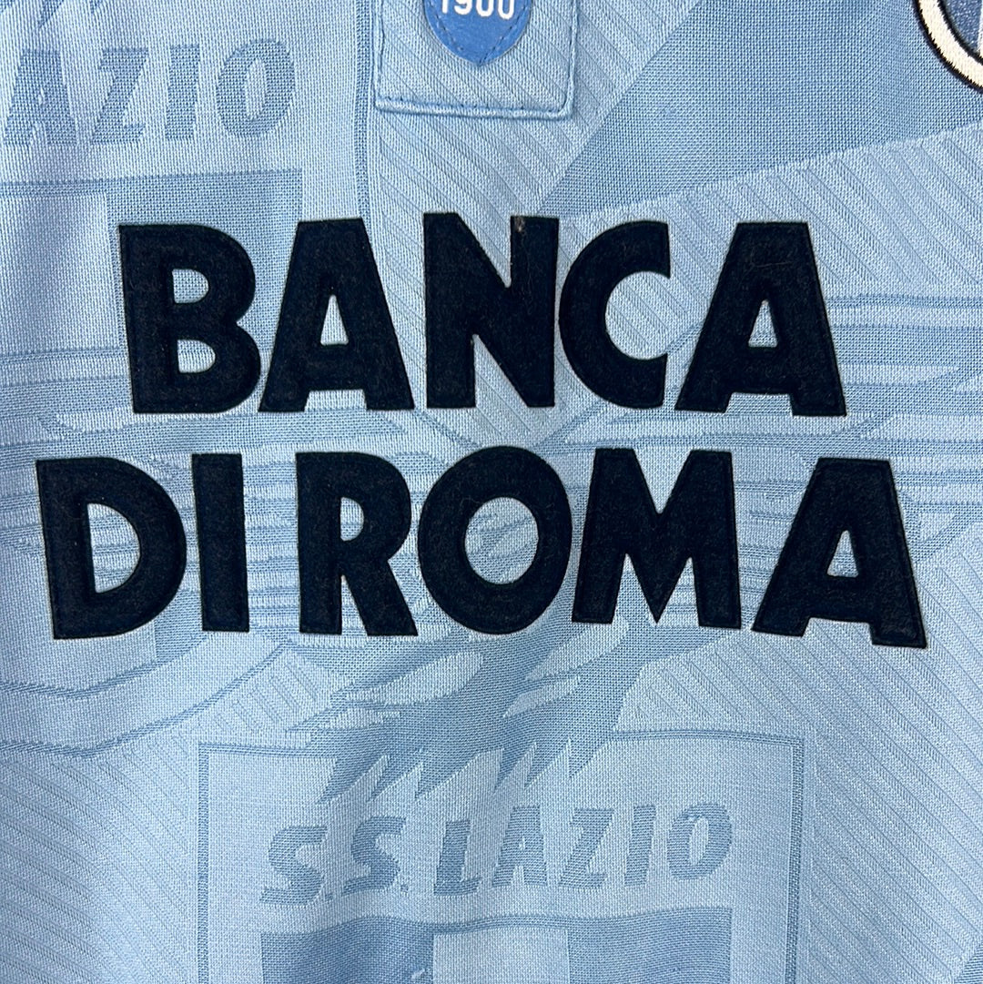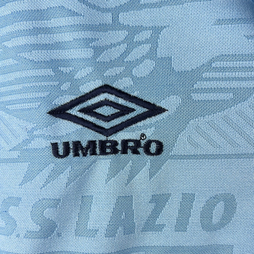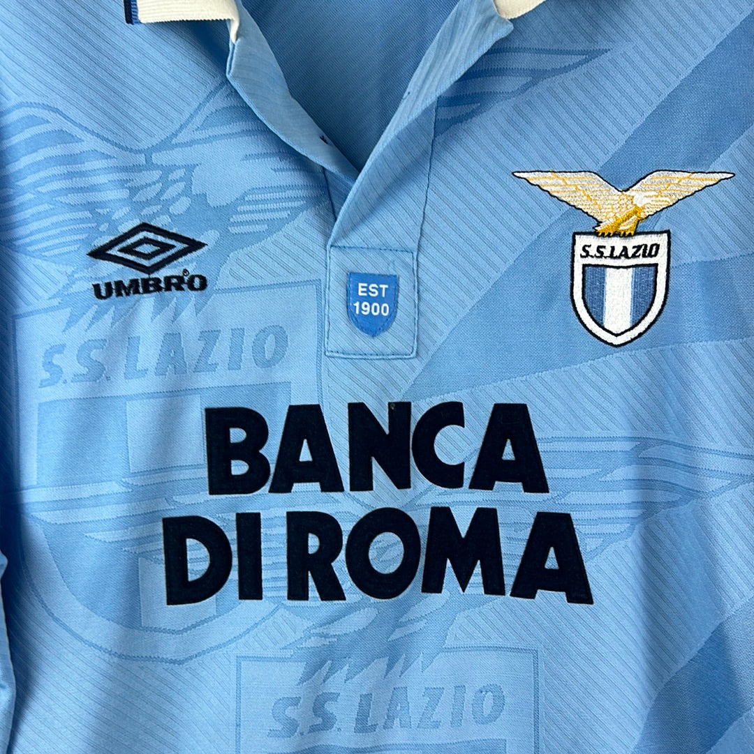 Shirt info: The long-sleeve home shirt for S. S. Lazio 1993-1995 season. The Lazio badge and Umbro logo are embroidered. The 'BANCA DI ROMA' sponsor is embossed felt.
