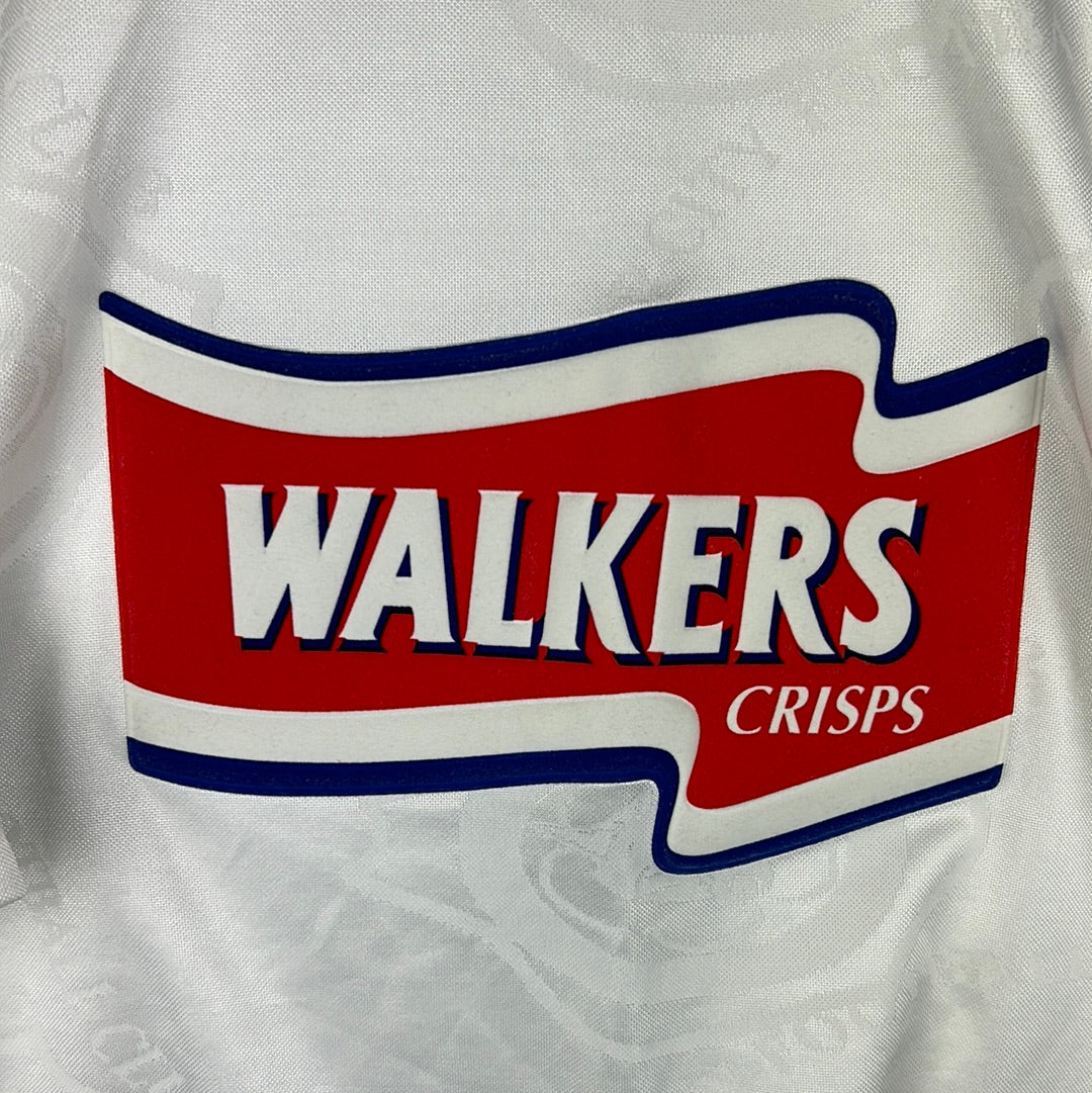 Shirt info: The away short for Leicester City in the 1996/1997 season and the 1997/1998 season. A white shirt with Leicester City detailing in the material and a blue and white v-necked collar. The Walkers Crisps sponsor is in fantastic condition.