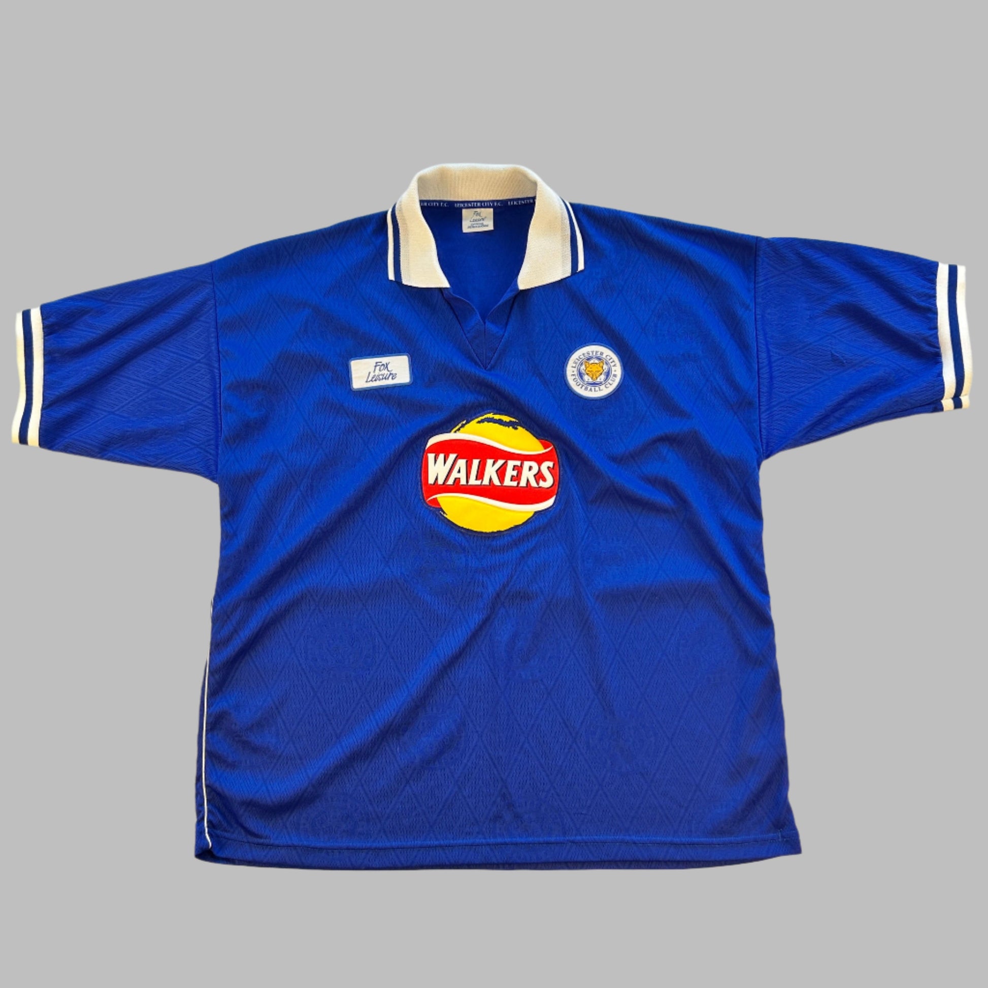Shirt info: The home shirt for Leicester City in the 1998/1999 season and the 1998/1999 season. A blue shirt with a Fox Leisure patch and a large 'Walkers crisps' logo on the front. The colours are still vivid on the sponsor.