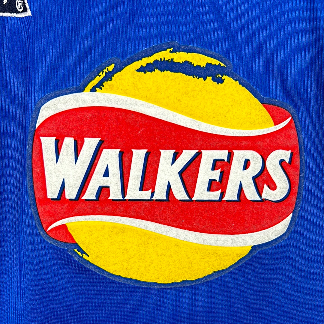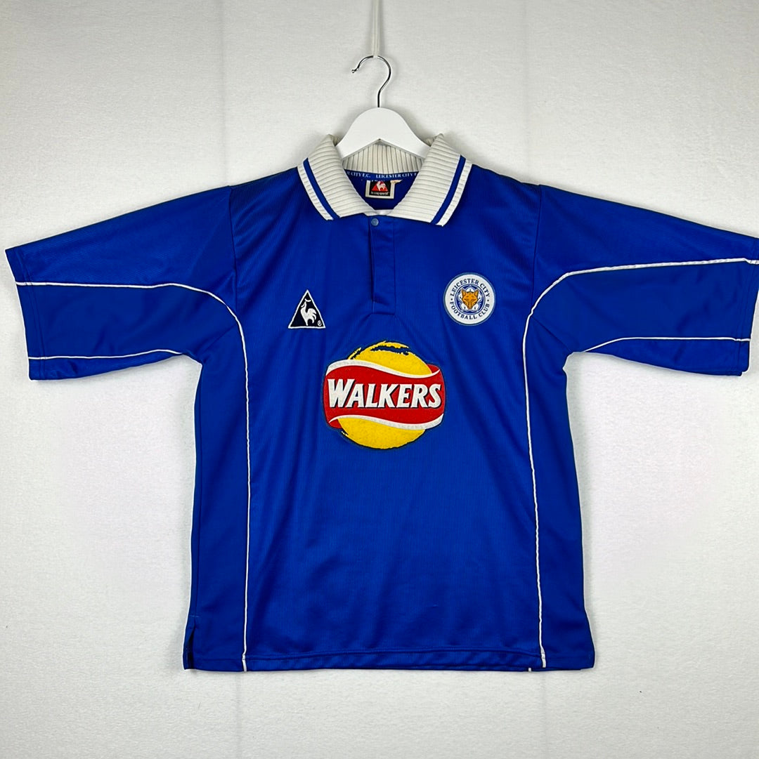 Shirt info: The home shirt for Leicester City in the 1999/2000 shirt. This is an excellent shirt with bright and vibrant colours. The Walkers sponsor is iconic for Leicester City.