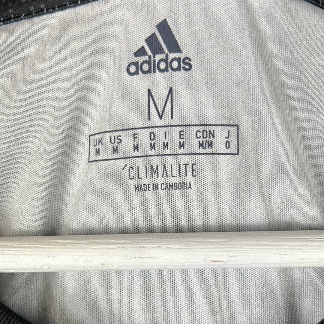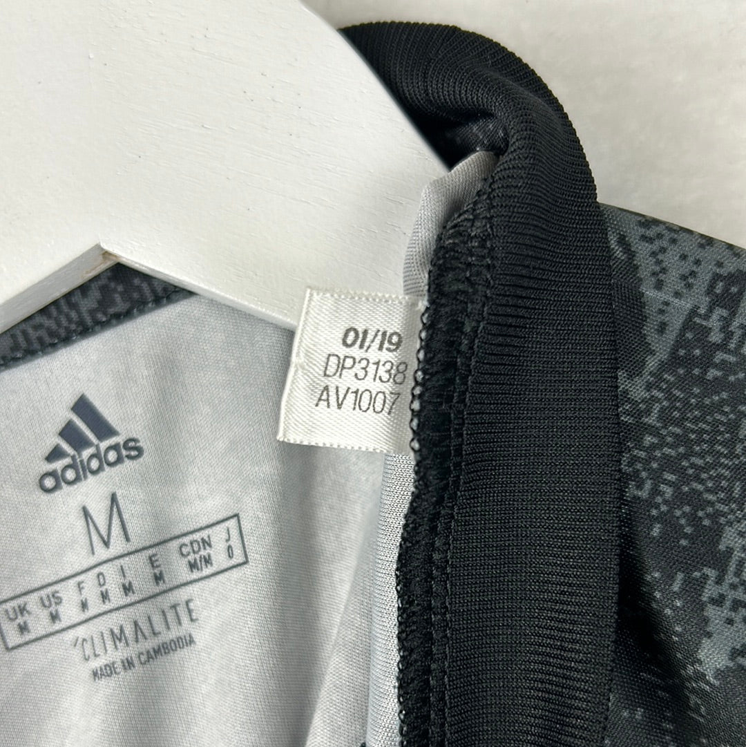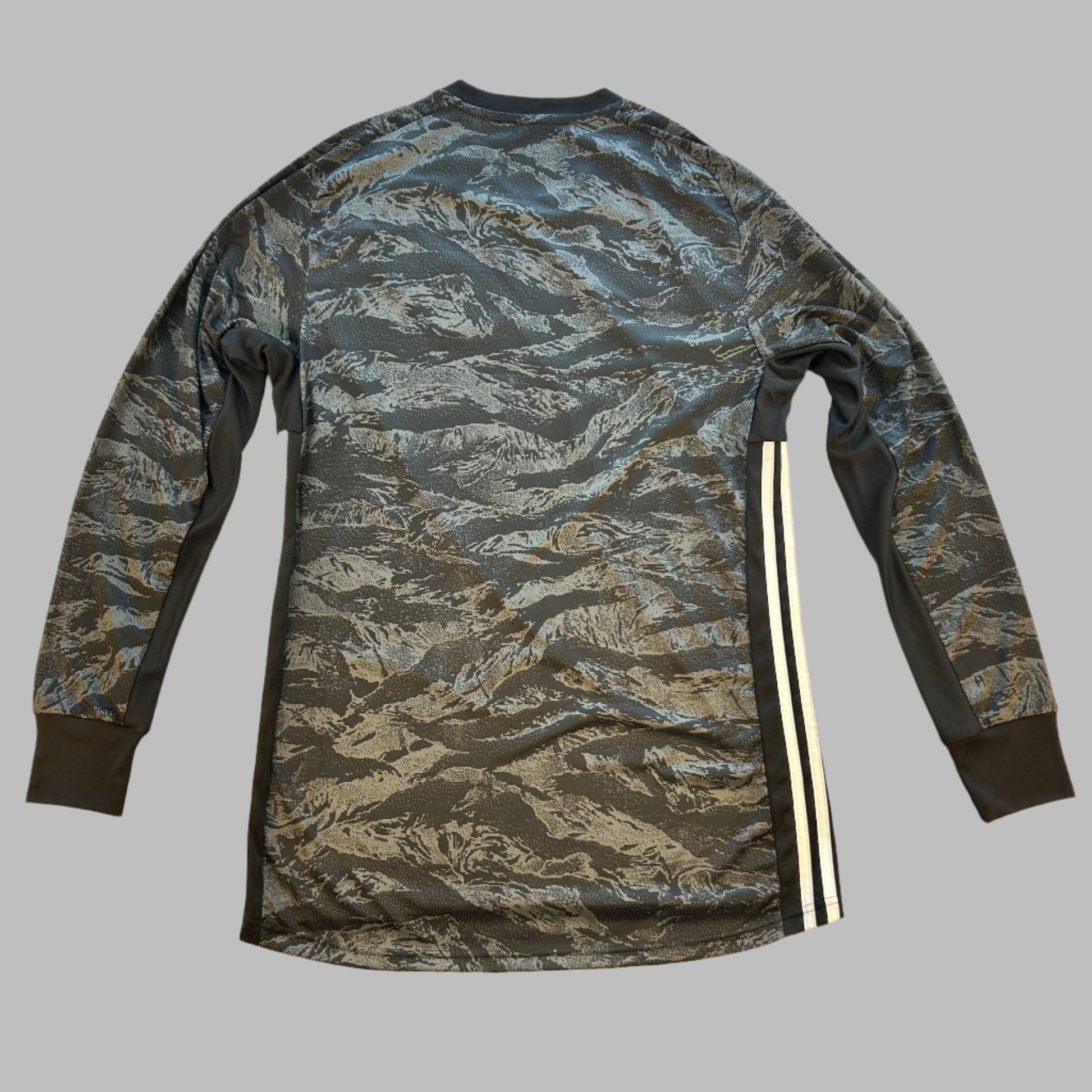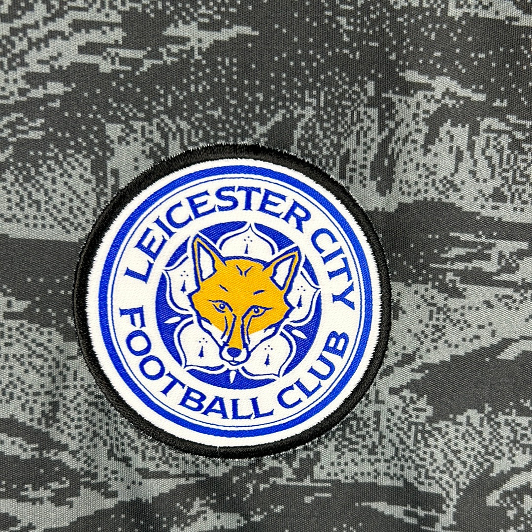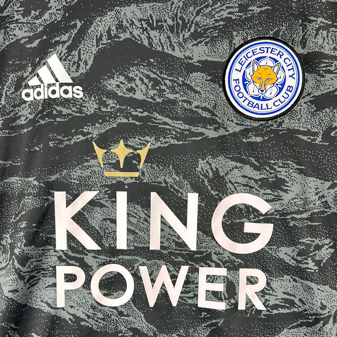 Shirt info: Leicester City's alternative goalkeeper shirt from the 2019/2020 season. It is a black and grey shirt with mountain patterns in the material. The Adidas logo is printed on the shirt.