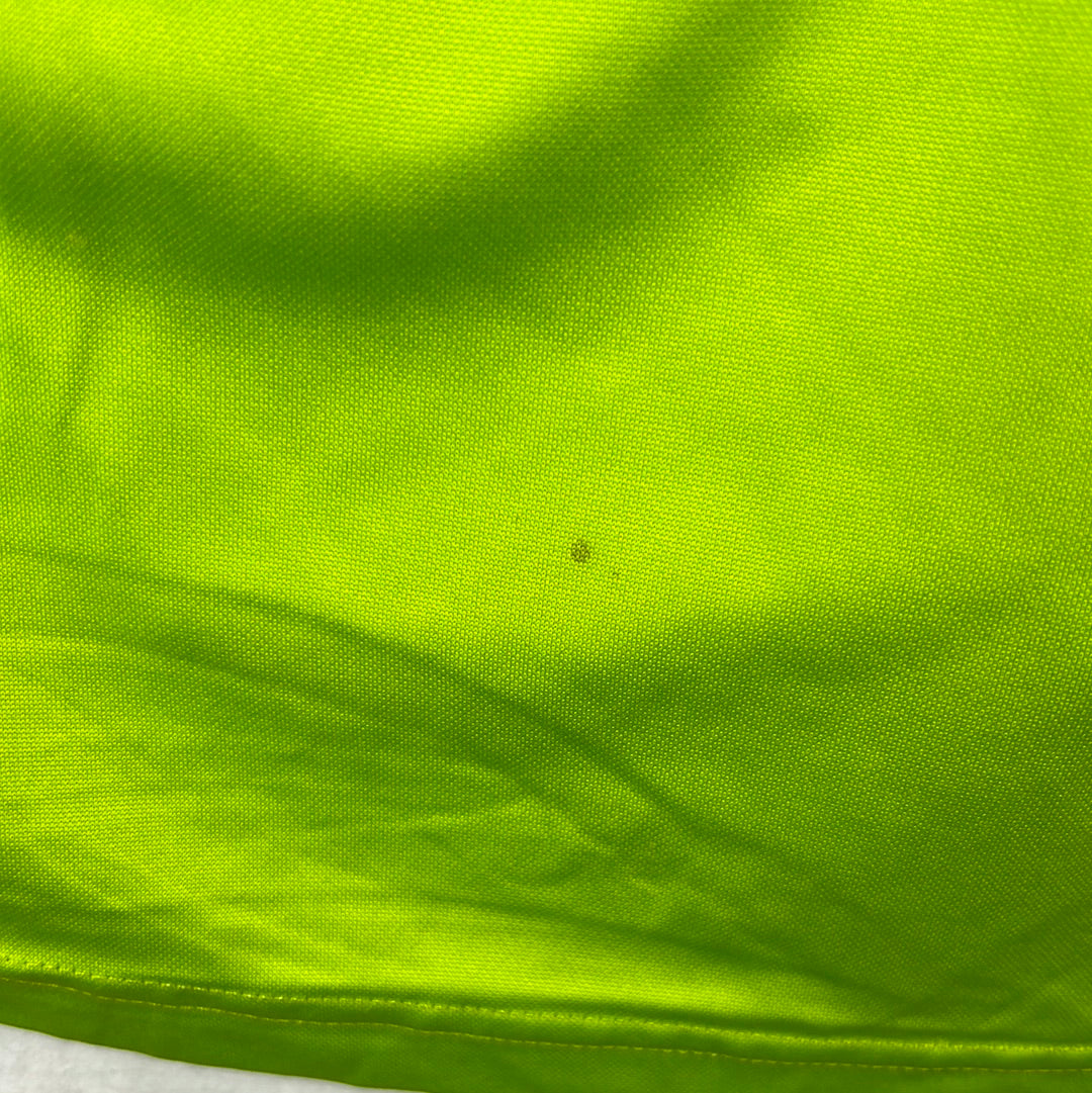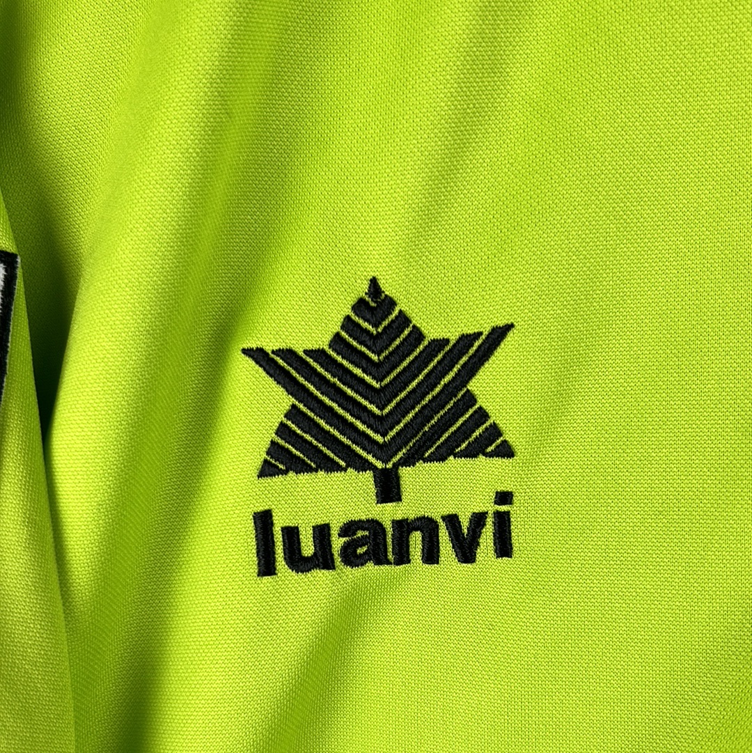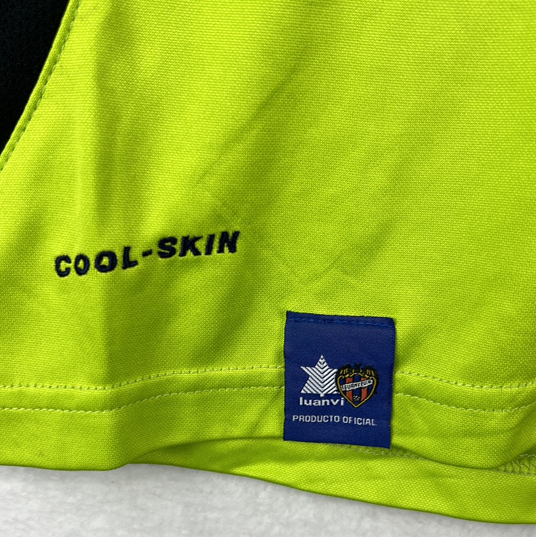 Shirt info: The lime green away shirt worn by Levante during the 2007-2008 La Liga season. This specific shirt was worn by Juanma during the away match vs Barcelona on 24/2/2008 which they lost 5-1. The shirt features an embroidered Levante badge and Luanvi logo, with the sponsor printed. The sleeve has the official La Liga 'LFP' patch and '9' sleeve sponsor. This is a collared football shirt with the red and yellow Catalonia Senyera flag in the centre. 'Juanma 22' is printed in black font on the back.