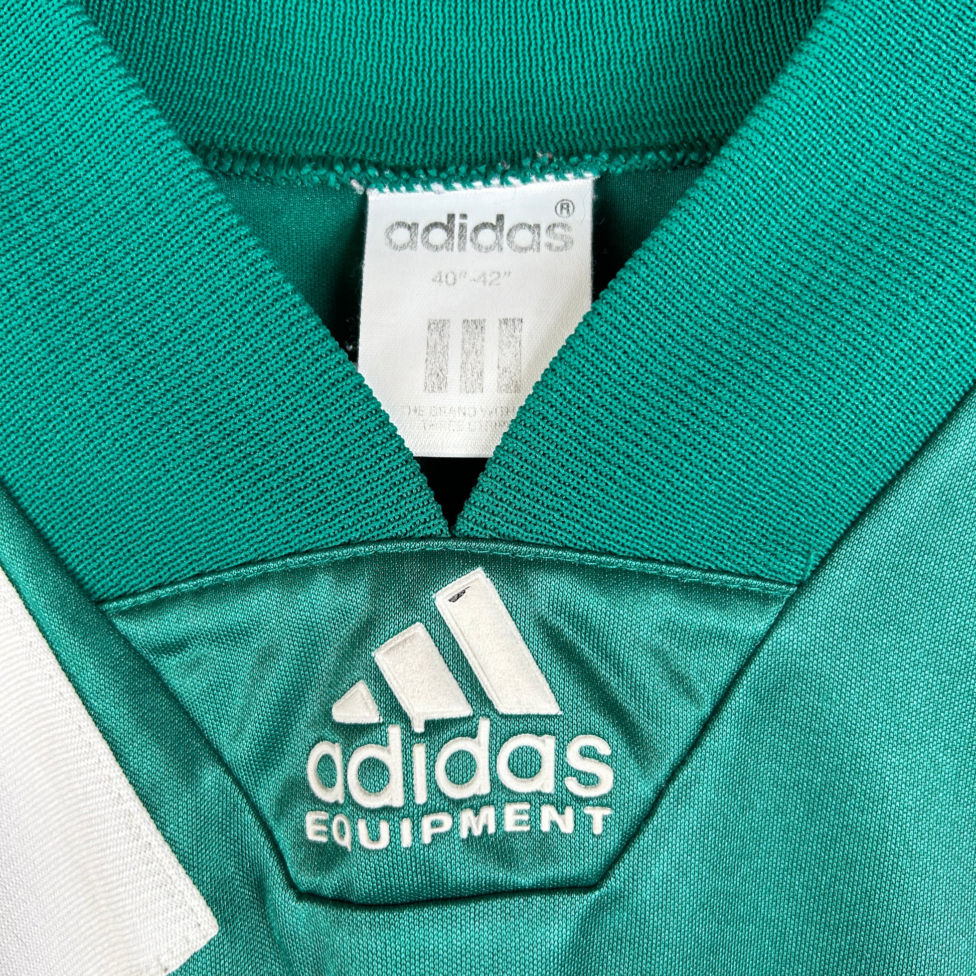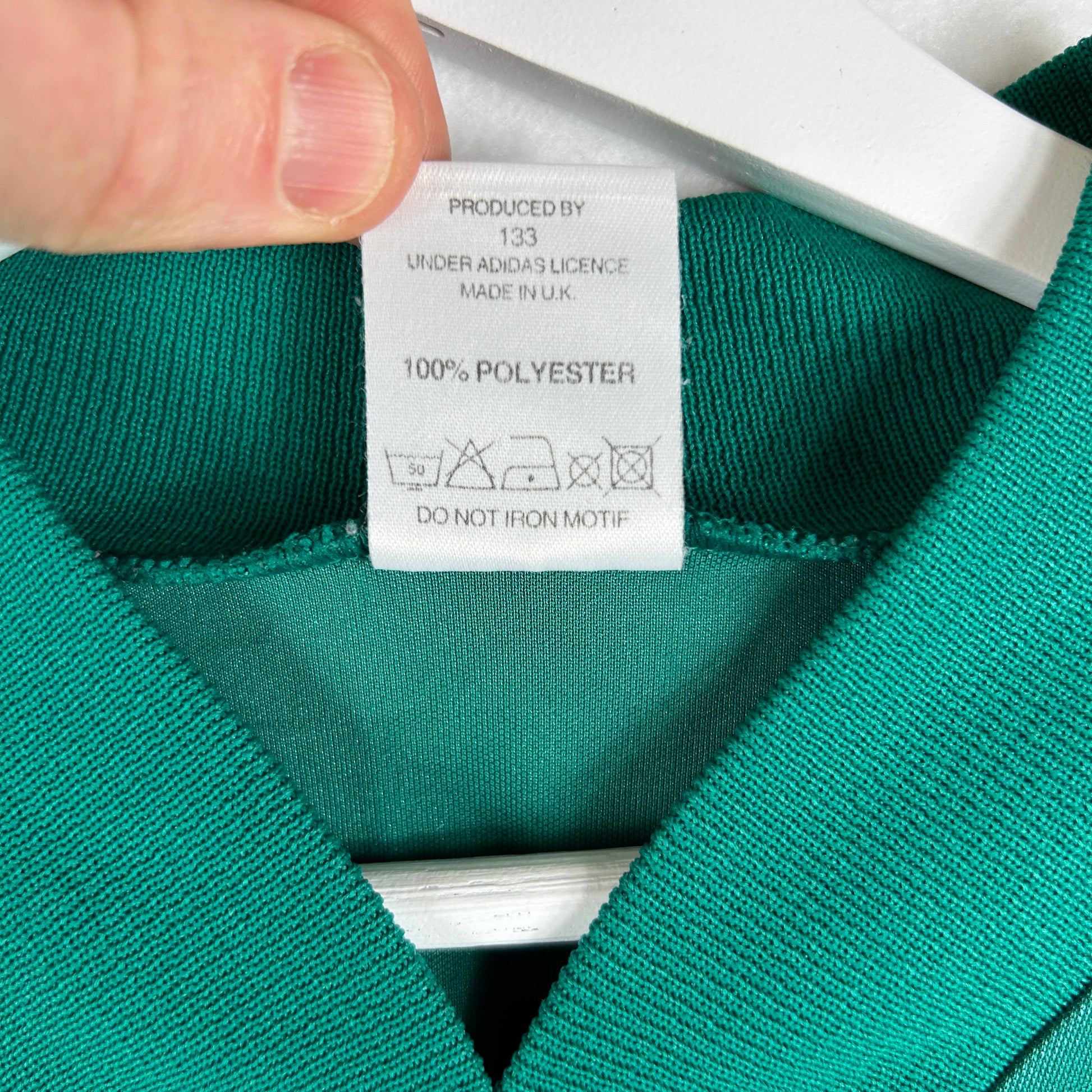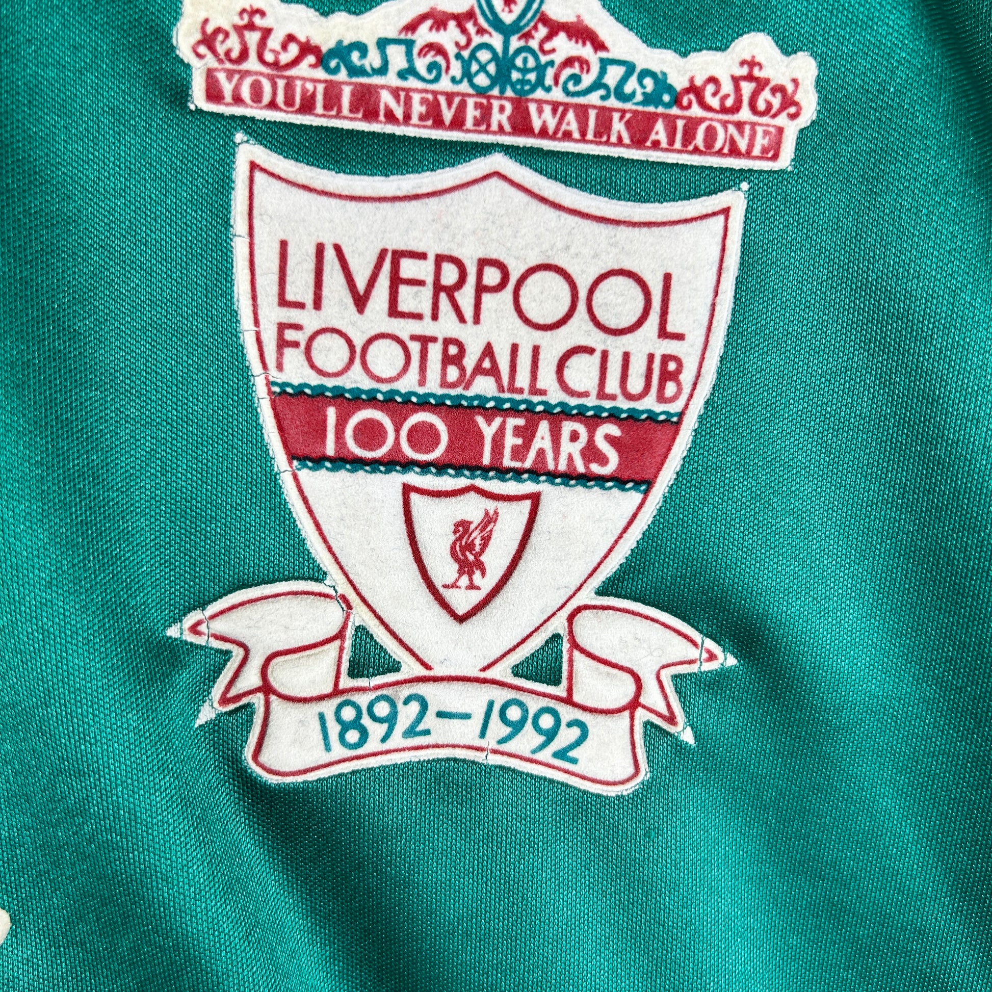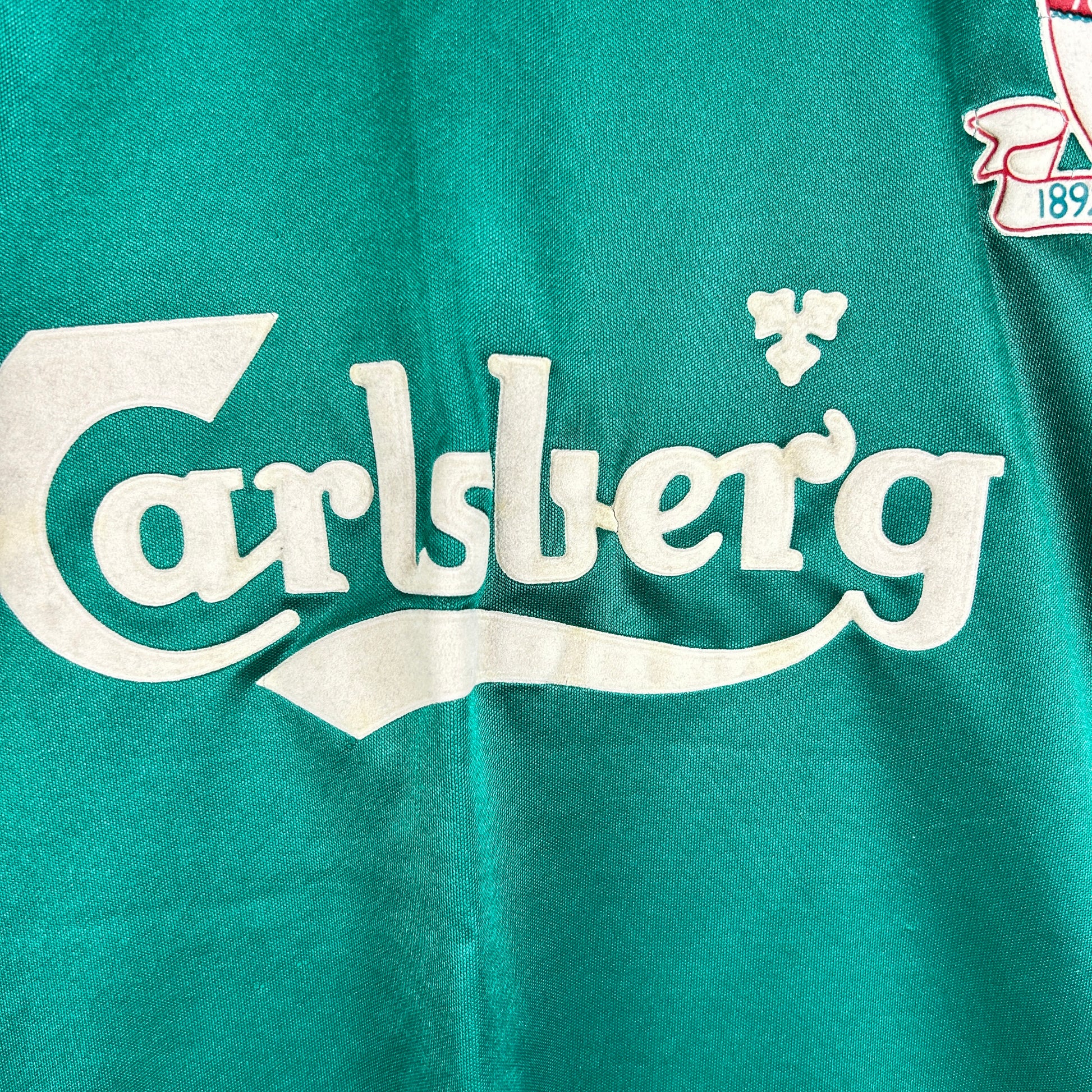Shirt info: The green Liverpool away shirt for the 1992/1993 season. The shirt features; the white Adidas 3-stripe design sewn into the right shoulder, an embossed Liverpool badge and the 'Carlsberg' sponsor. This is a classic Adidas template design from the early 1990s.