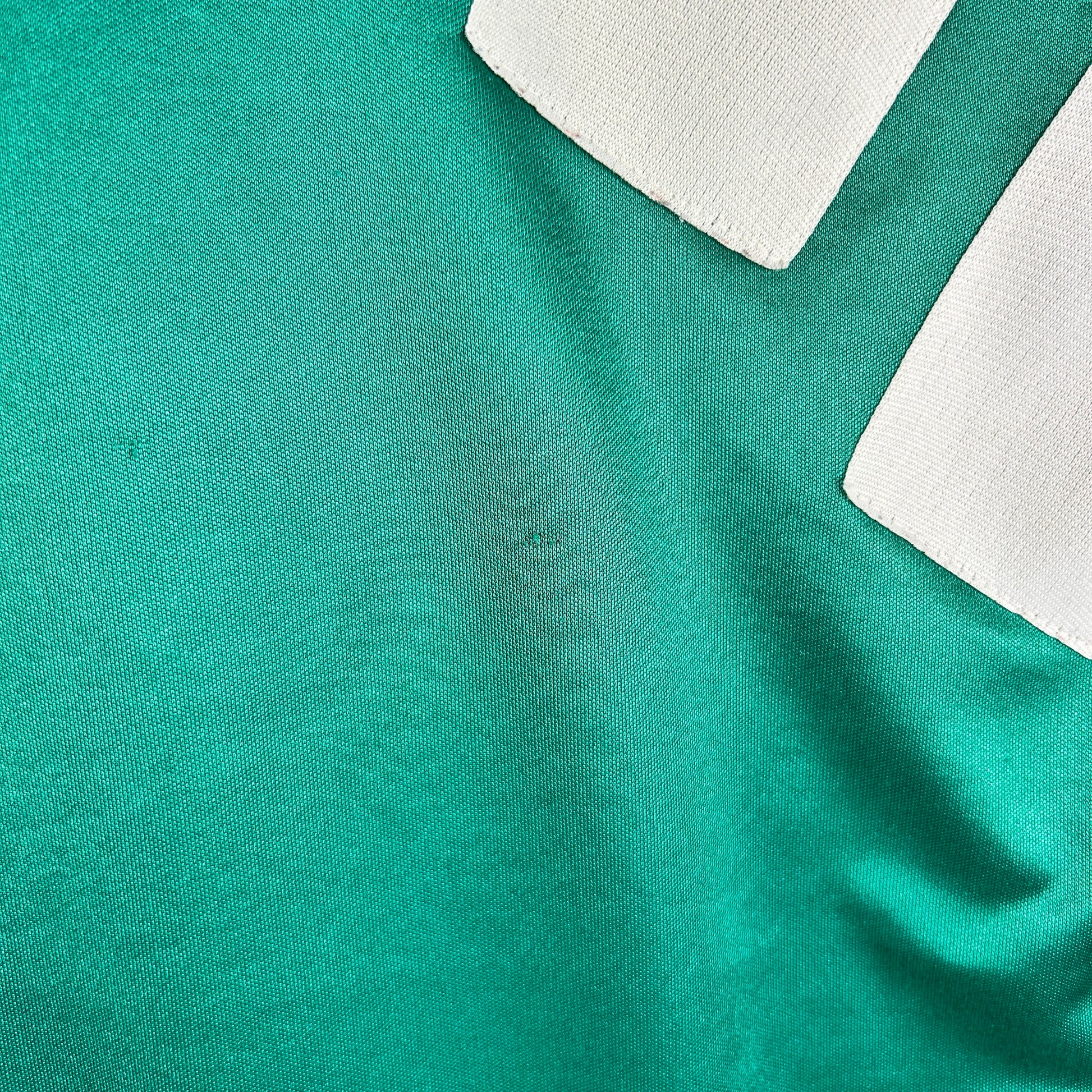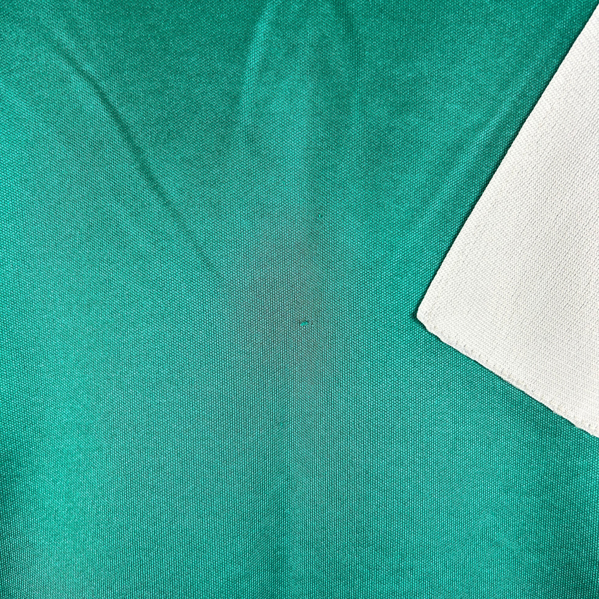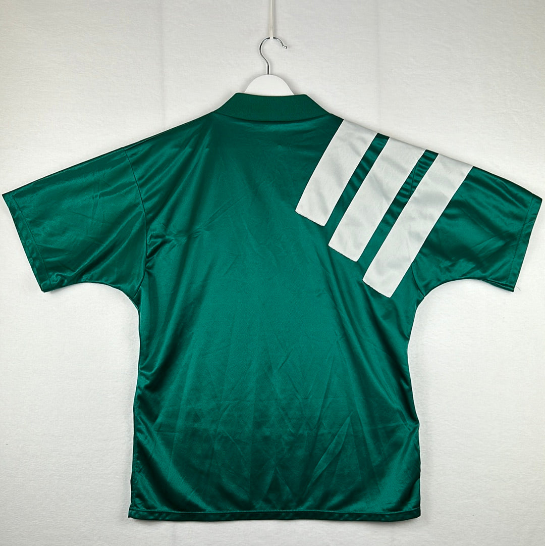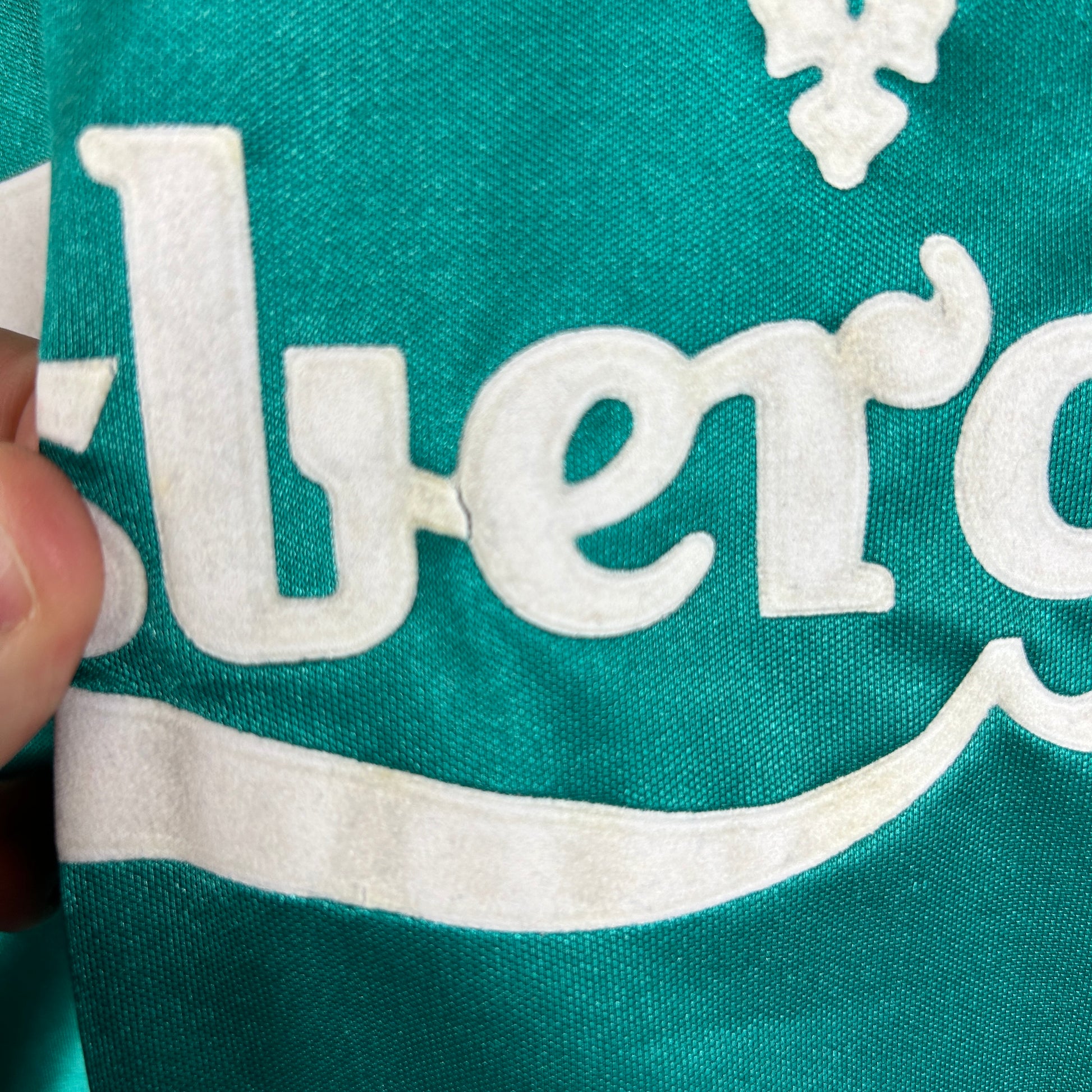 Shirt info: The green Liverpool away shirt for the 1992/1993 season. The shirt features; the white Adidas 3-stripe design sewn into the right shoulder, an embossed Liverpool badge and the 'Carlsberg' sponsor. This is a classic Adidas template design from the early 1990s.