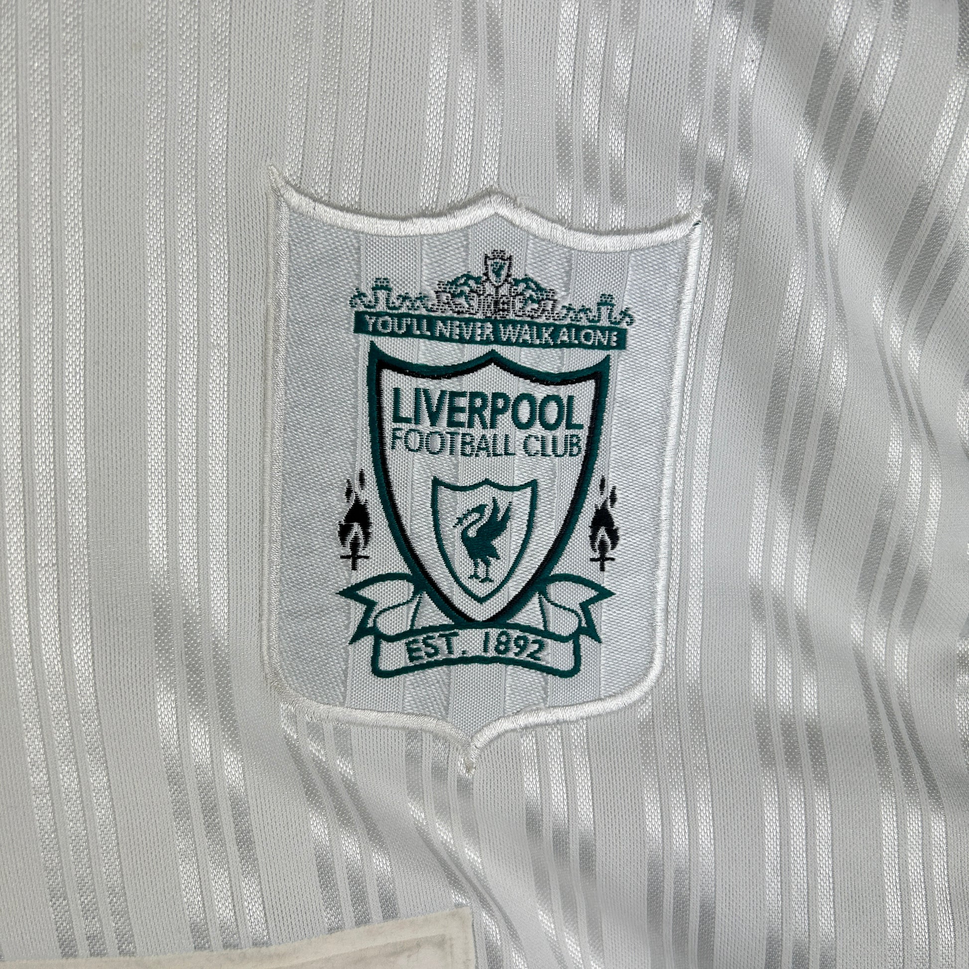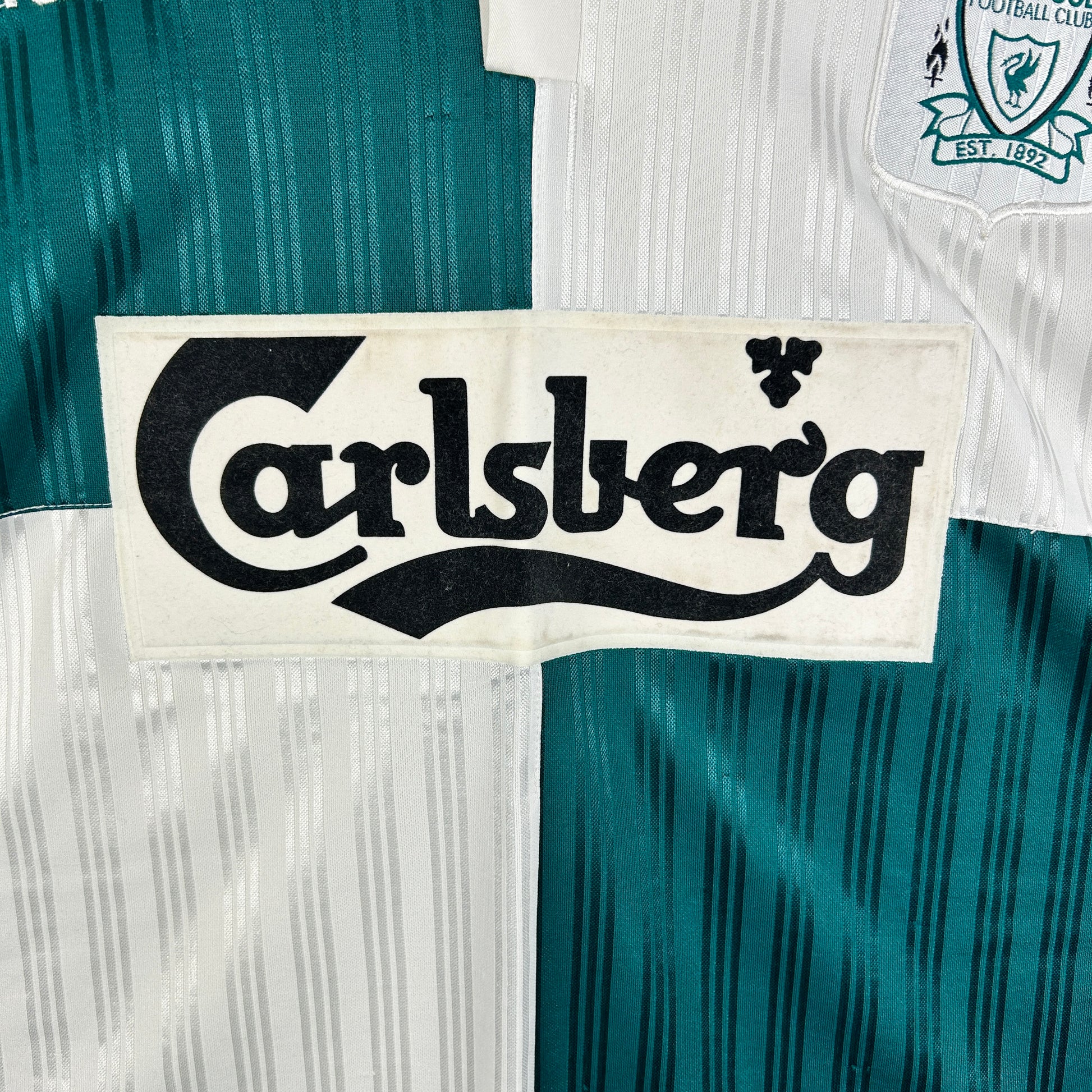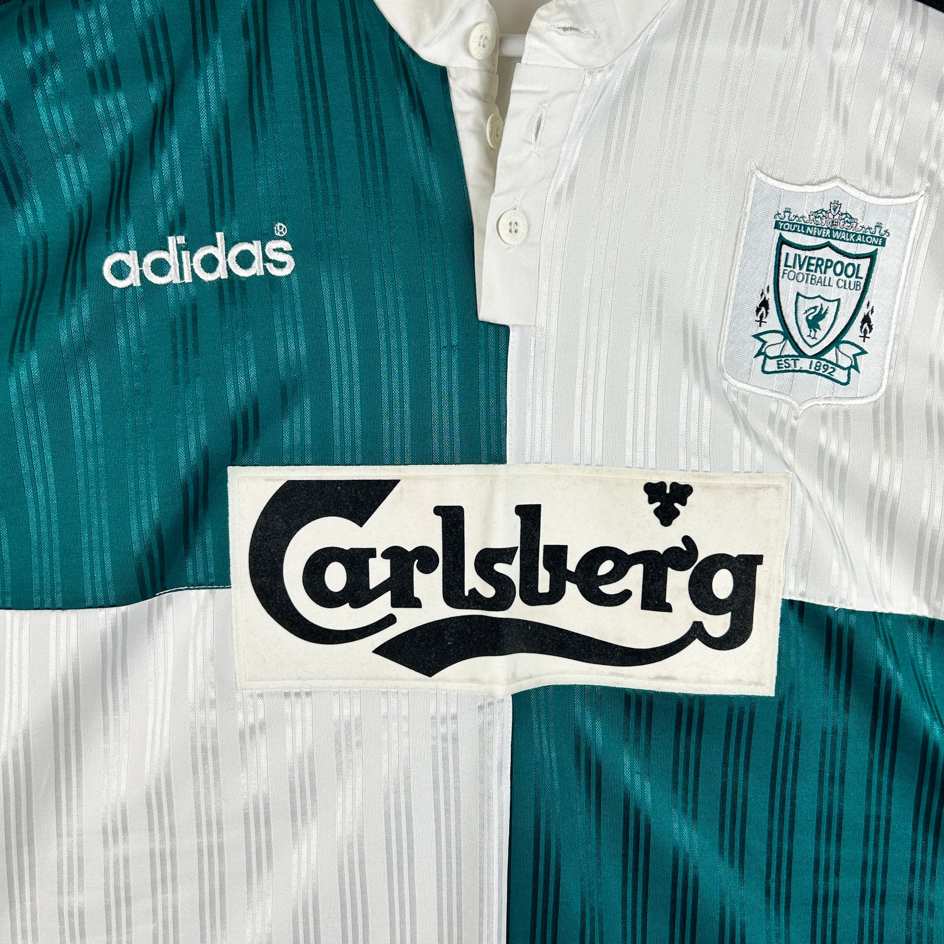Shirt info: This is the Liverpool away shirt from 1995/1996, the last one from this Adidas era before Liverpool moved to Reebok. It features a white and green quadrant design, with a Liverpool patch badge and a 'Carlsberg' sponsor. The Adidas logo is embroidered.
