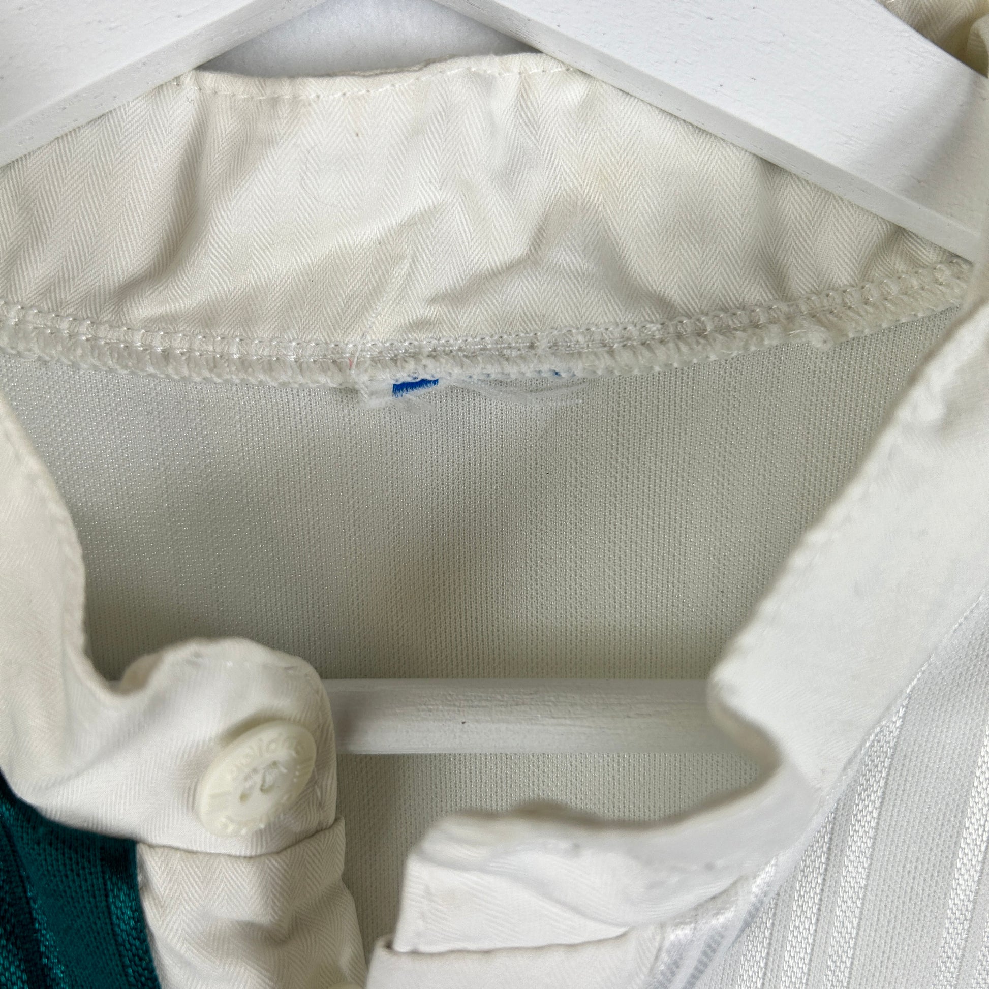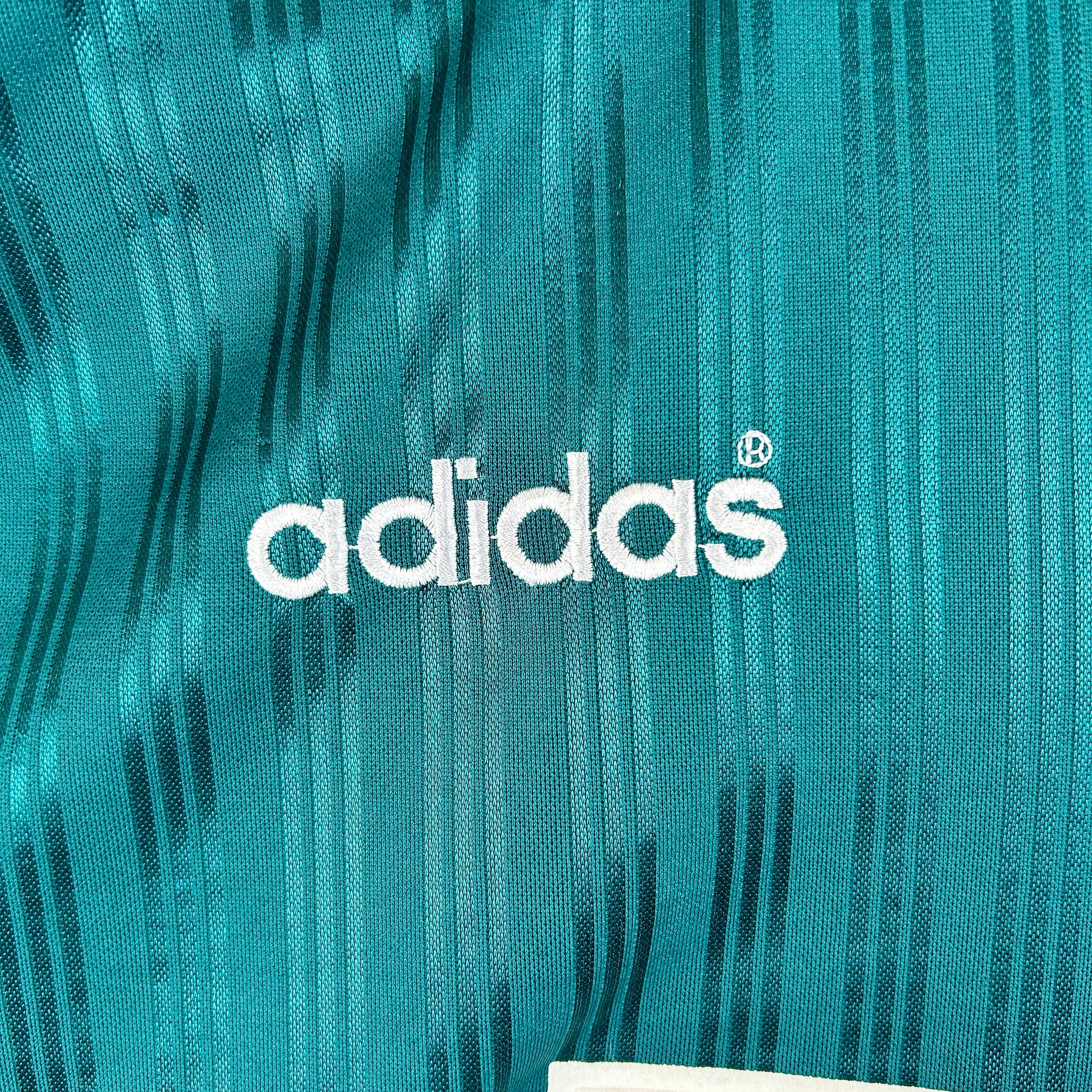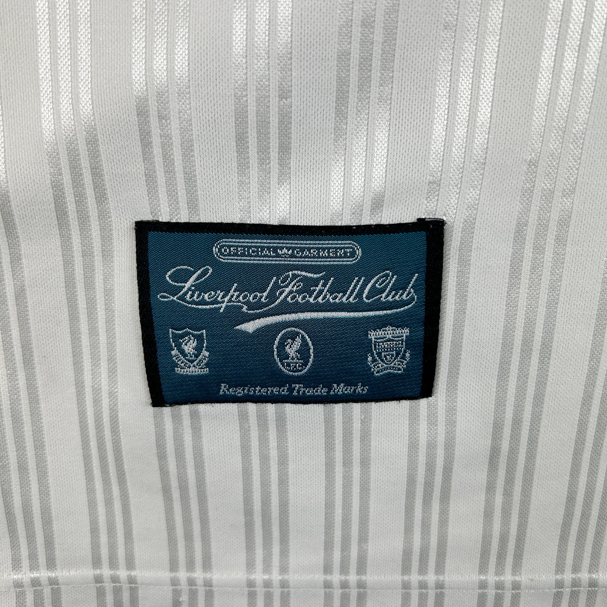 Shirt info: This is the Liverpool away shirt from 1995/1996, the last one from this Adidas era before Liverpool moved to Reebok. It features a white and green quadrant design, with a Liverpool patch badge and a 'Carlsberg' sponsor. The Adidas logo is embroidered.