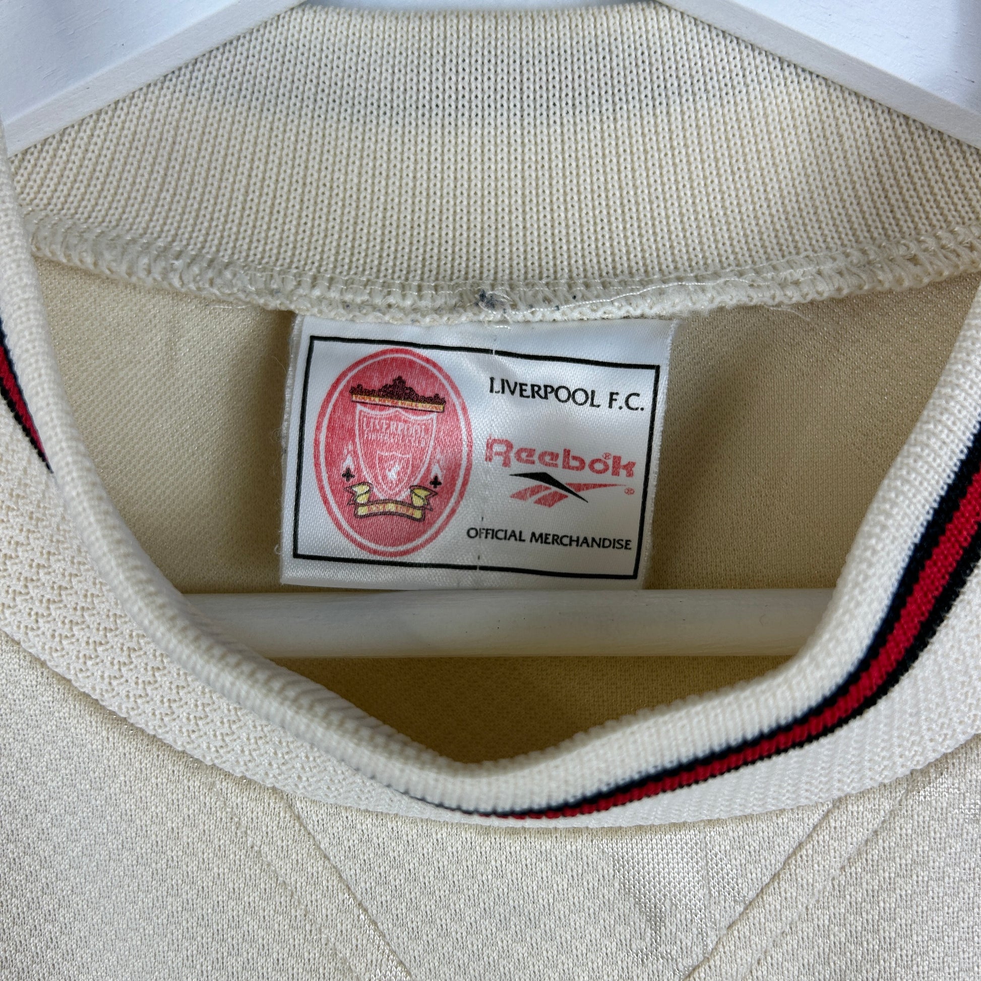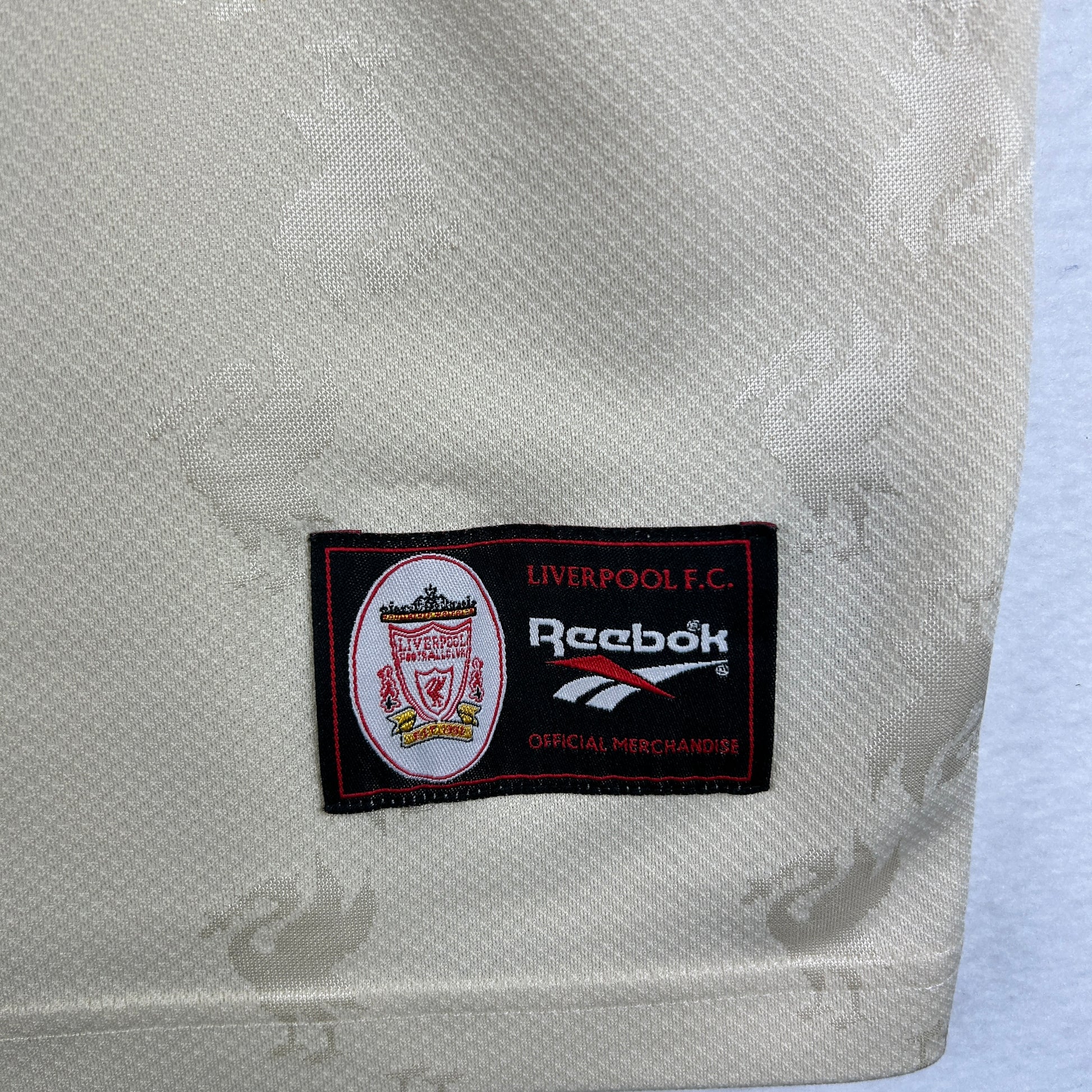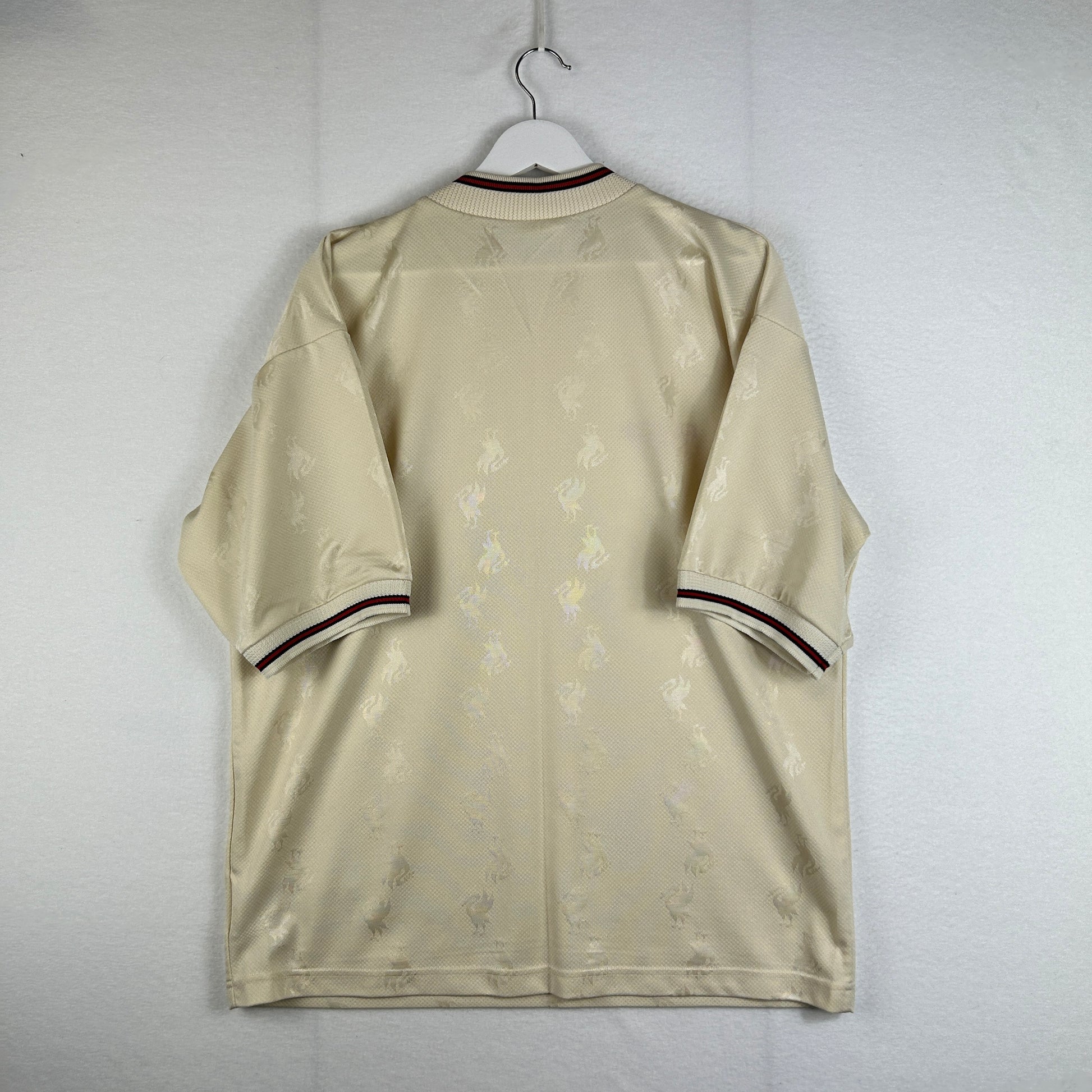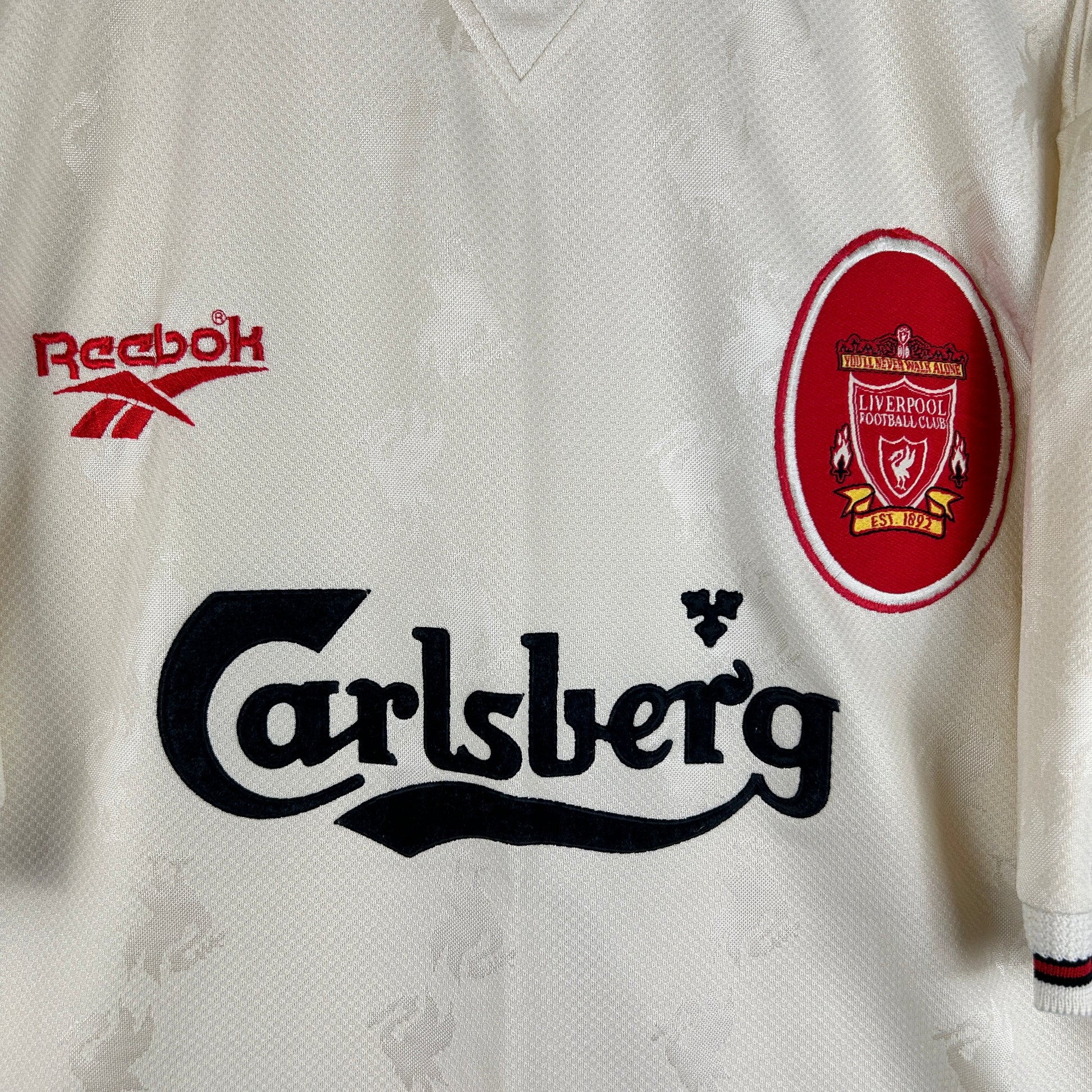 Shirt info: The highly sought-after Liverpool ecru away shirt in the 1996/1997 season. The shirt features a unique ecru colour way, an embroidered Liverpool patch badge and a dark green felt 'Carlsberg' sponsor.