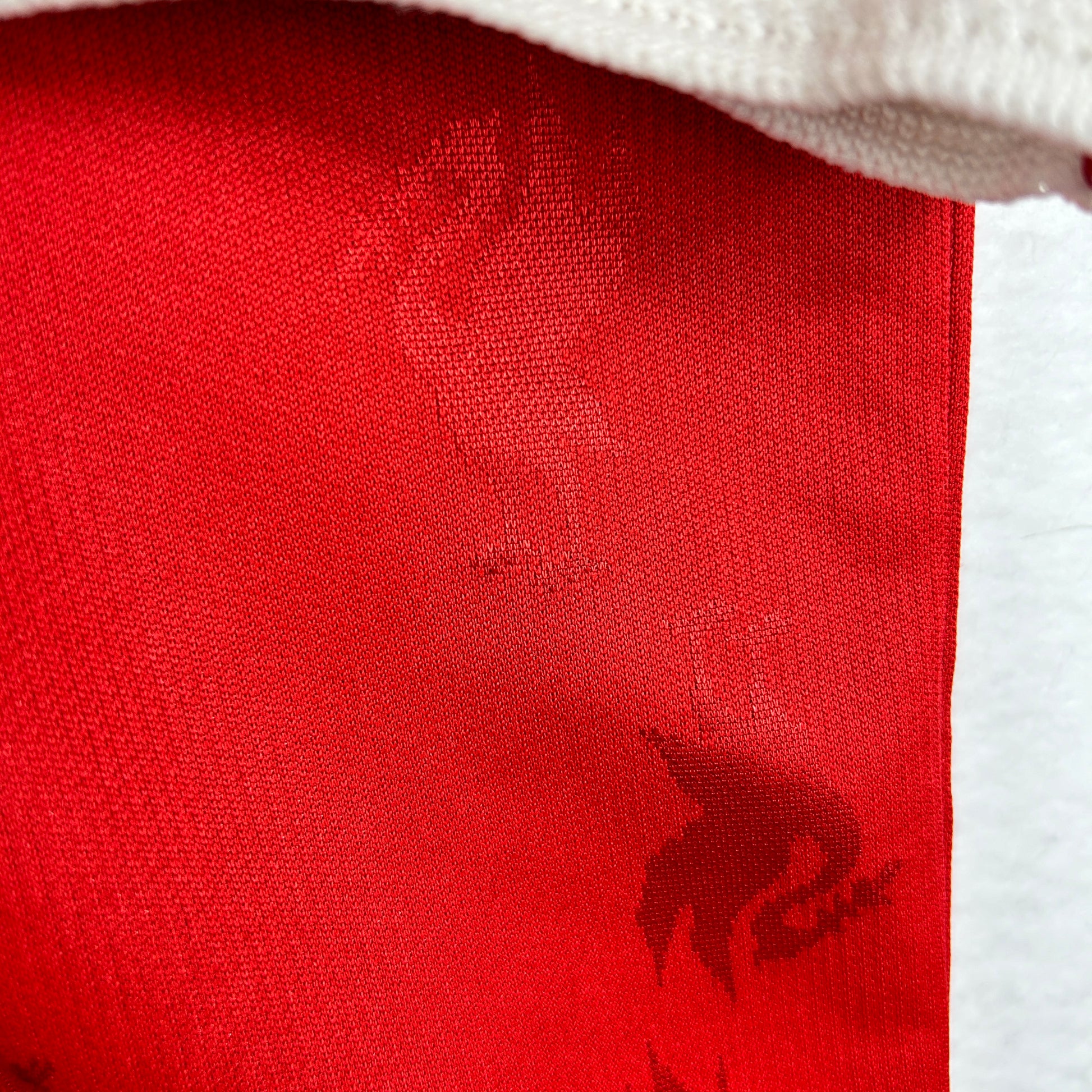 Shirt info: The Liverpool home shirt in the 1996/1997 season. This shirt has a white collar, common in the late 1990s.