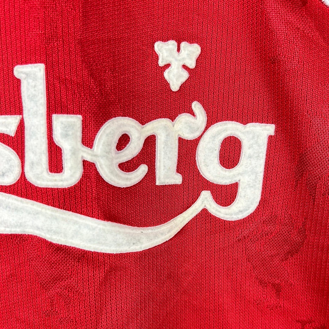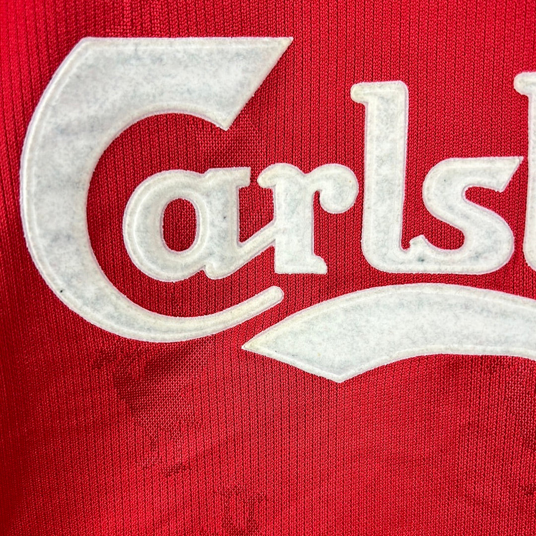 Shirt info: The red Liverpool home shirt that was worn during the 1996-1997 and 1997-1998 seasons. The shirt features a white collar with a red stripe, common in the late 1990s. The Liverpool badge and Adidas logos are embroidered. The 'Carlsberg' sponsor is embossed felt.