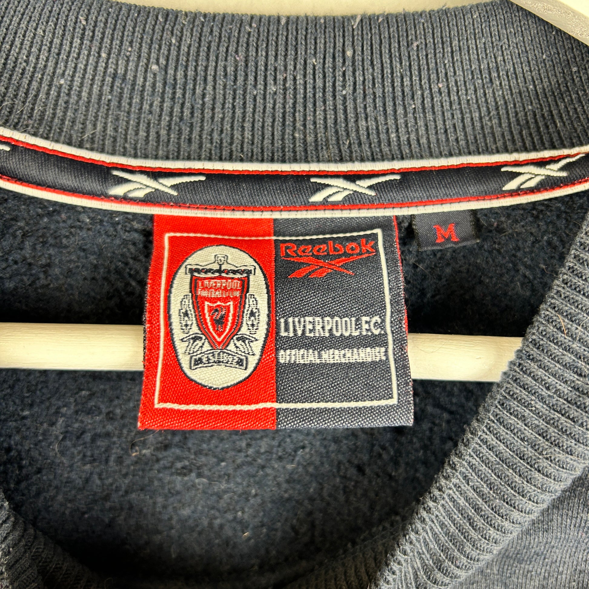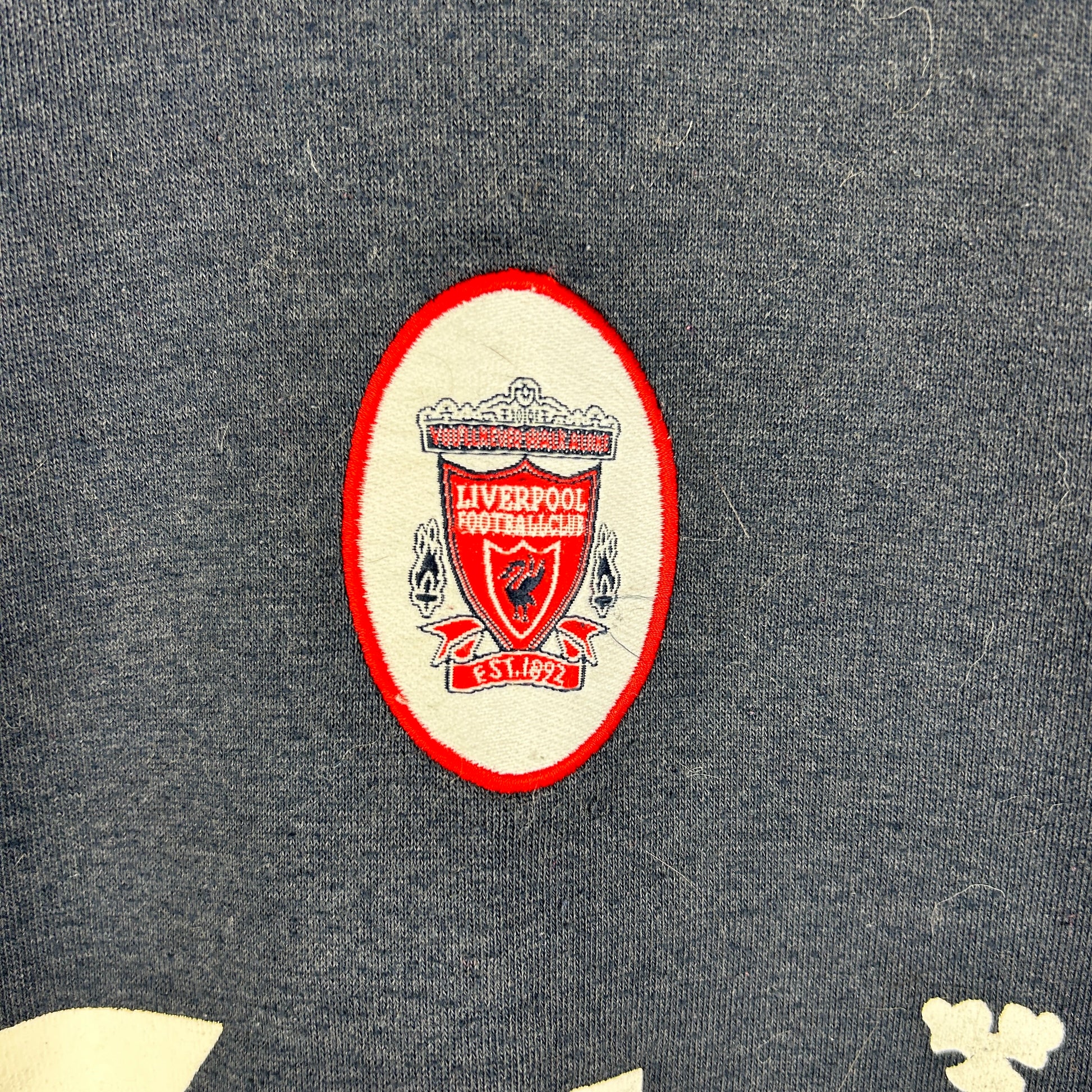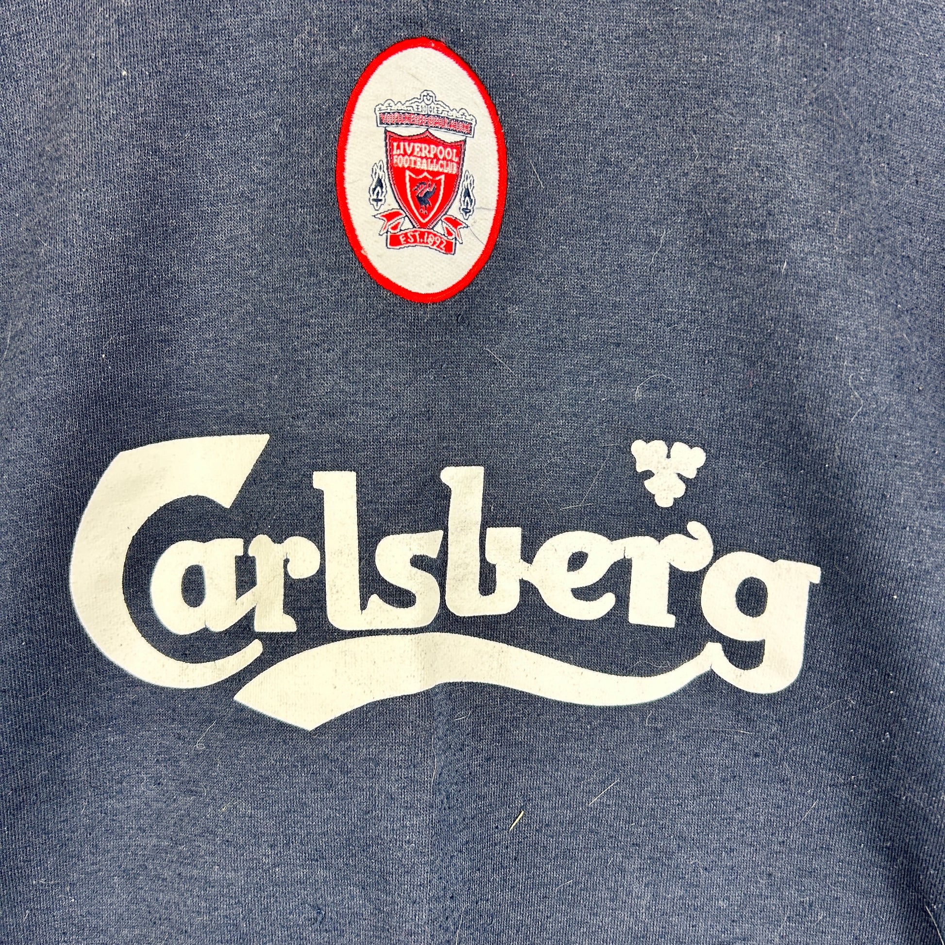 Shirt info: A Liverpool jumper/ sweatshirt from the 1997/1998 season. A dark blue Reebok jumper with Carlsberg sponsorship on the front. The sleeves have the Reebok logo going down them in patches.