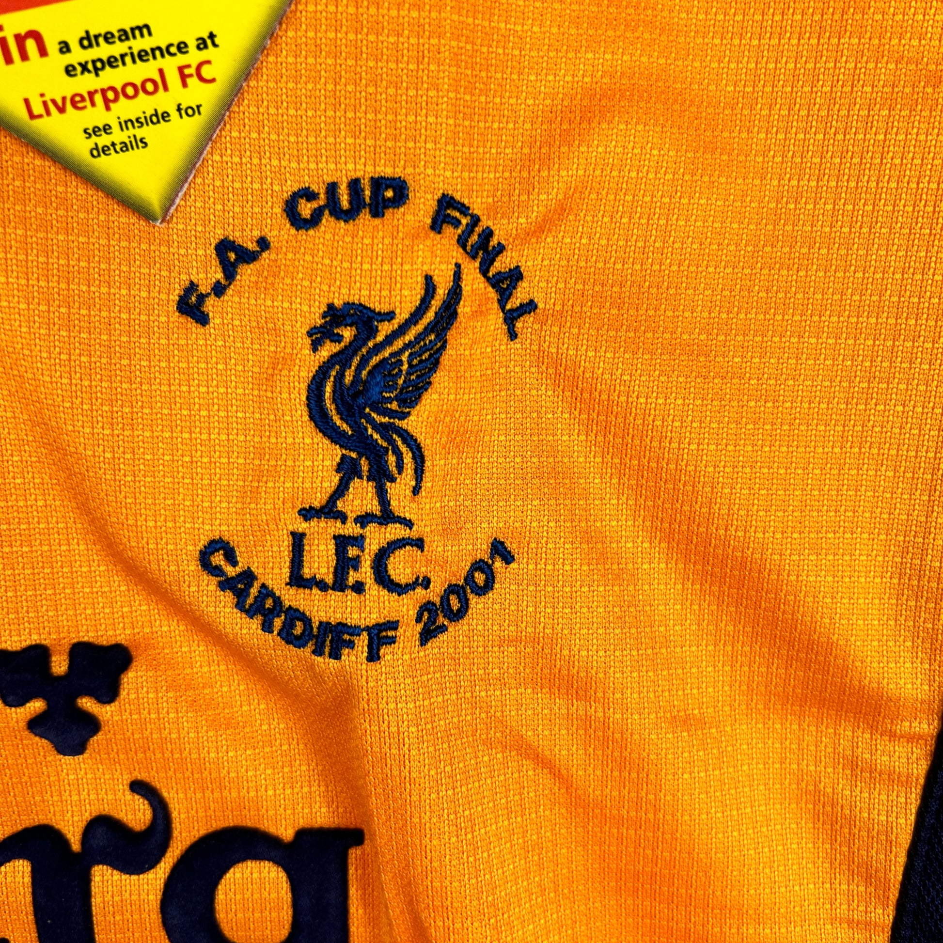 The Liverpool away shirt for the 2000/2001 season and the third shirt for the 2001/2002 season have the 2001 FA Cup final embroidered around the badge.