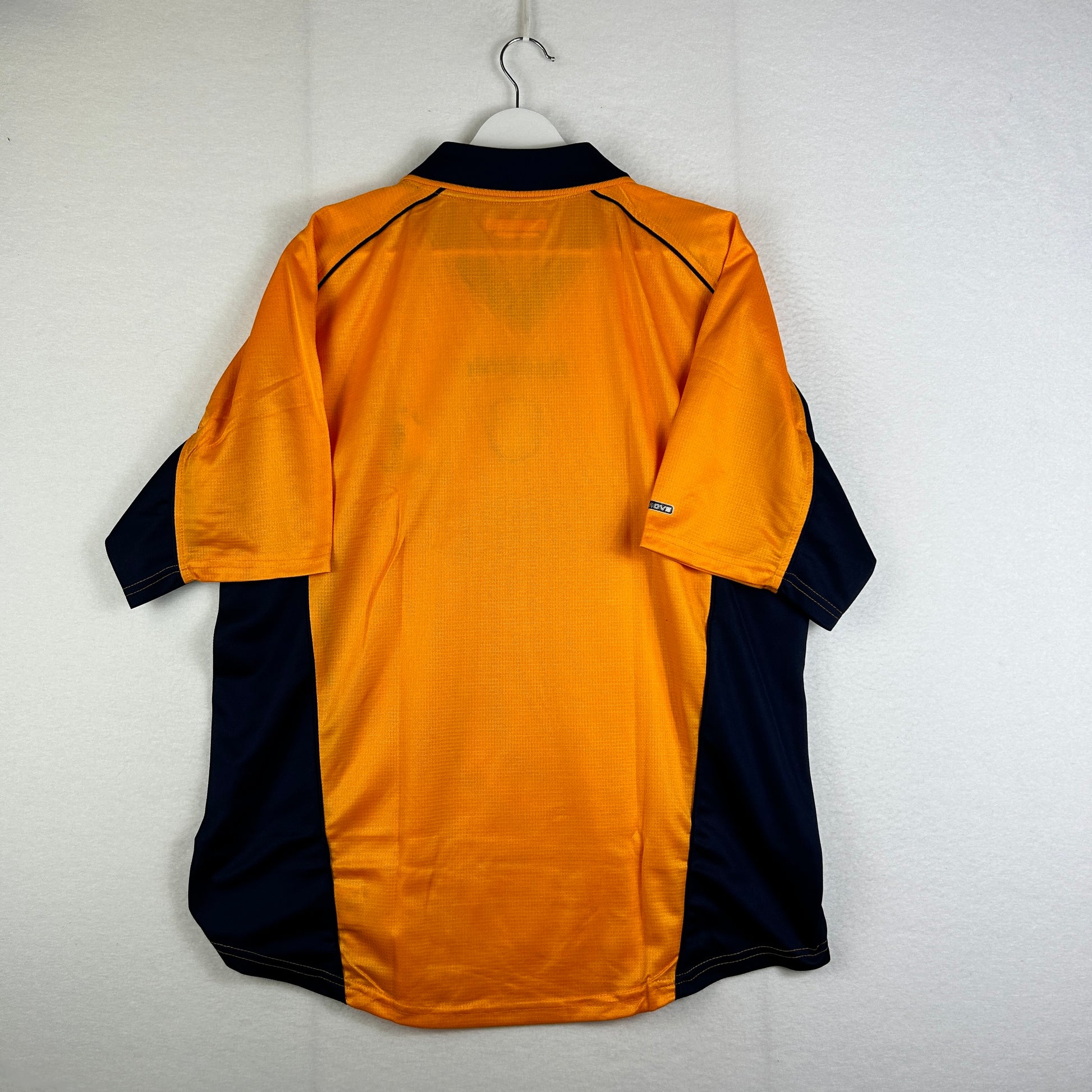 Shirt Info: The Liverpool away shirt worn during the 2000/2001 season and the third shirt worn in the 2001/2002 seasons. The orange shirt features a dark blue shirt-style collar. The Reebok logo is central and embroidered in dark blue, the Liverpool badge is a patch, and the Carlsberg sponsor is embossed in a felt-type material. Liverpool FC's official merchandise is printed inside the neck.