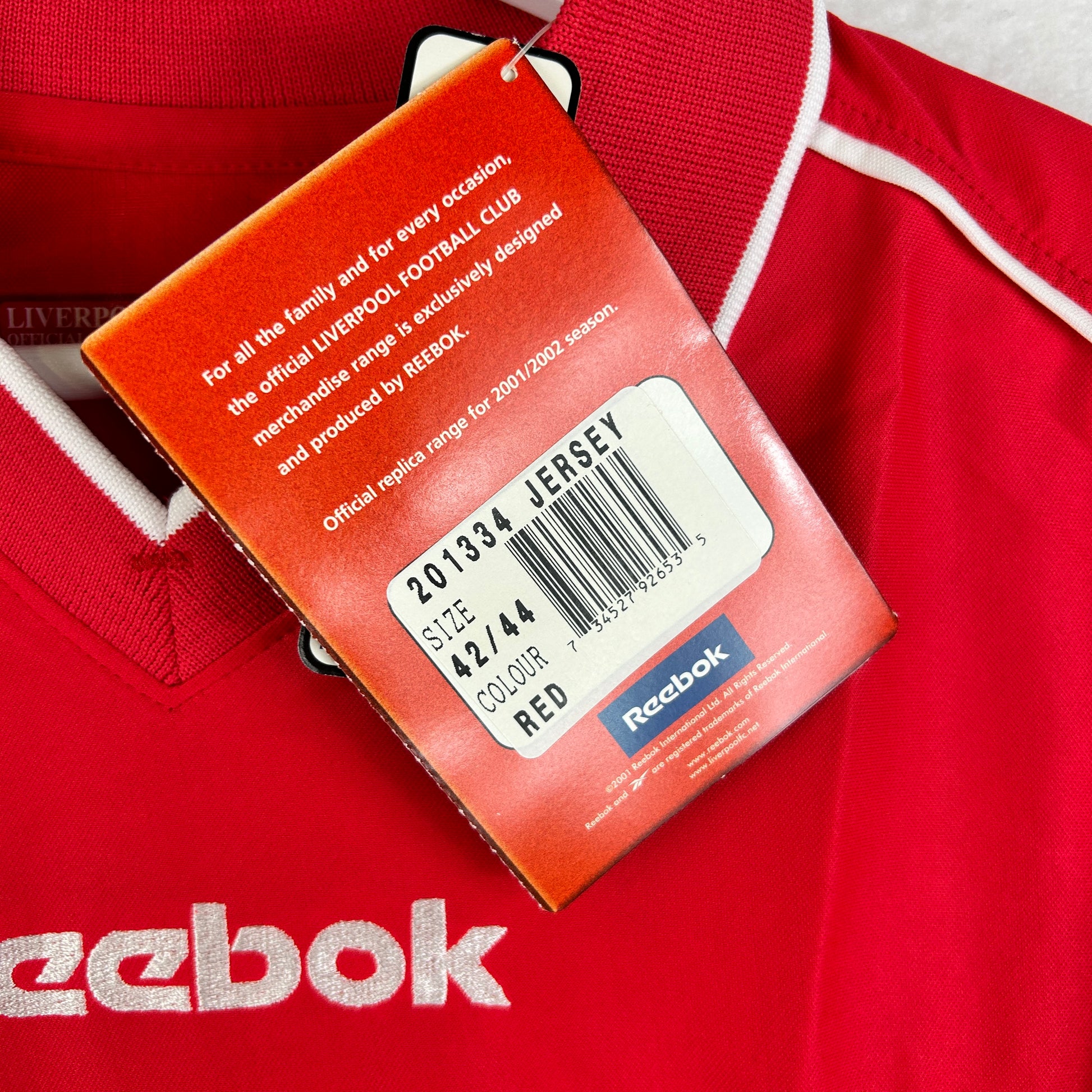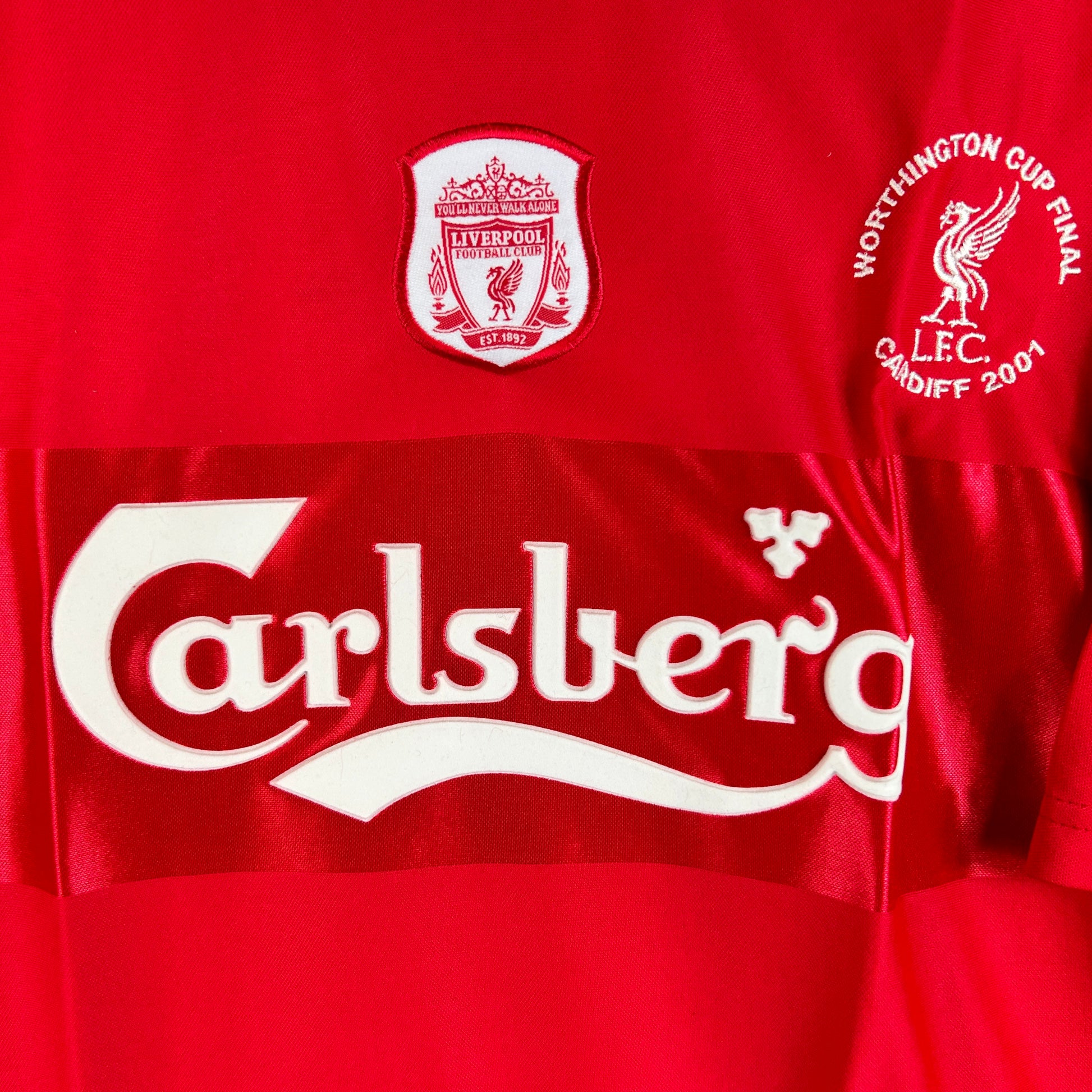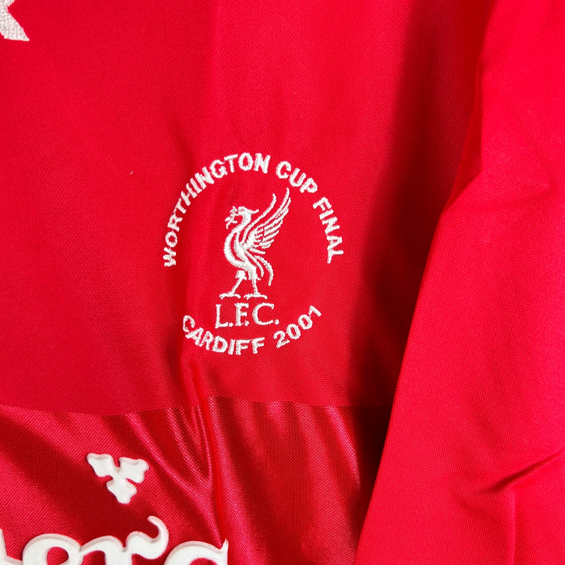 Shirt info: The Liverpool home shirt in the 2000/2001 season. The shirt has the commemorative Worthington Cup final embroidery around the badge. The shirt is new with tags and will go with the original bag.