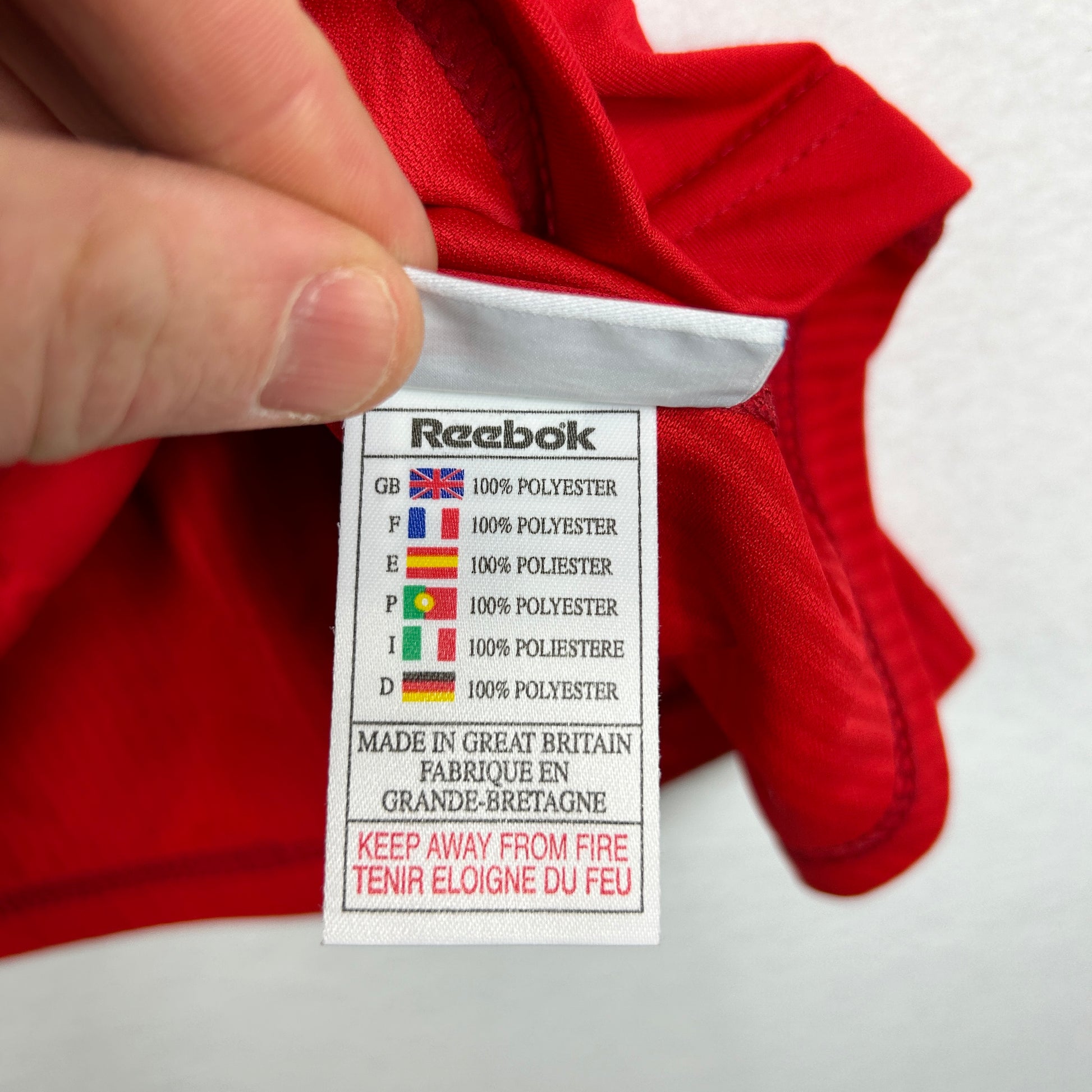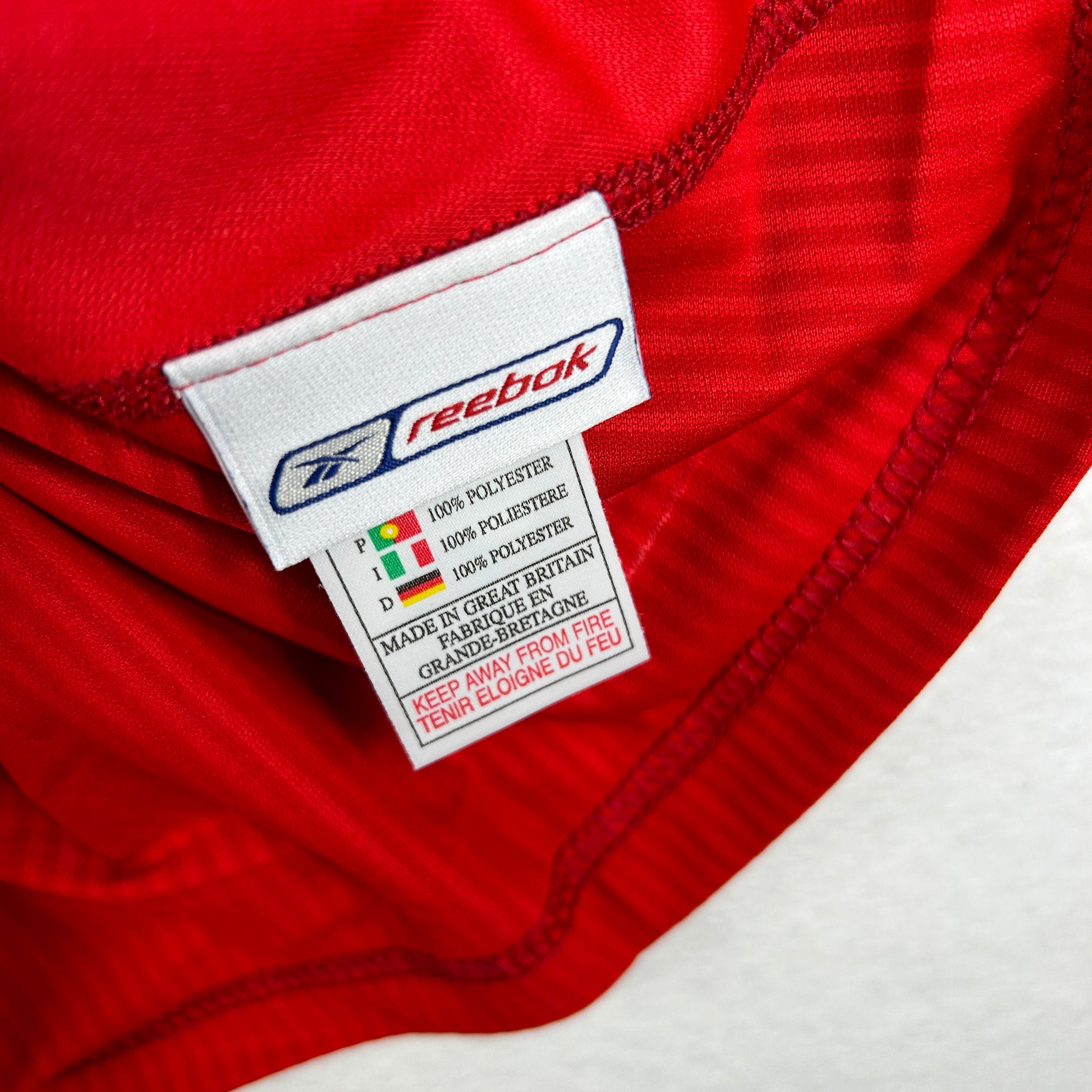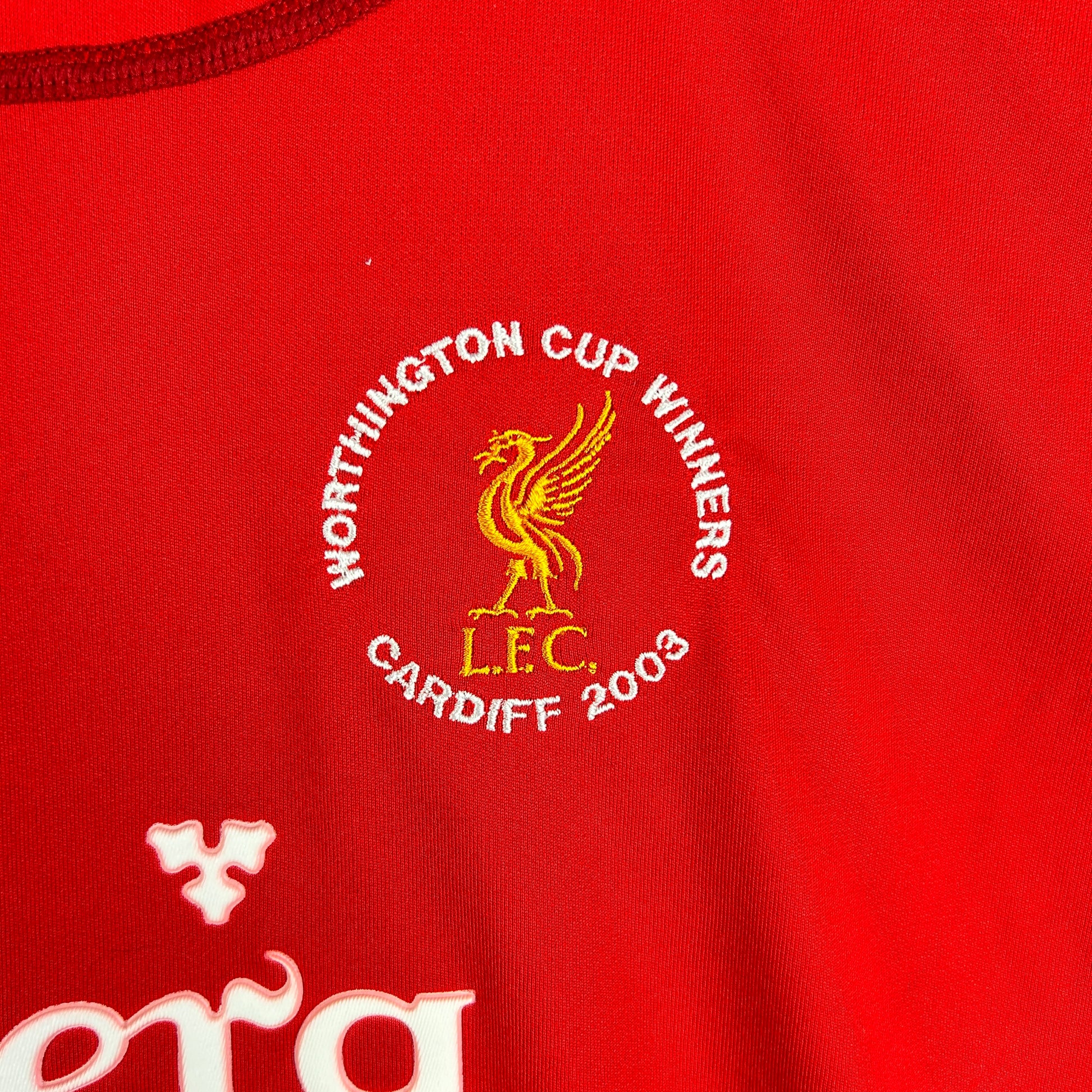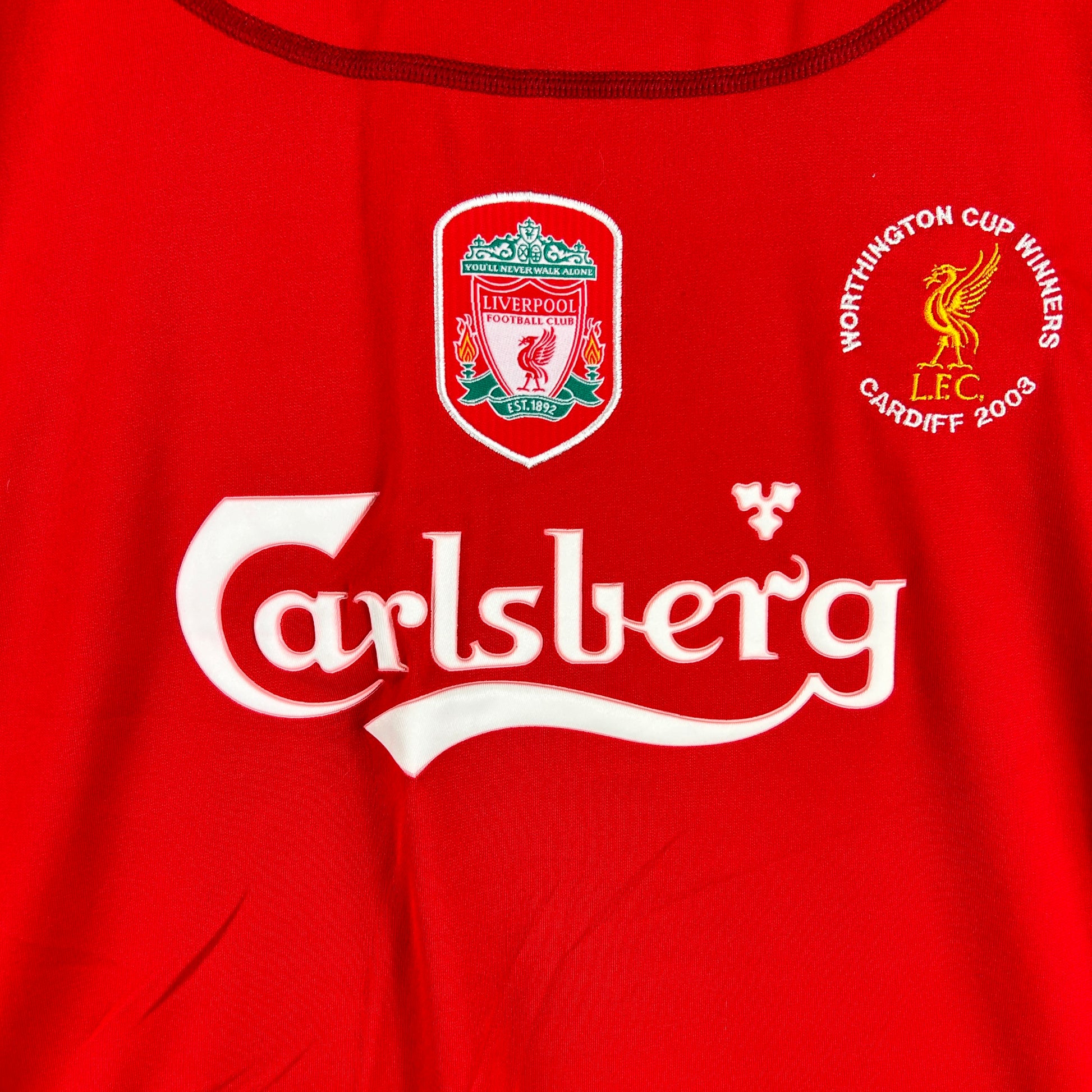 Shirt info: The 2002-2004 home shirt Liverpool wore in the Worthington Cup final. The shirt features a Liverpool badge and an embroidered LFC badge with the Worthington Cup final detailed around it. The Reebok logo is centred. The 'Carlsberg' sponsor is embossed felt.