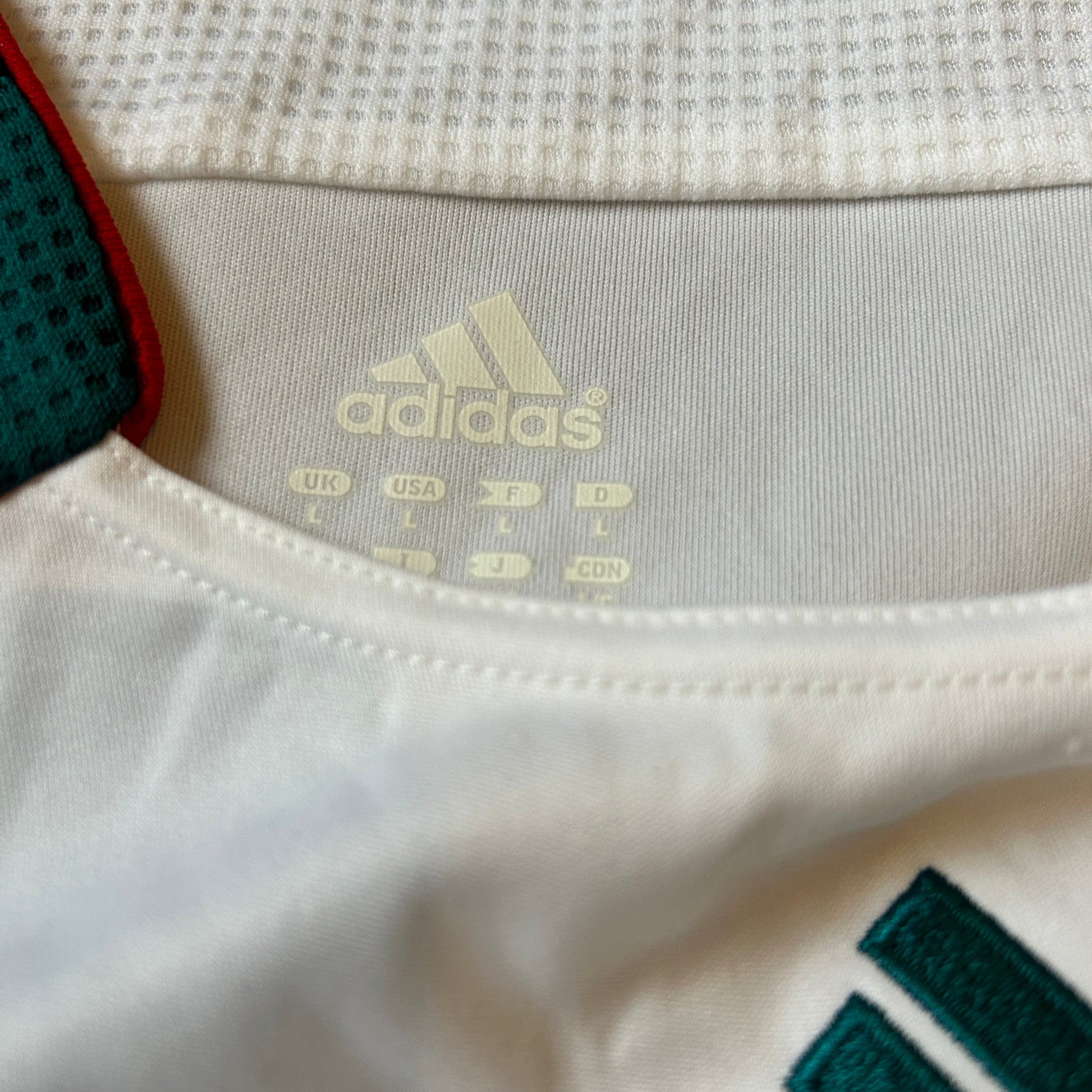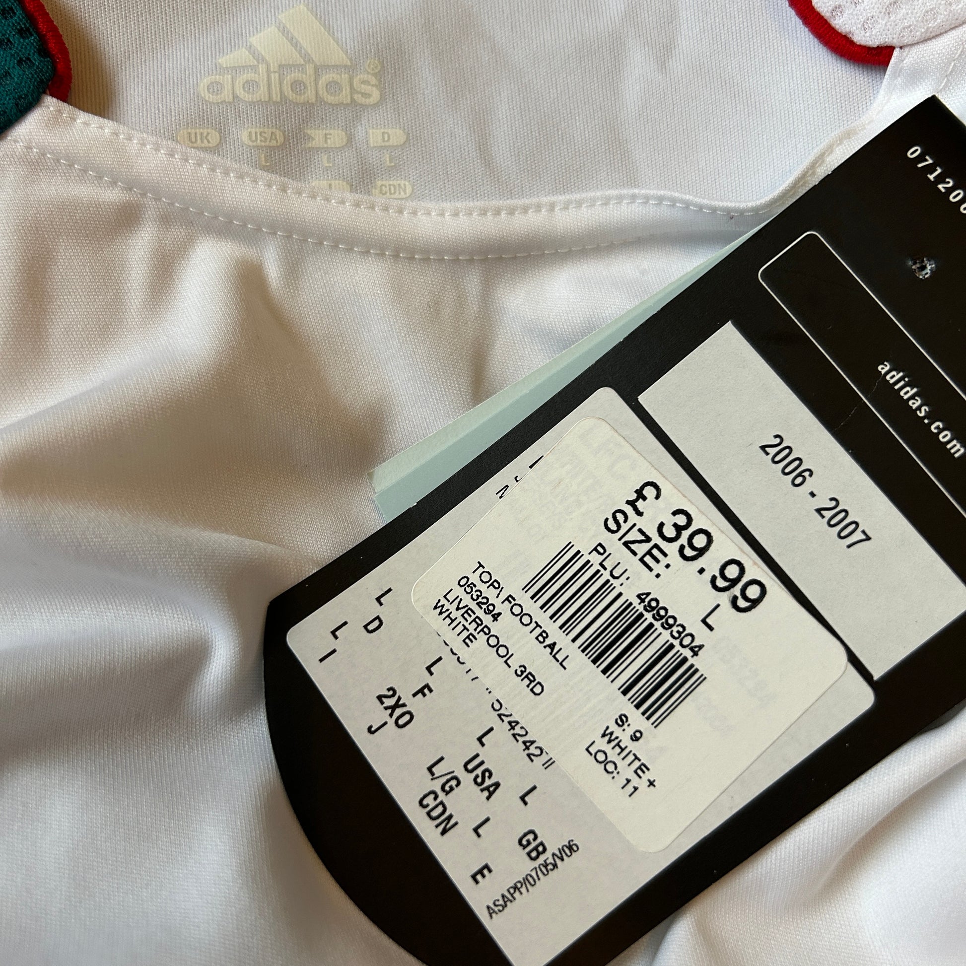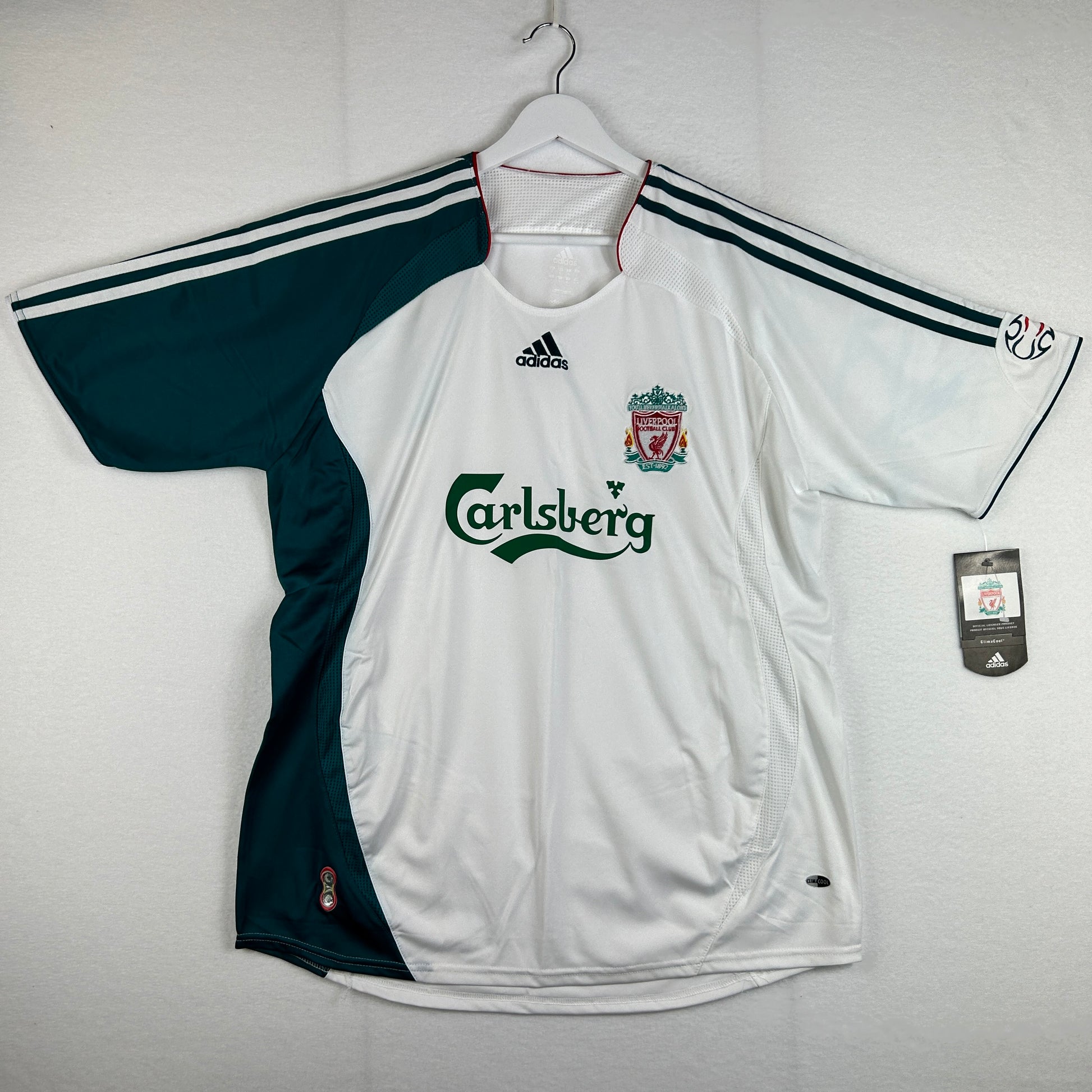 Shirt Info: The white Liverpool third shirt worn during the 2006-2007 season as part of the Adidas Teamgeist range. The shirt features the Adidas hologram on the lower front, the Teamgeist logo on the sleeve, and red trim on the collar. The Adidas logo is embroidered in green in the middle of the shirt, and the Liverpool badge is embroidered. The Carlsberg sponsor is printed in green. The Adidas stripes are green.