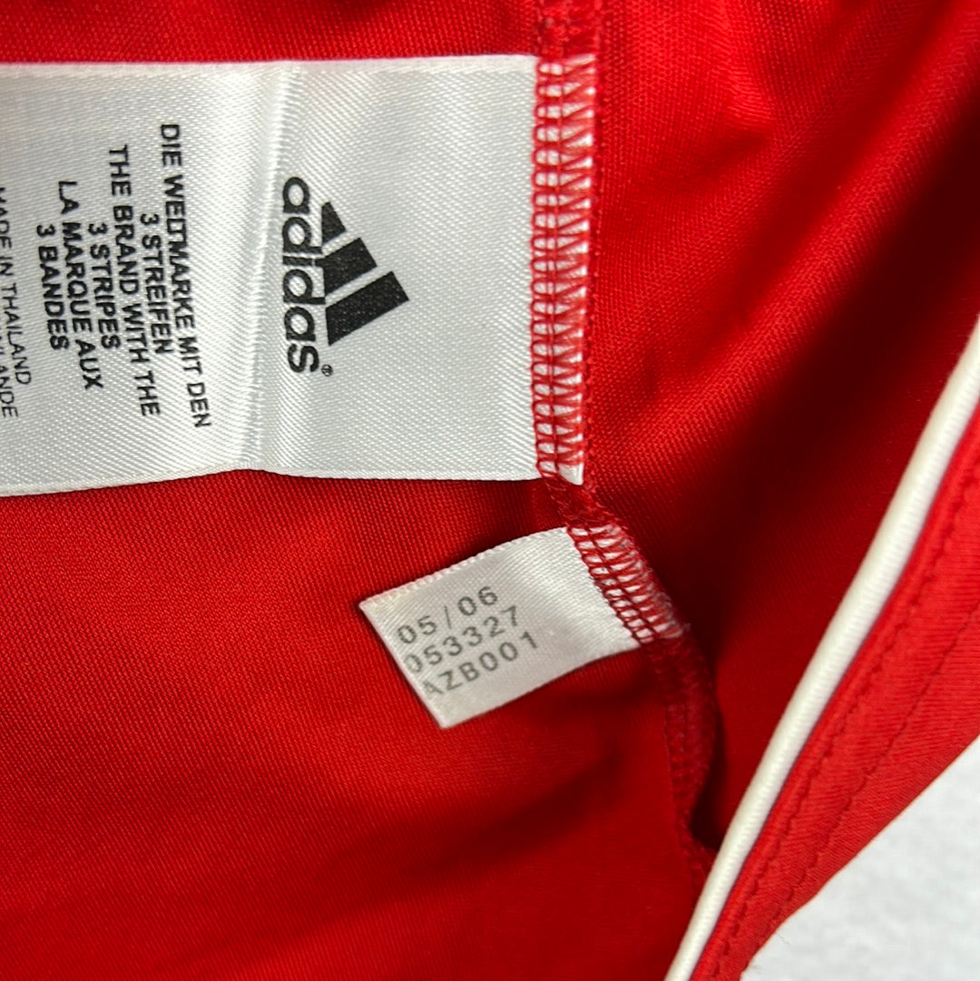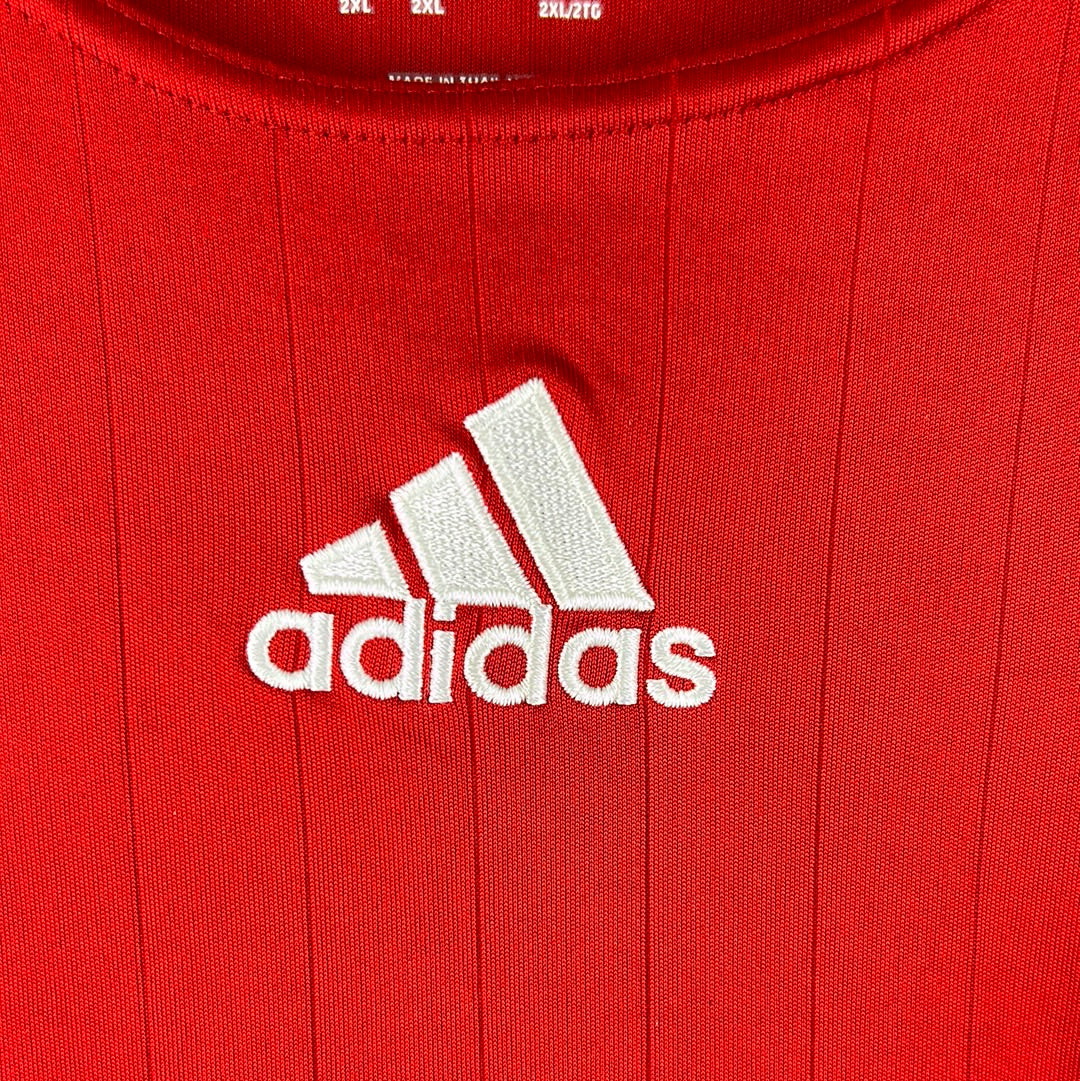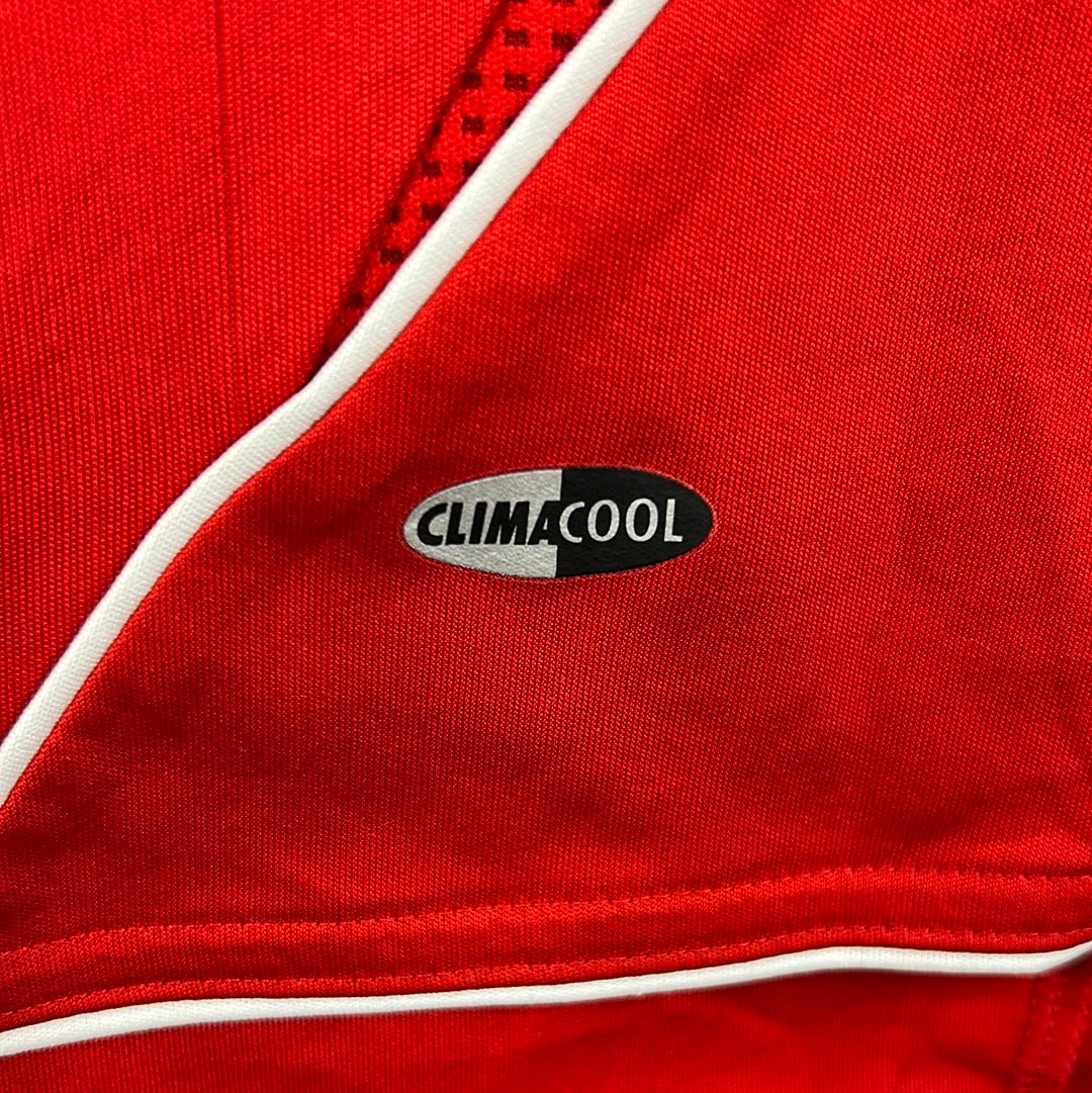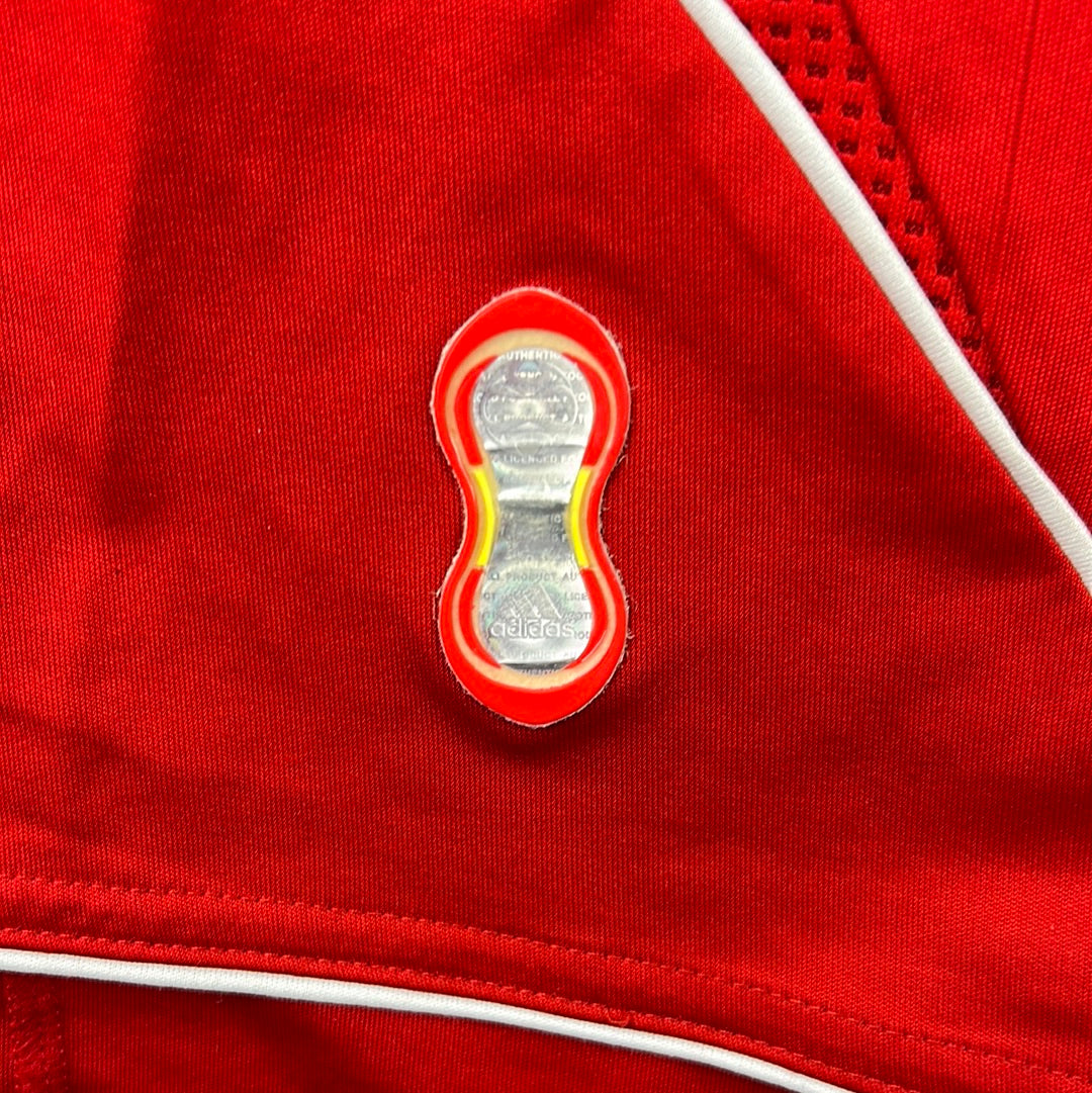 Shirt info: A red Liverpool home shirt from the Temgesit Adidas range, launched in 2006 for the 2006-2007 and 2007-2008 seasons. The Adidas logo is embroidered in white in the centre of the shirt and the Liverpool badge is also embroidered. The 'Carlsberg' sponsor is printed in white with the Adidas hologram on the lower front. Adidas Climacool print on the lower front.