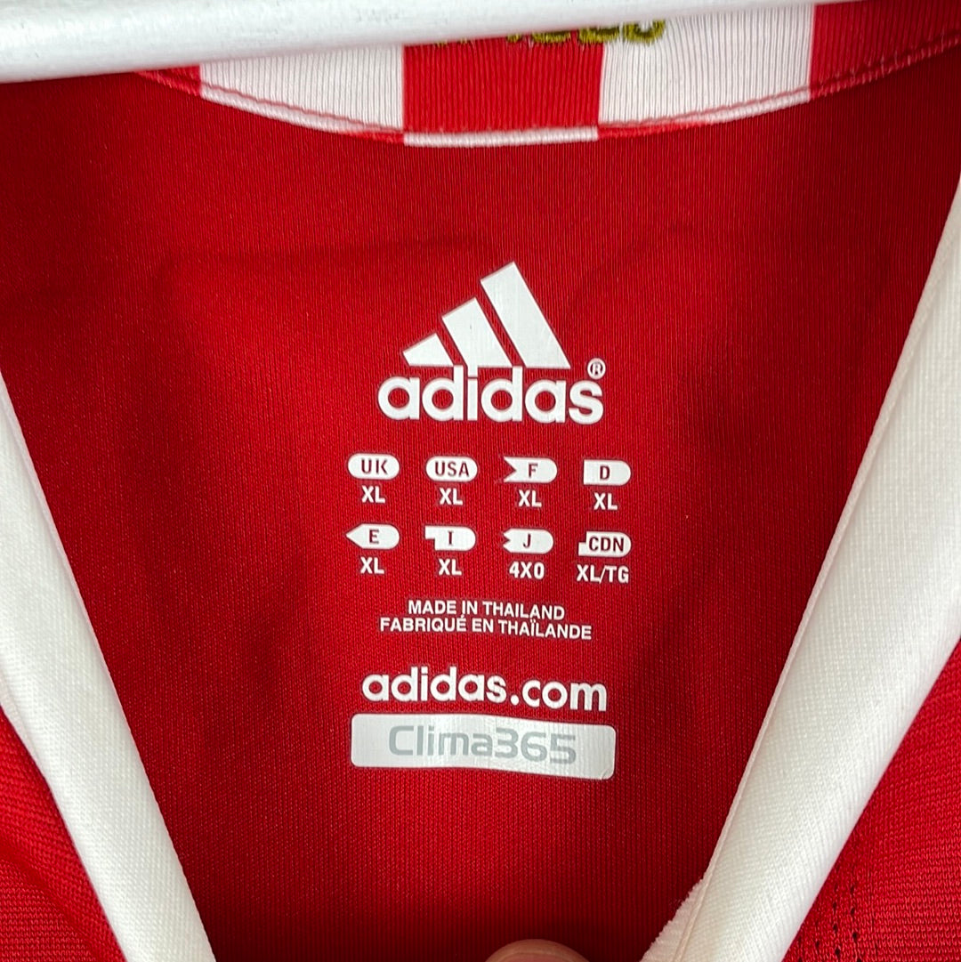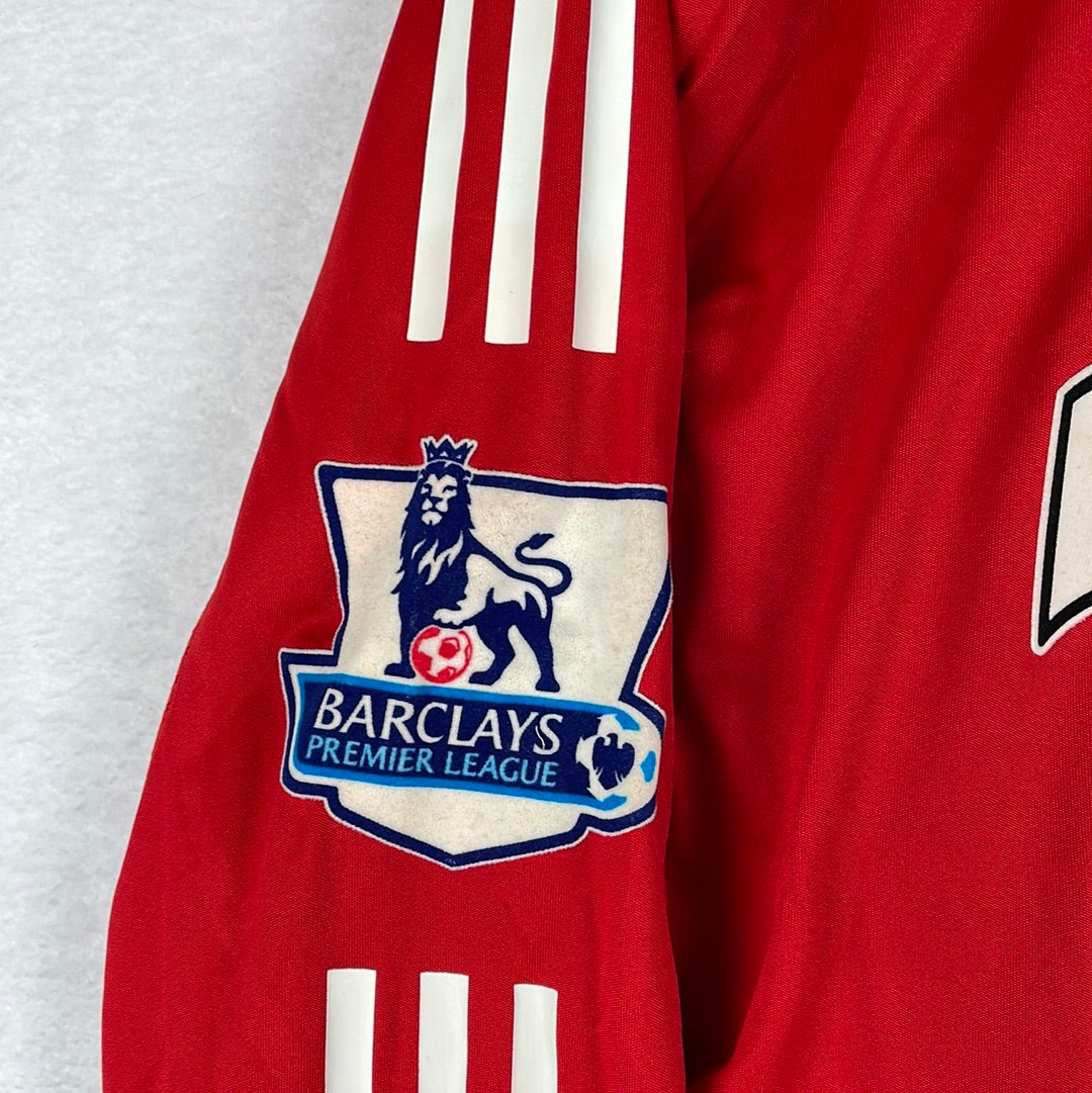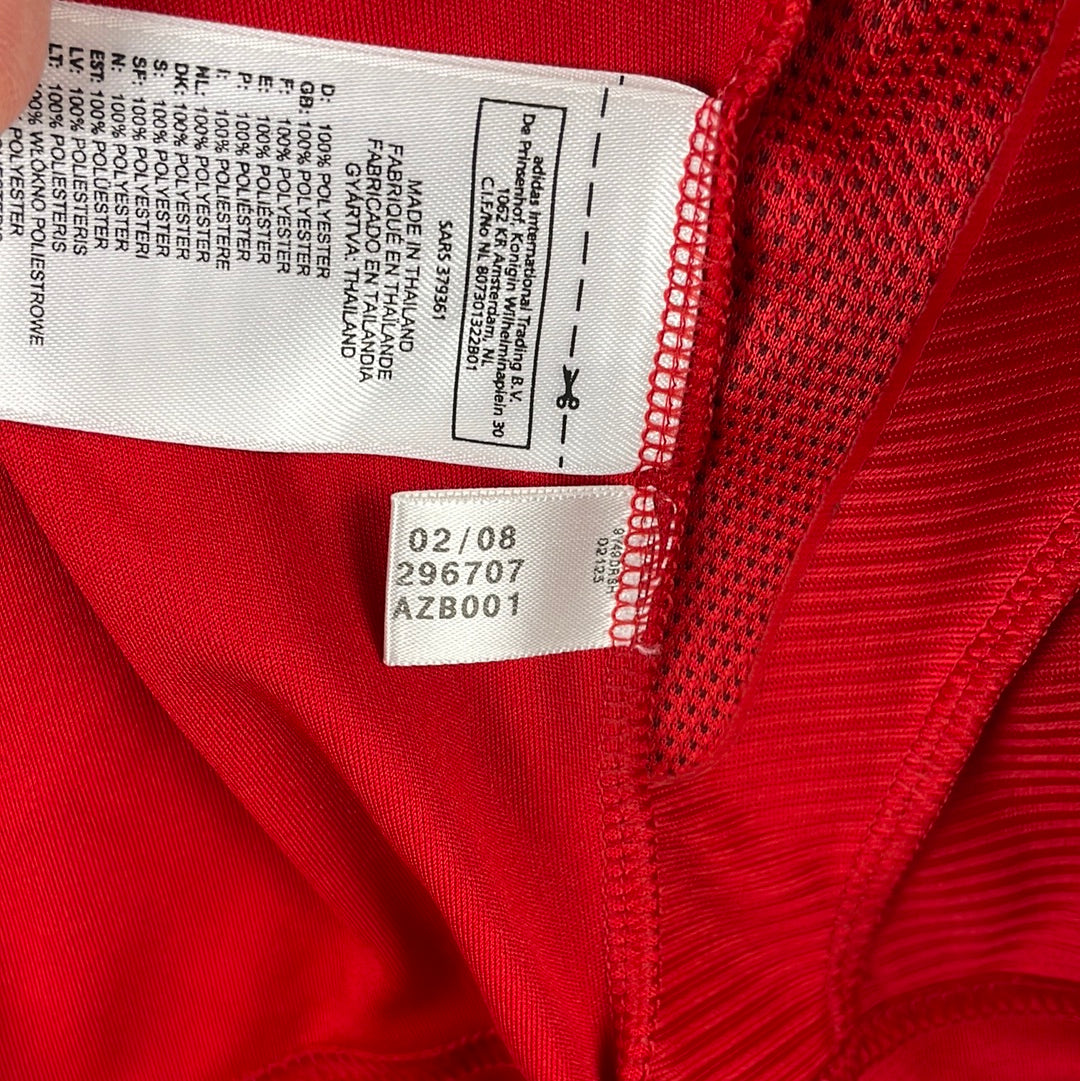 A player issue Adidas home shirt from the 2008/2009 season and the 2009/2010 season. Skrtel 37 Premier LEague print. This is a player-issue shirt, shown by the printed stripes with a gap to allow for the Premier League badge. The Adidas badge is also printed as correct for a 2008 player shirt.