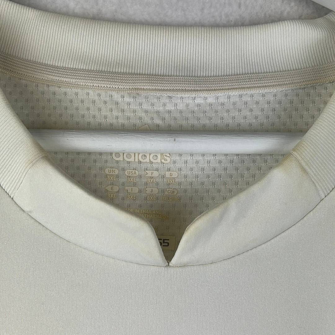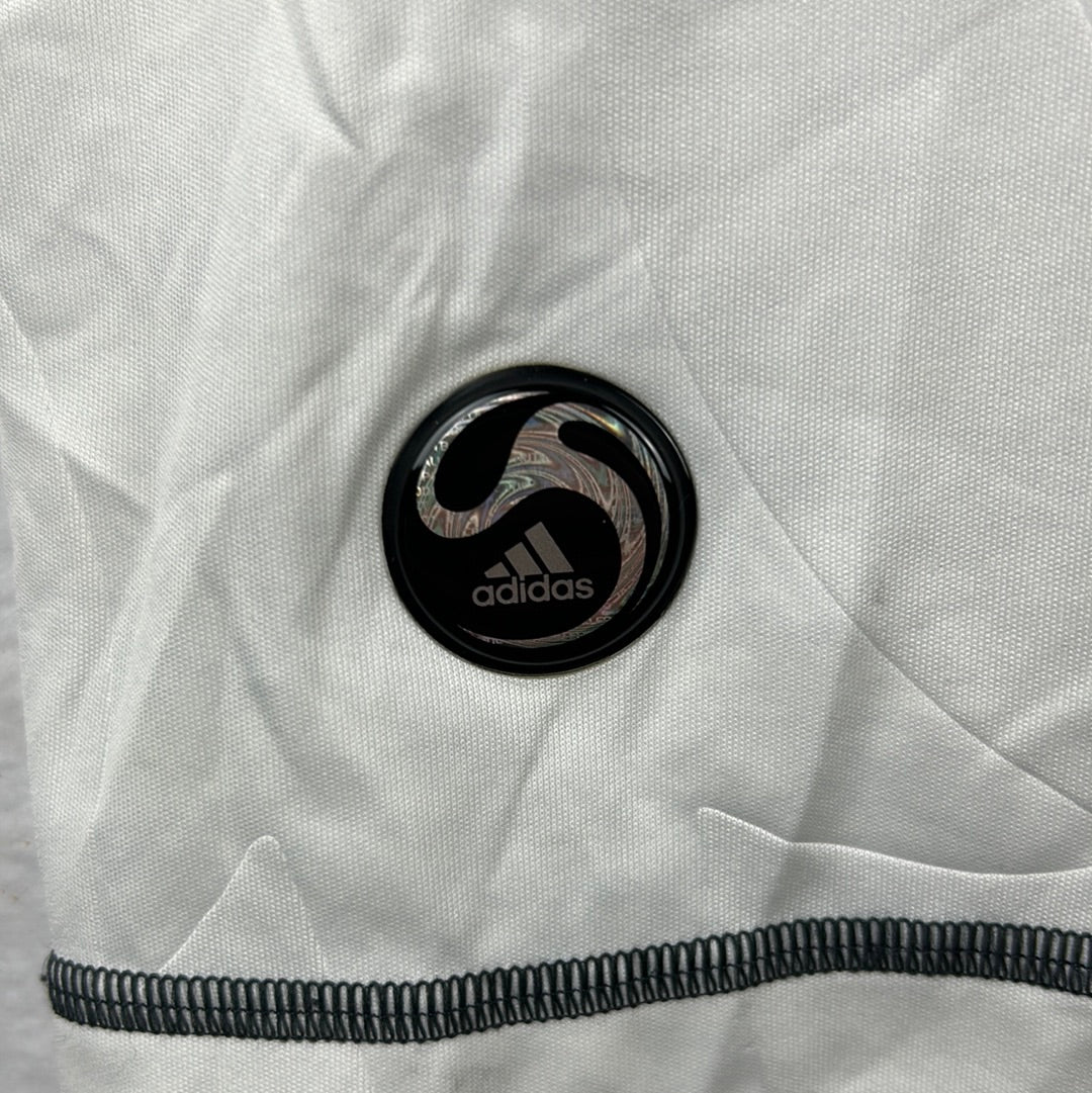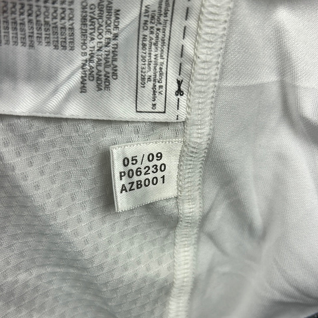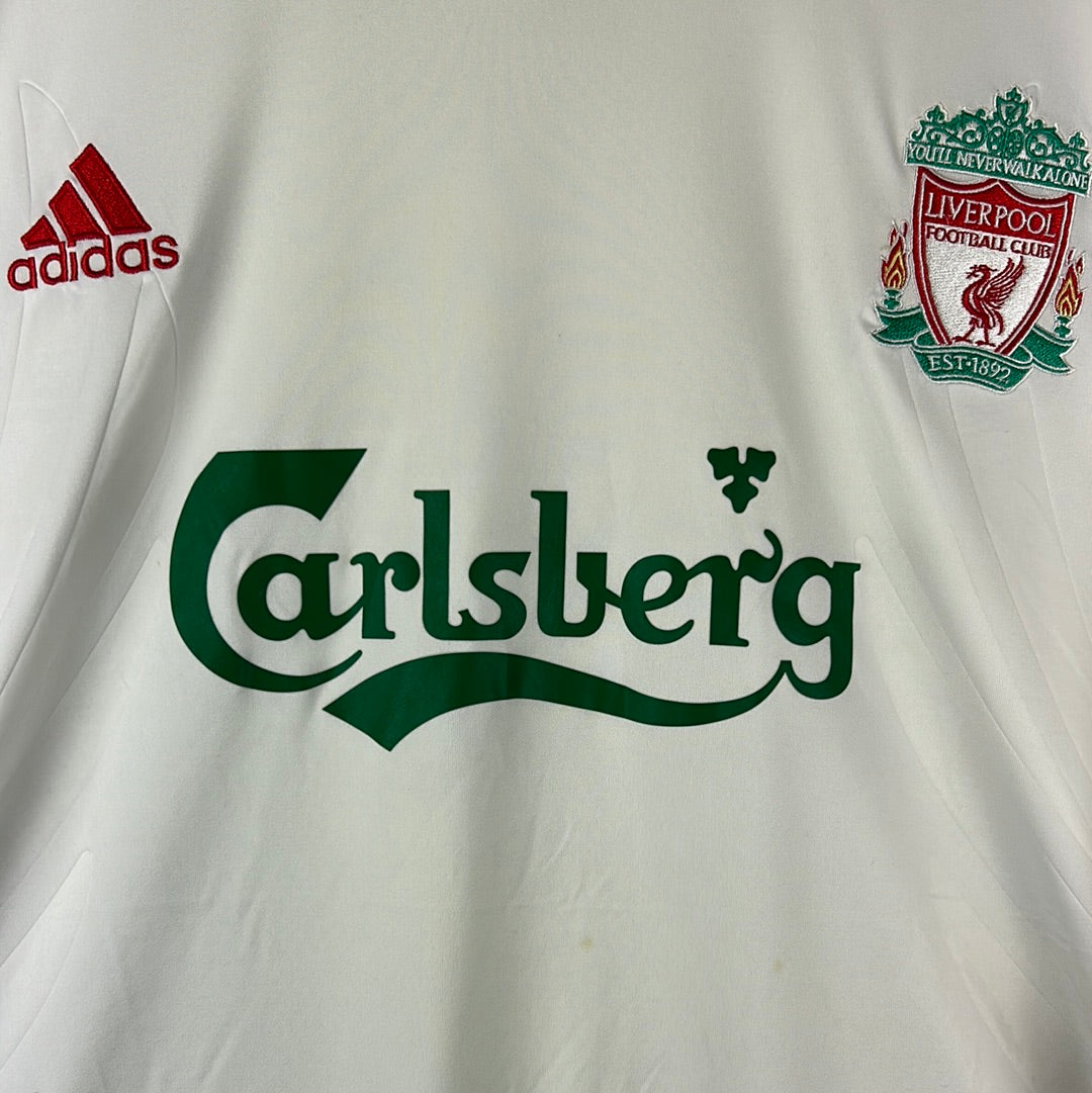 Shirt Info: The 2009/2010 third shirt worn by Liverpool which was part of the Adidas Teamgeist range, there is an Adidas hologram on the lower front. The shirt features; a white round neck, the Adidas logo embroidered in red, and the Liverpool badge is embroidered. The Carlsberg sponsor is printed in green. The Adidas stripes are red and on the shoulders and the end of the sleeves