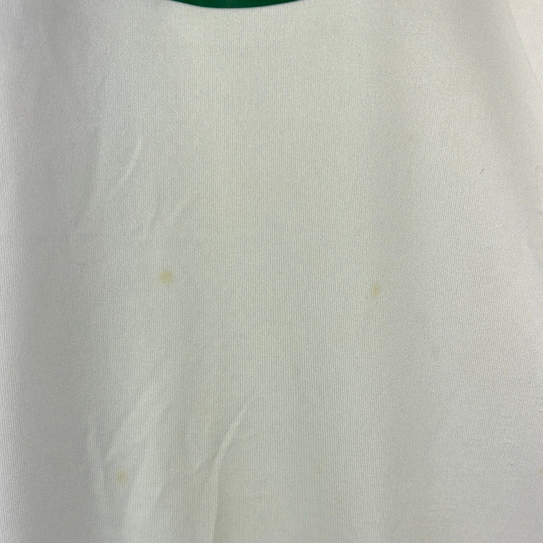 Condition Details: The neck size print is worn out. The shirt has some signs of wear and a small odd mark. The front sponsor has minor cracking.