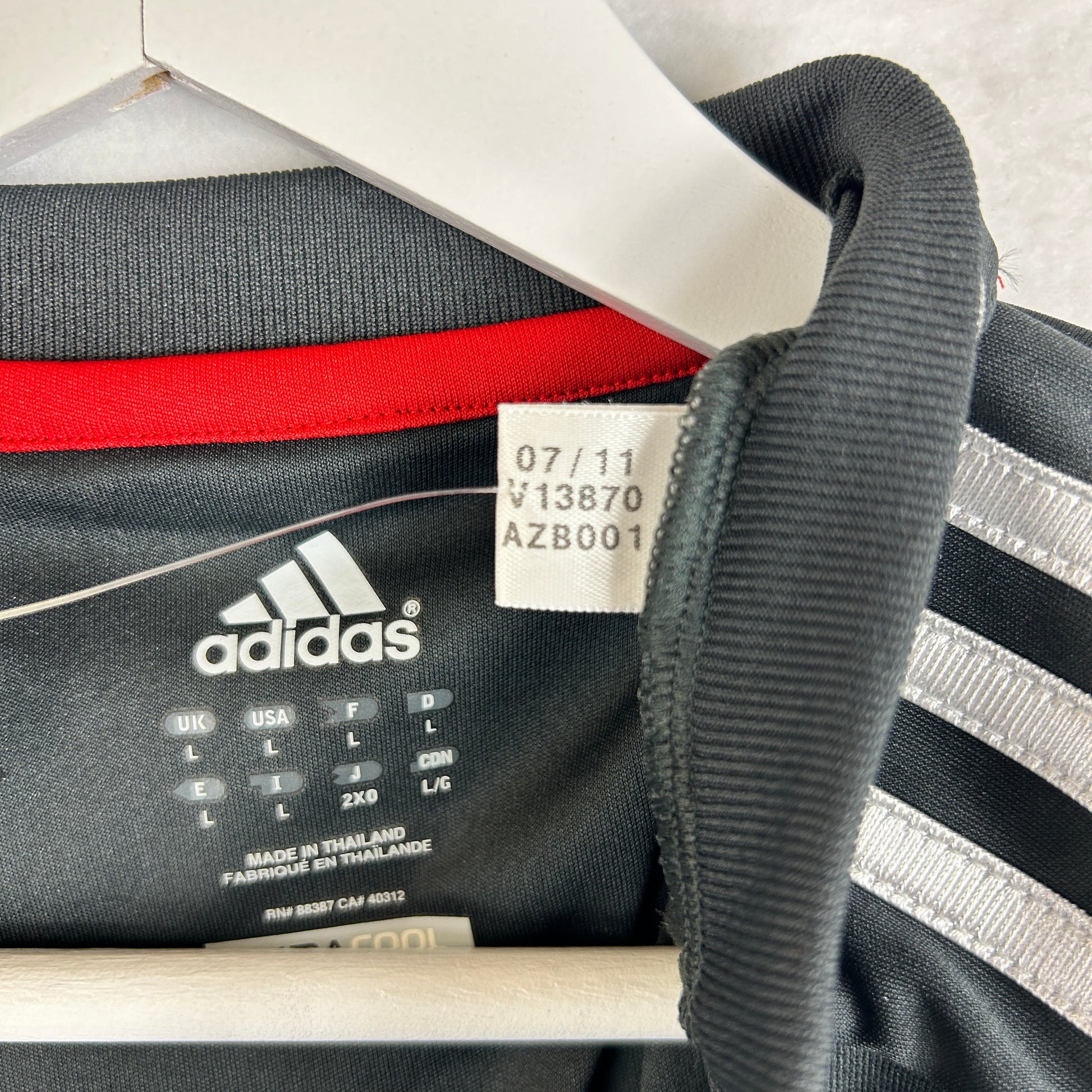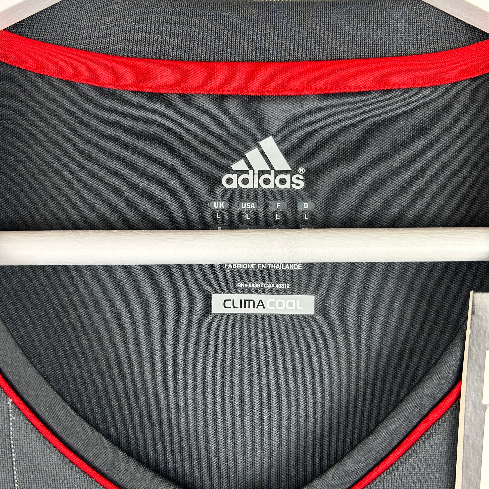 Shirt Info: This was the last season of the Adidas and Liverpool era. They finished with this black away shirt with a grey pinstripe. The shirt has a silver Standard Chartered sponsor.