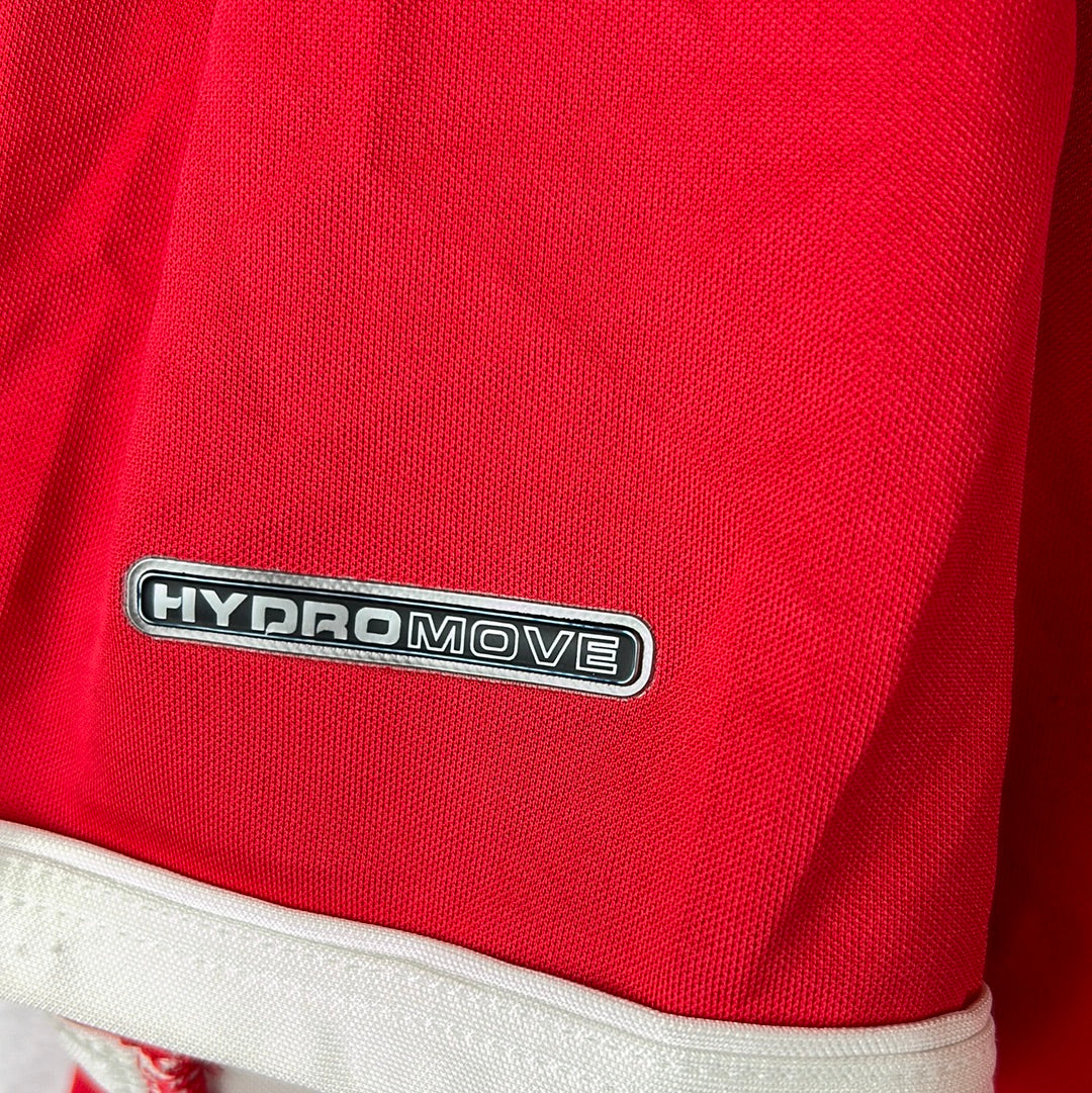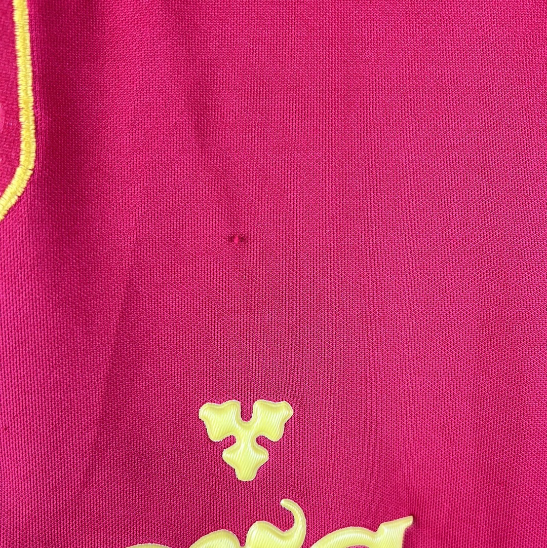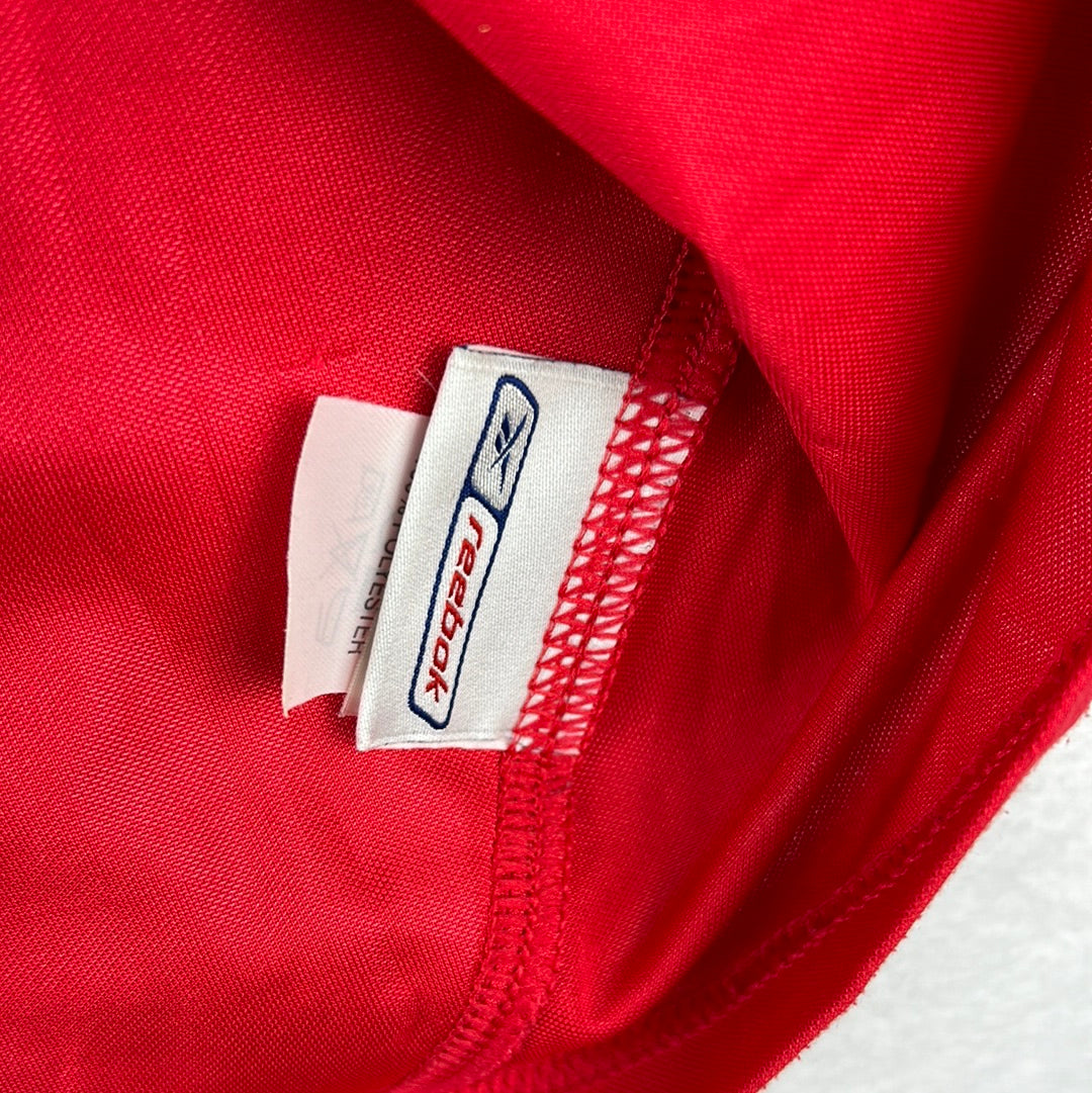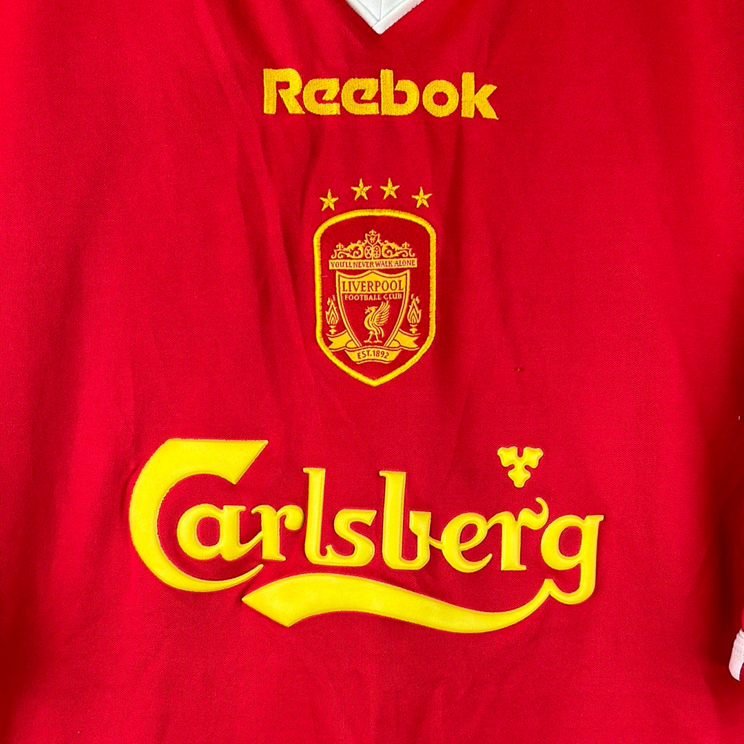 Shirt info: The Liverpool home shirt that was used in European competitions for two seasons from 2001-2003. The red shirt has a white neck line with a central Liverpool badge, an embossed 'Carlsberg' sponsor, and the printed Reebok logo. The European version has a yellow print rather than the standard white print.