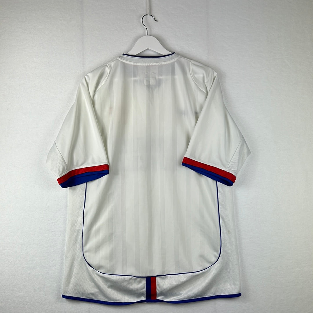 Shirt info: This is the 2003/2004 home shirt for Lyon in Ligue Un. It's a classic design with the red and blue stripe down one side and black Renault Trucks sponsorship on the front.