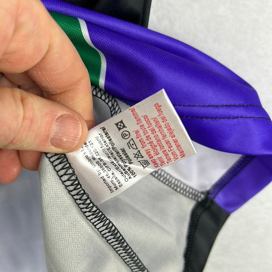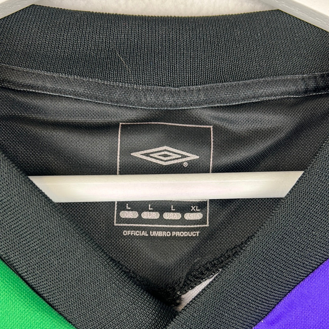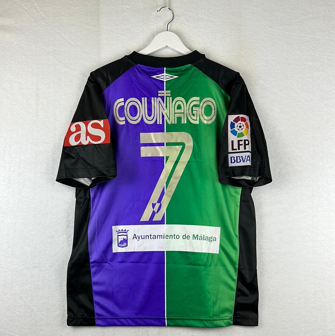 Shirt info: The green and purple panelled awat shirt worn by Malaga in the 2004-2005 Segunda Division season. This shirt was worn by Counago during the away match vs Almeria in the Kings Cup on 4/10/2006. The shirt has an embroidered Umbro logo and Malaga badge, with a printed 'LFP' 'BBVA' and 'AS' sleeve patches. This is a sponsorless shirt. 'Counago 7' is printed in silver plastic flock on the back.