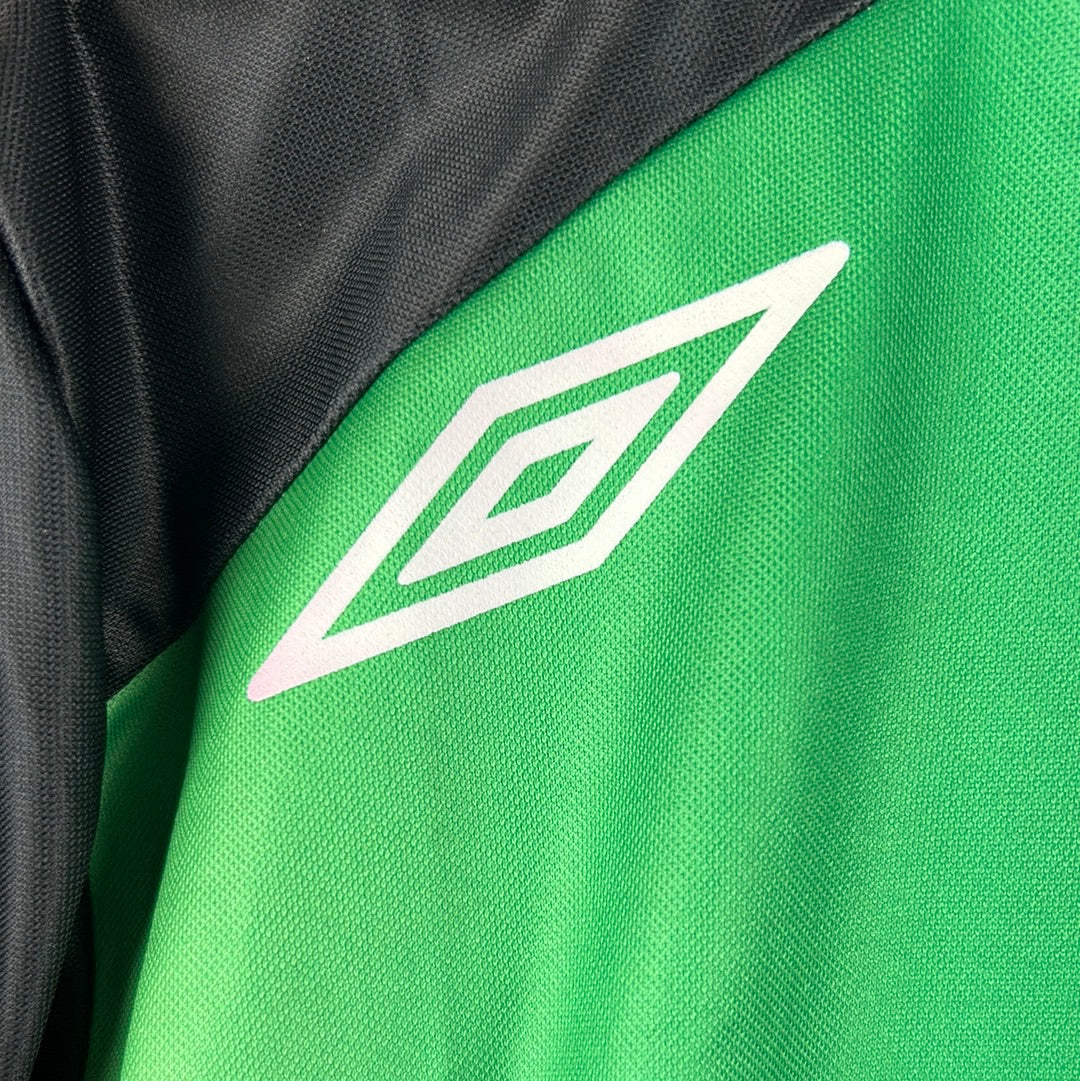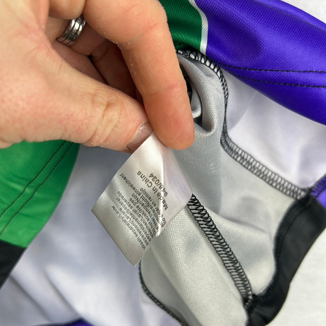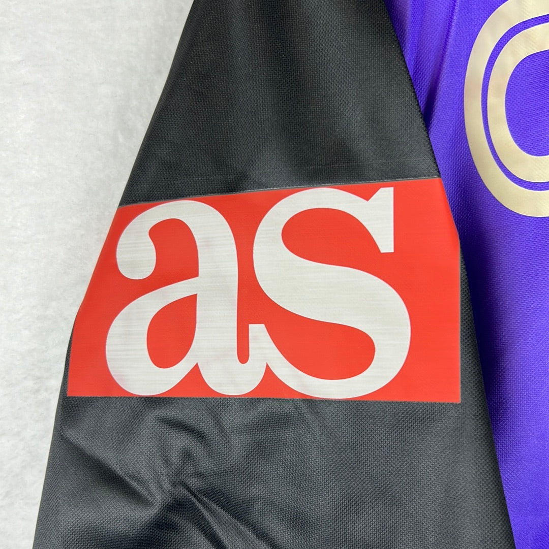 Shirt info: The green and purple panelled awat shirt worn by Malaga in the 2004-2005 Segunda Division season. This shirt was worn by Counago during the away match vs Almeria in the Kings Cup on 4/10/2006. The shirt has an embroidered Umbro logo and Malaga badge, with a printed 'LFP' 'BBVA' and 'AS' sleeve patches. This is a sponsorless shirt. 'Counago 7' is printed in silver plastic flock on the back.