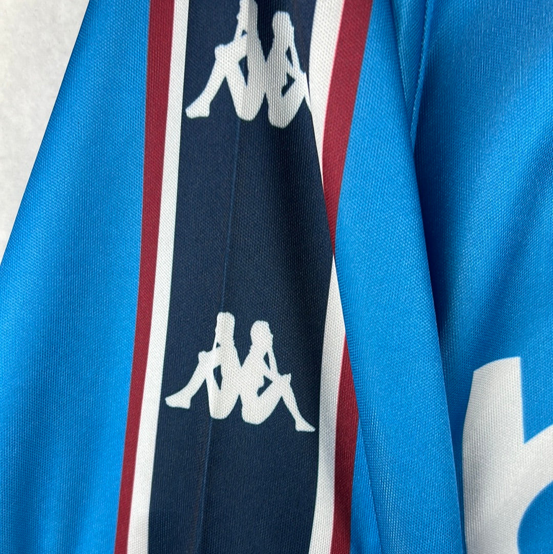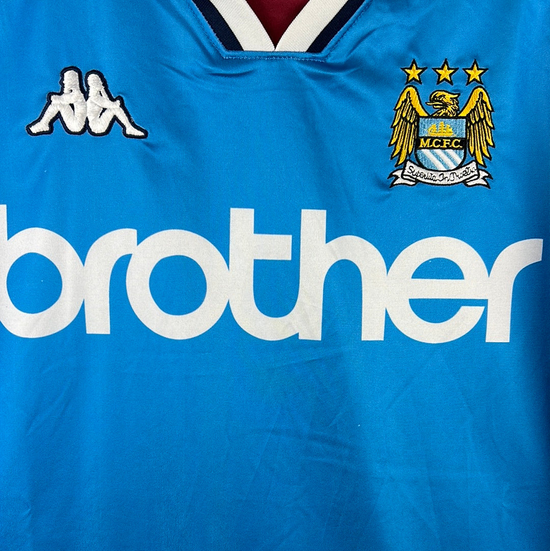 Shirt info: The home shirt from the 1997-1999 seasons. A sky blue shirt. This has an embroidered City badge and Kappa logo. The 'Brother' sponsor is sublimated.