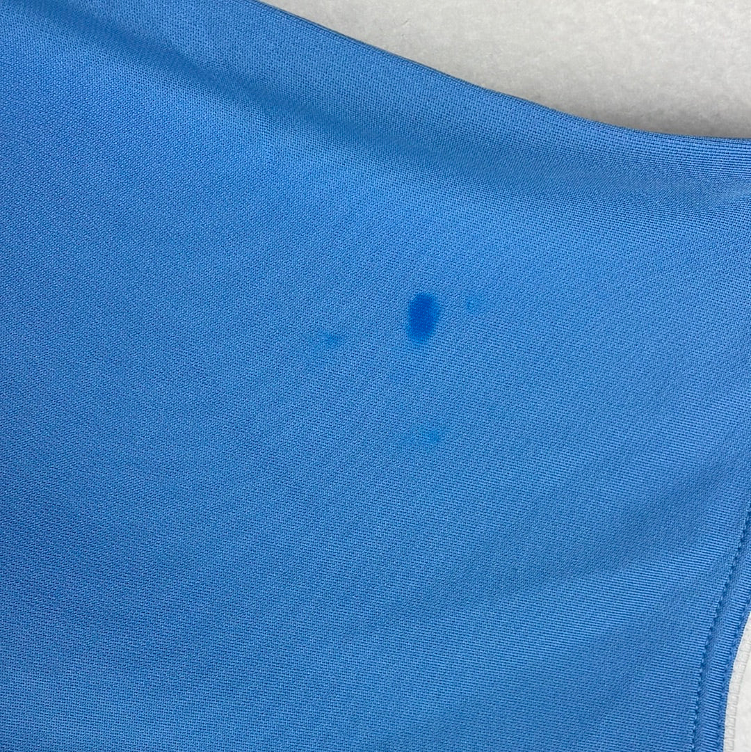 Condition Details: The shirt material is in excellent condition with an odd mark. There is some slight cracking to the front sponsor.
