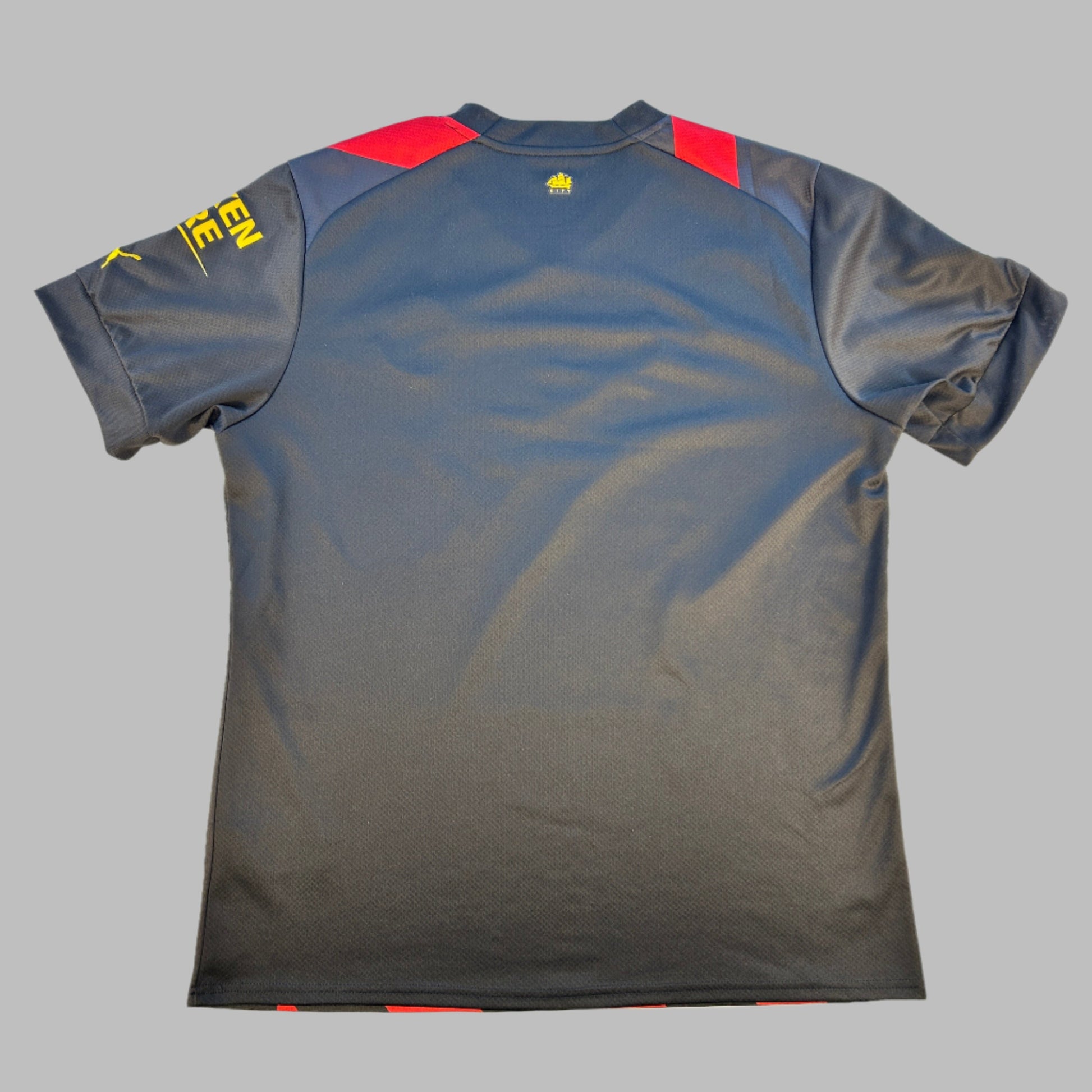 Shirt info: This is the away shirt for Manchester City in the 22/23 season, a red and black striped shirt. Umbro first used this colour for Manchester City in the 1990/1991 season and has been used a number of times since.