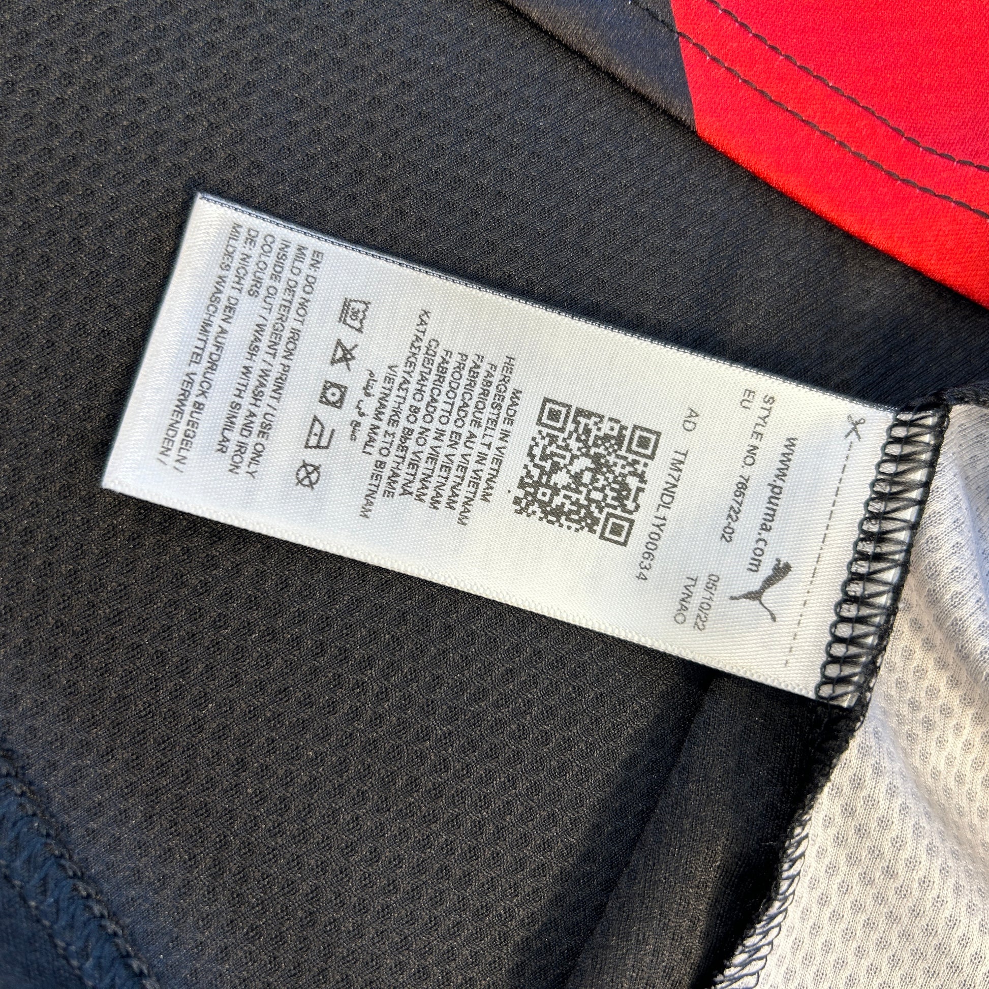 Authentic? Yes, this is an authentic Puma shirt with the correct front authentic patch, inside labels, and the QR code.