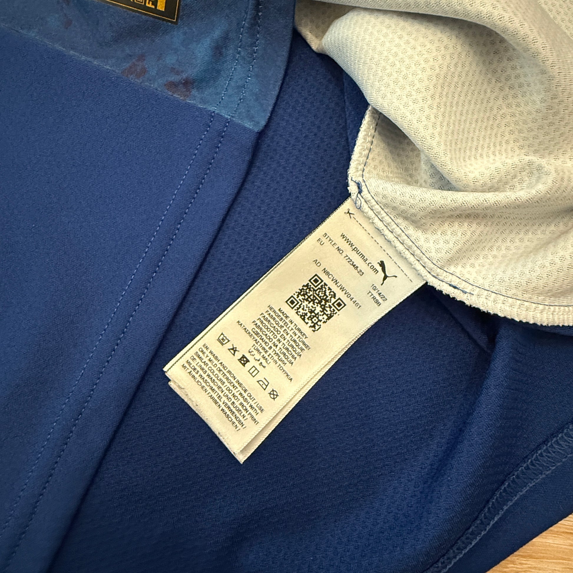 Authentic? Yes, this is an authentic Puma shirt with the correct front authentic patch, inside labels, and the QR code.