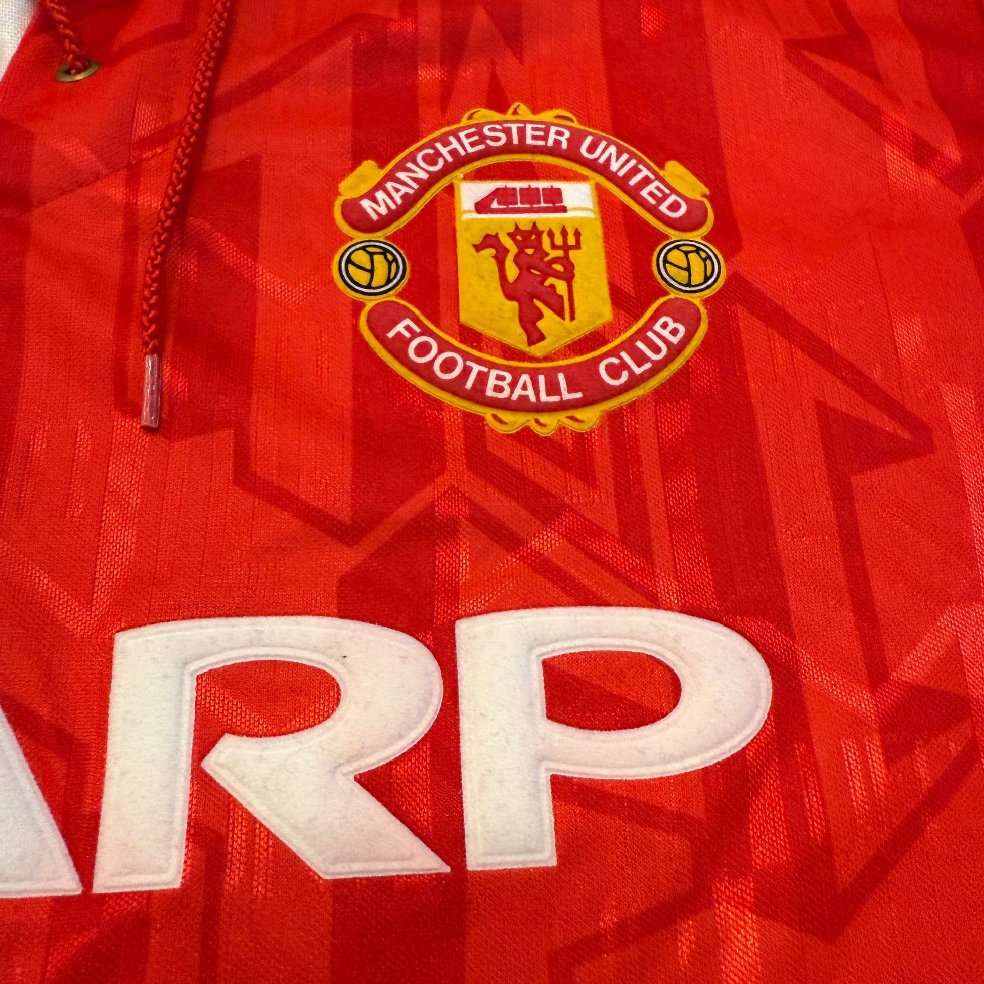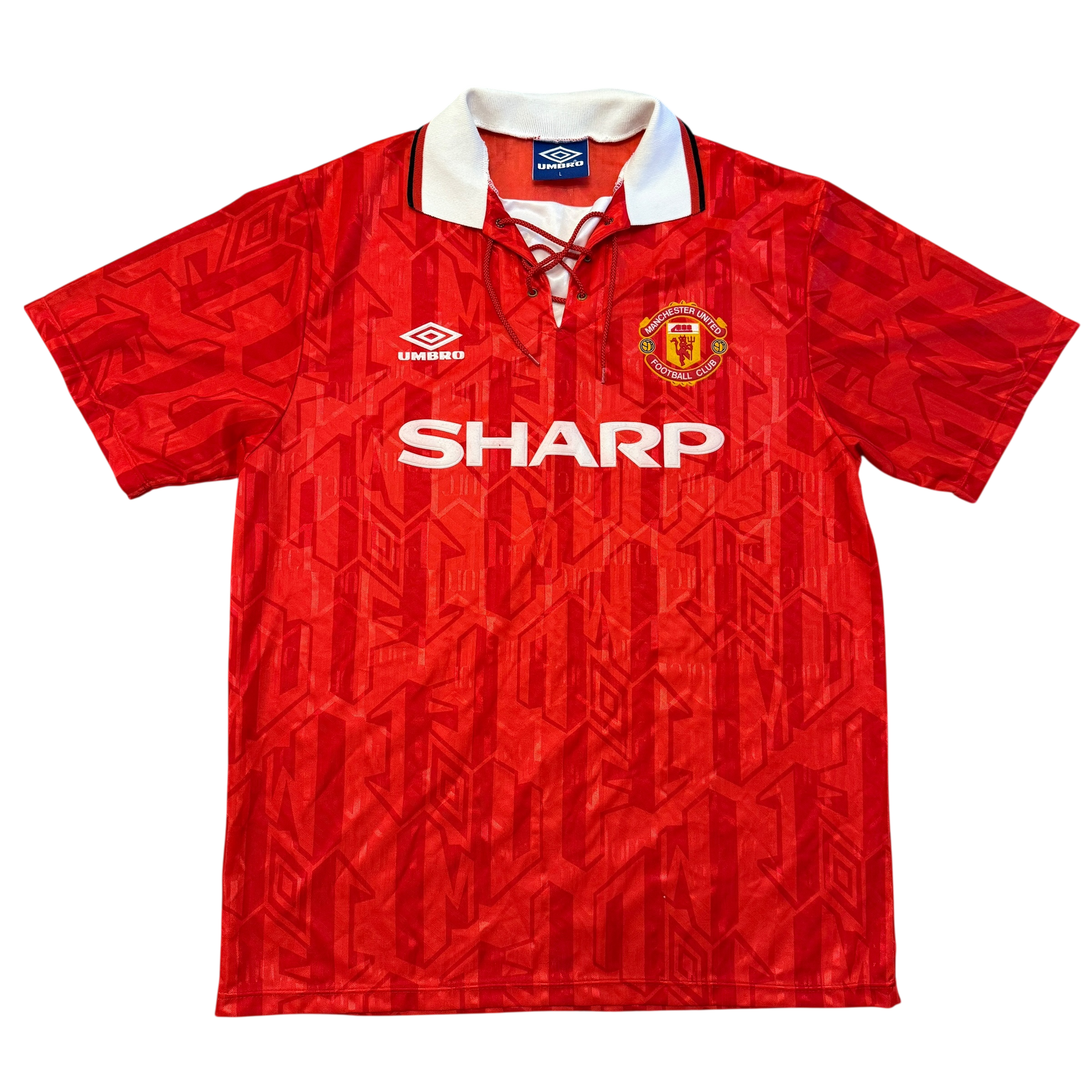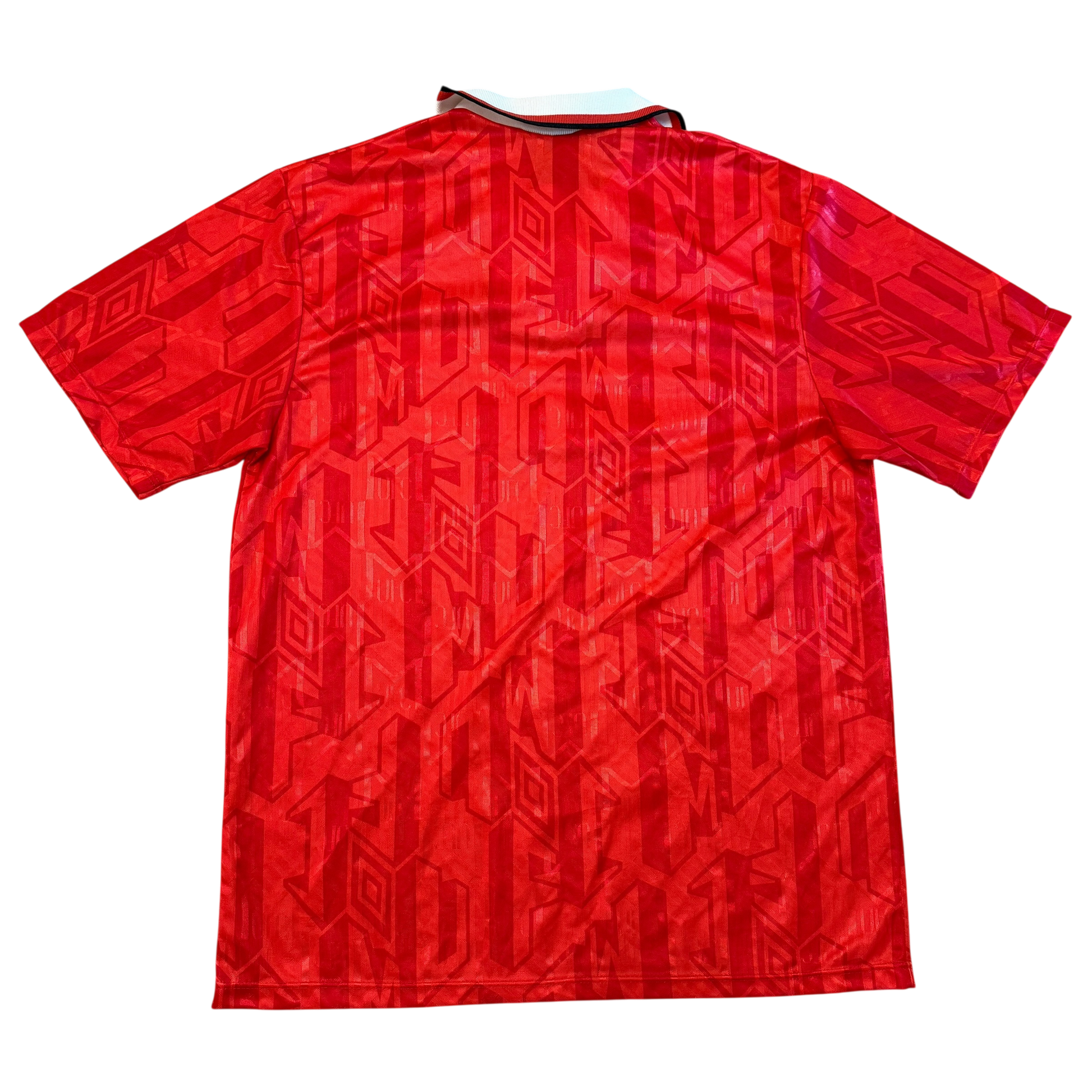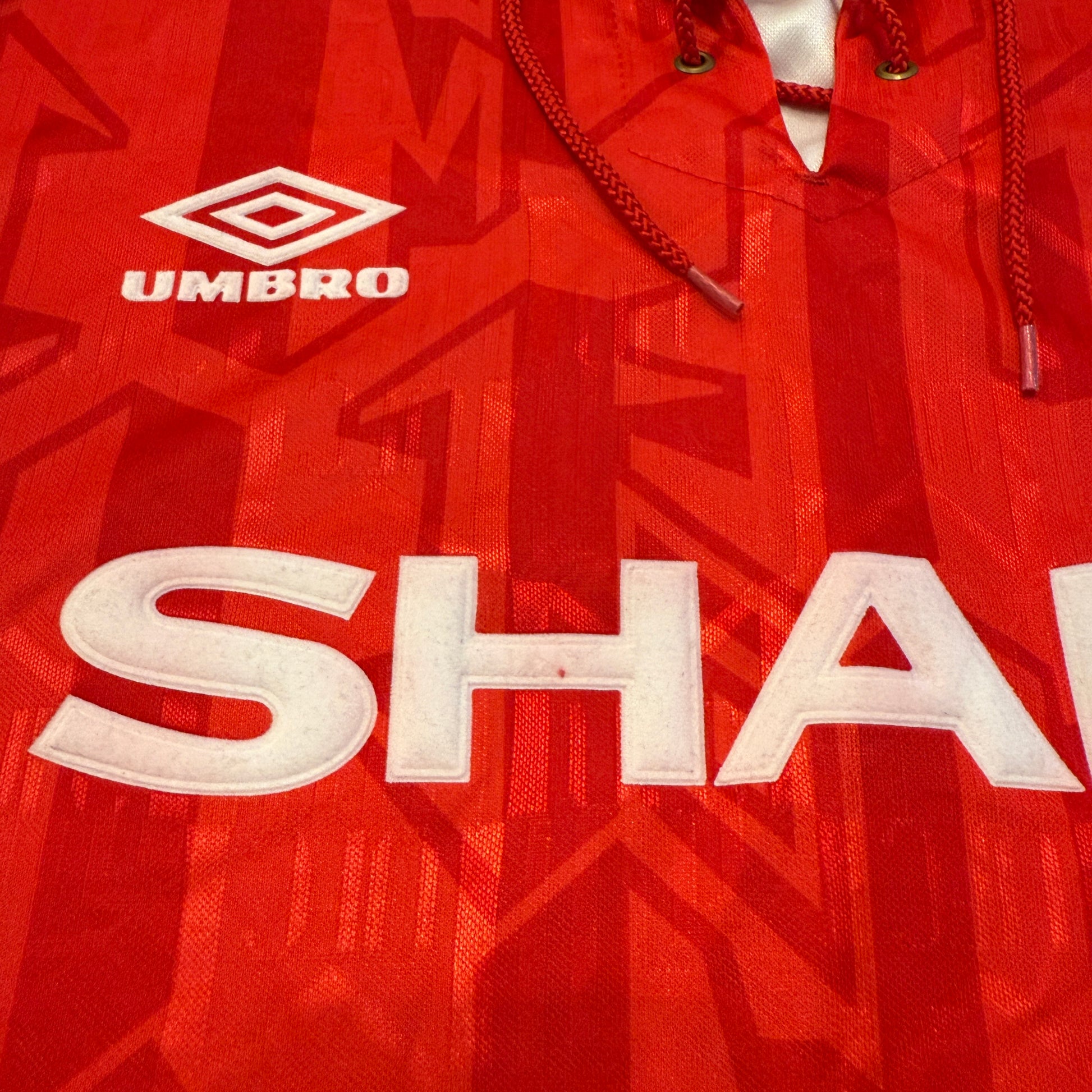 Shirt info: The 1992/1993 and 1993/1994 seasons' home shirt. The first United shirt from this period with Umbro. The material has MUFC in the design.