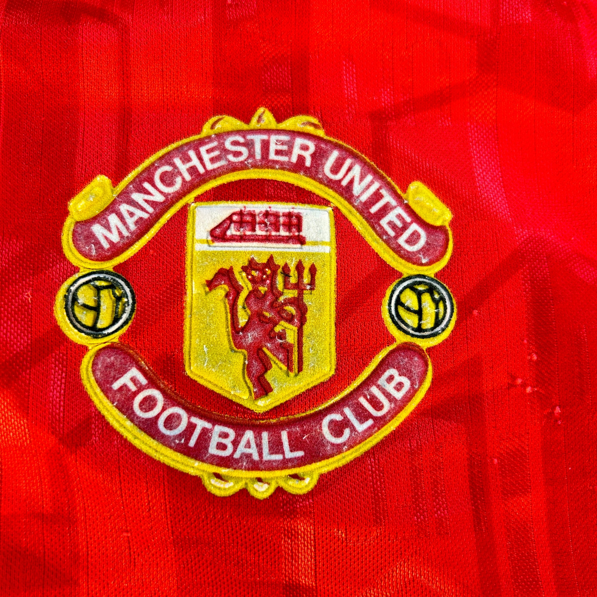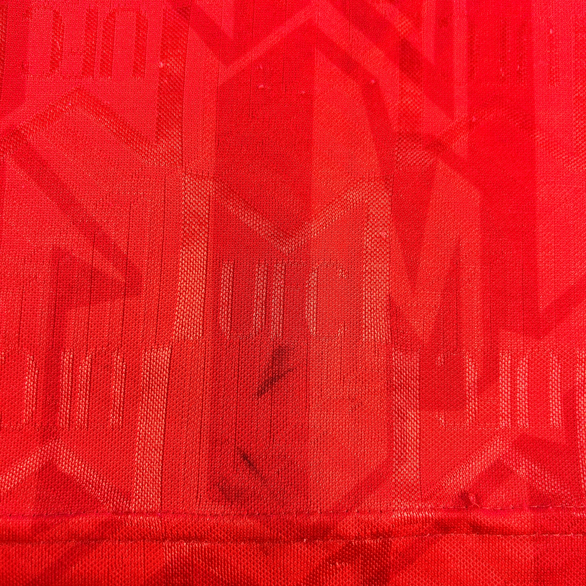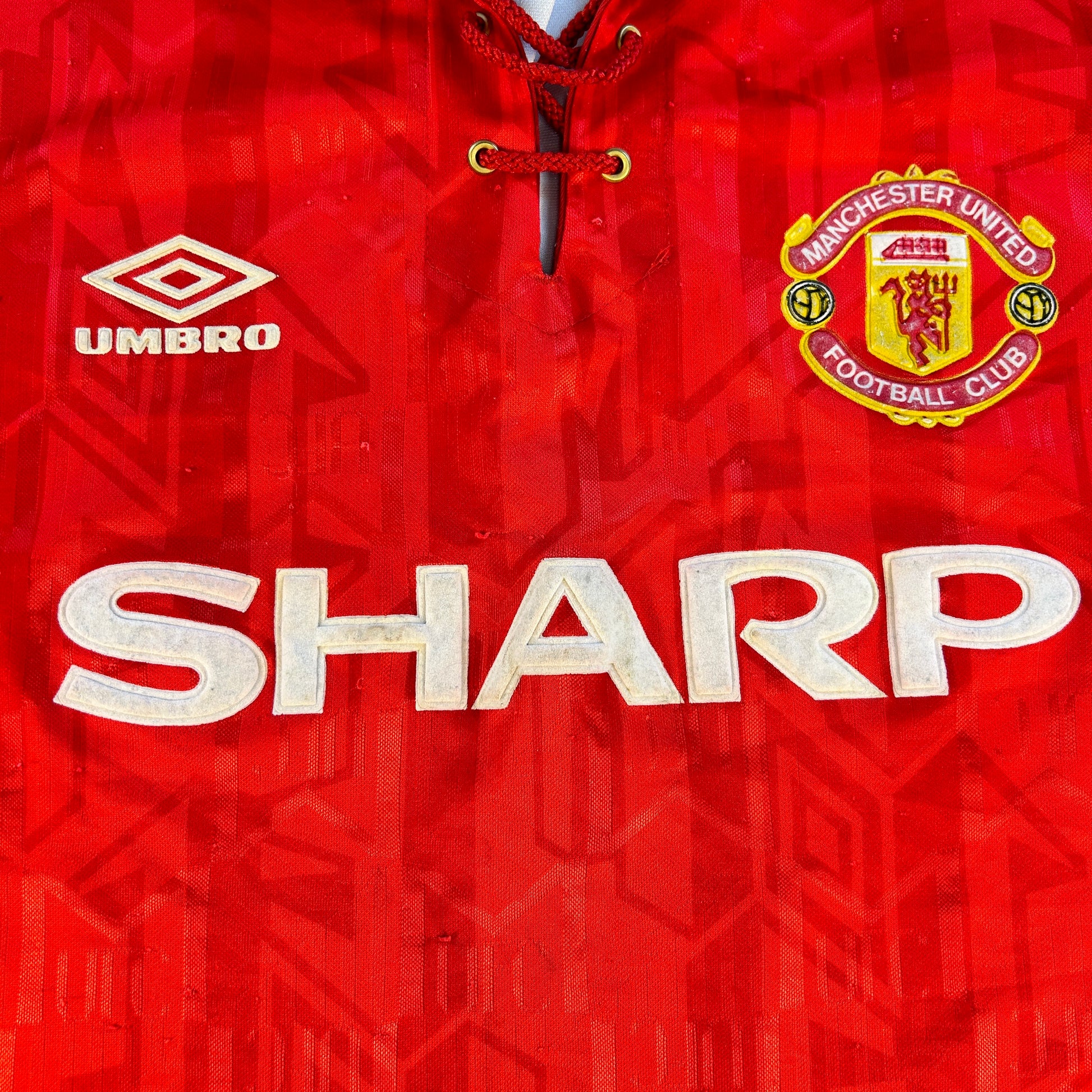 Shirt info: This is the 1992/1993 and 1993/1994 seasons' home shirt. It is the first United shirt from this period with Umbro. The material has MUFC in the design. It is a classic 90s home shirt.
