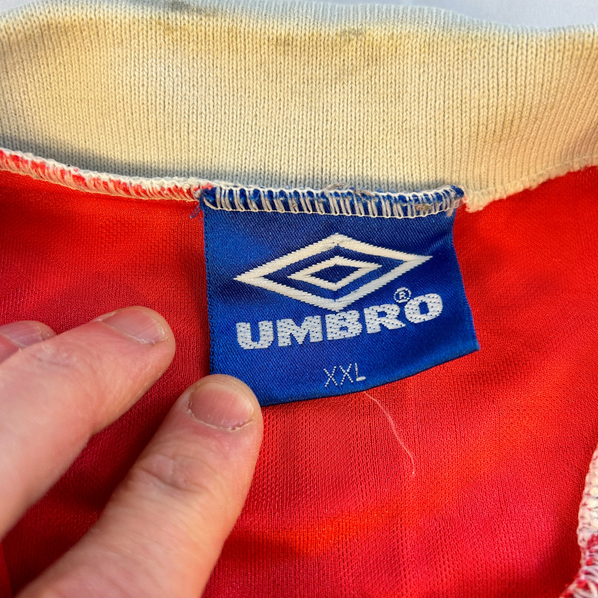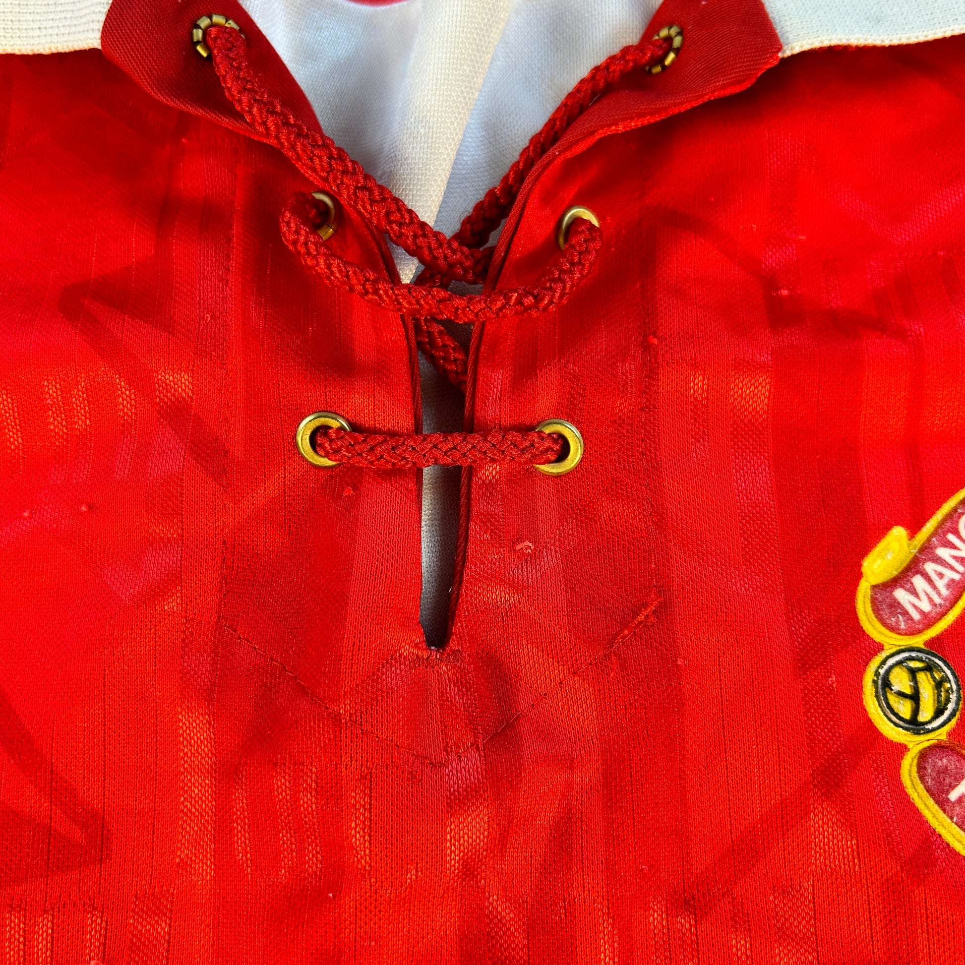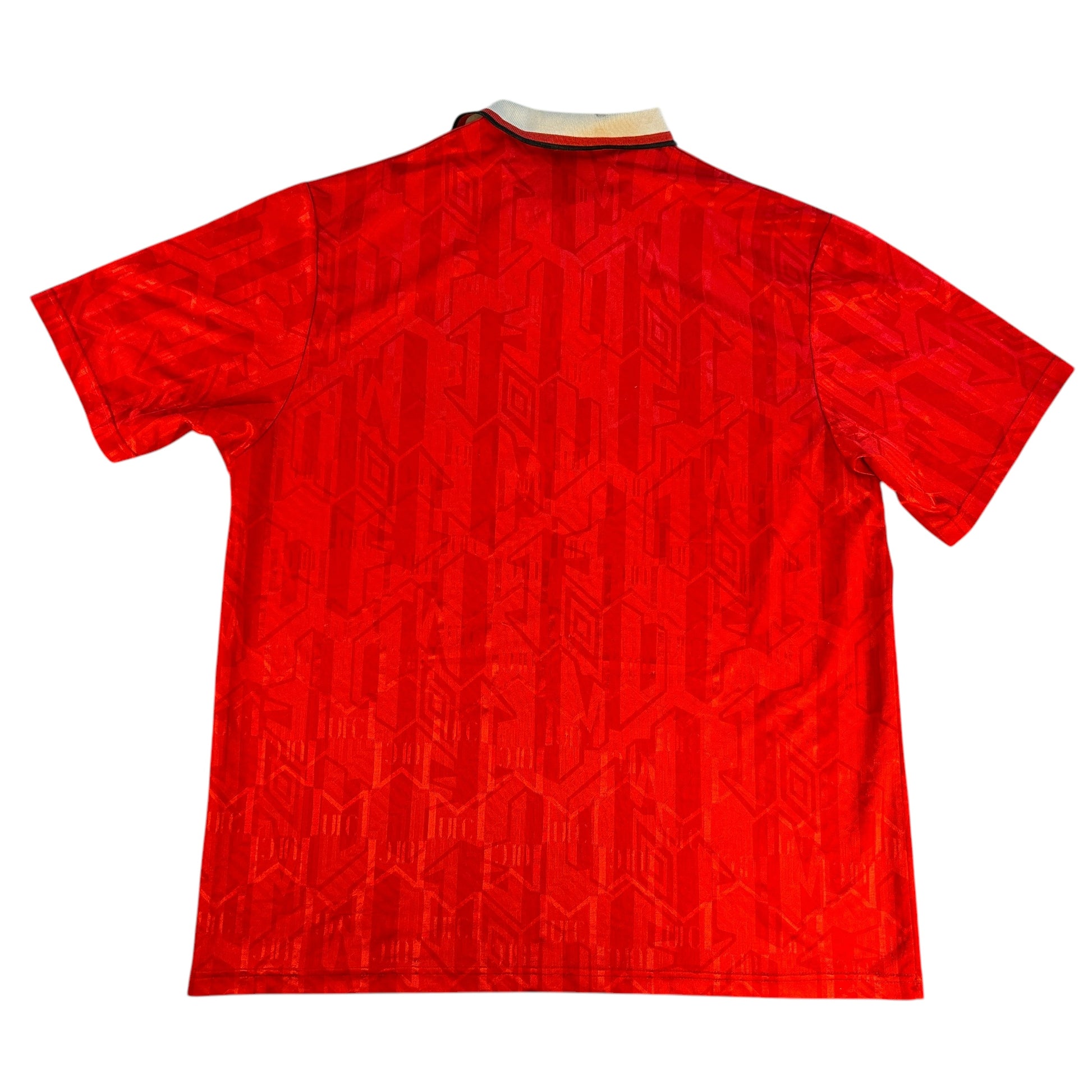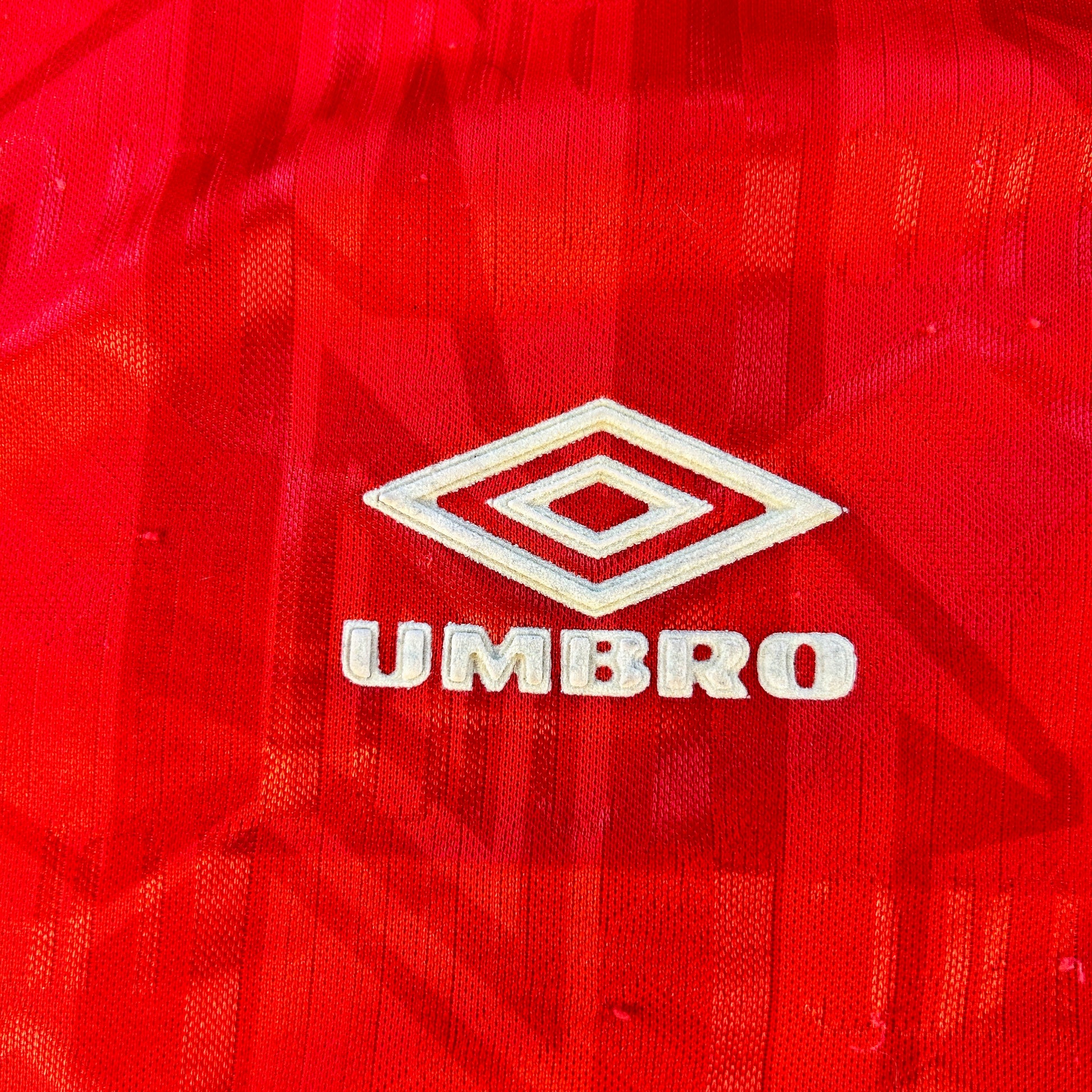 Shirt info: This is the 1992/1993 and 1993/1994 seasons' home shirt. It is the first United shirt from this period with Umbro. The material has MUFC in the design. It is a classic 90s home shirt.