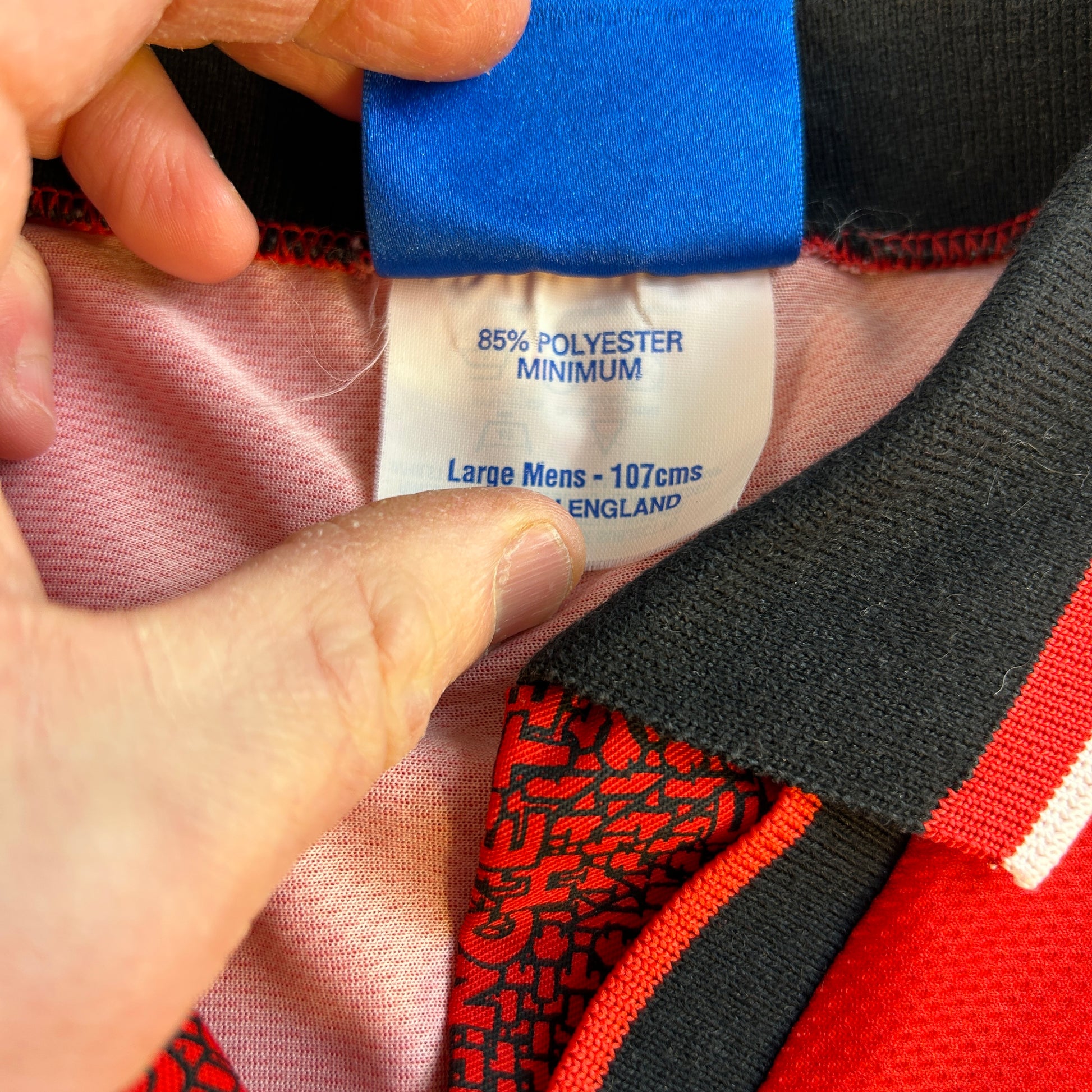 The home shirt for the 1994/1995 and 1995/1996 seasons. This shirt has Old Trafford incorporated in the design.
