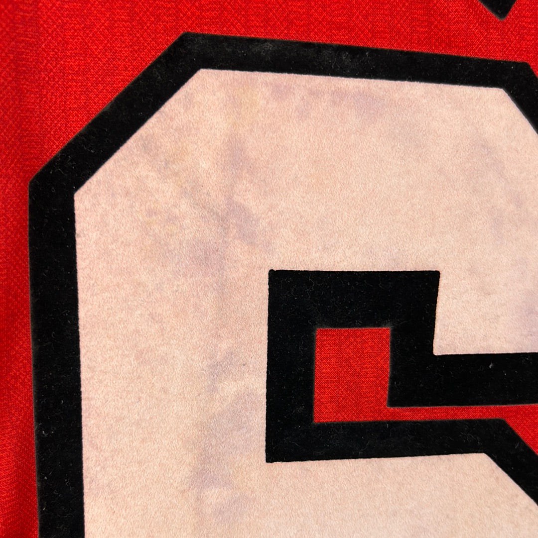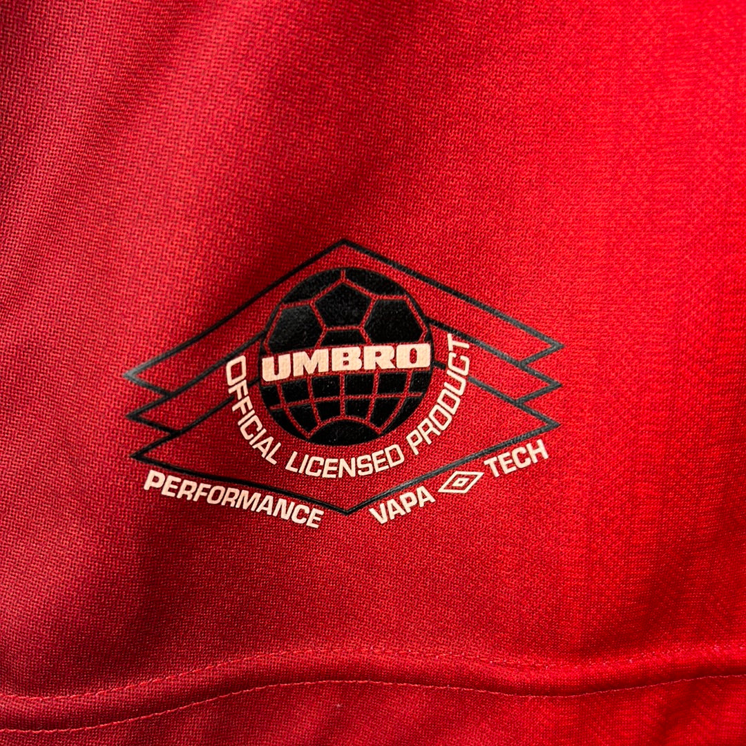Shirt info: The shirt has the sponsor and manufacturer as part of the material so they have no damage. The badge is embroidered on it. The shirt also features "Theatre of dreams" on the lower front. The only print on the shirt is the Umbro license which is in excellent condition.